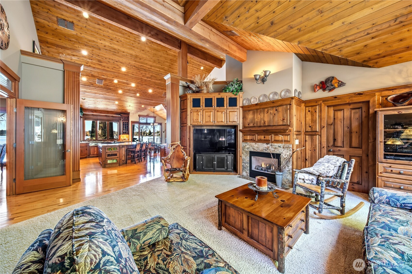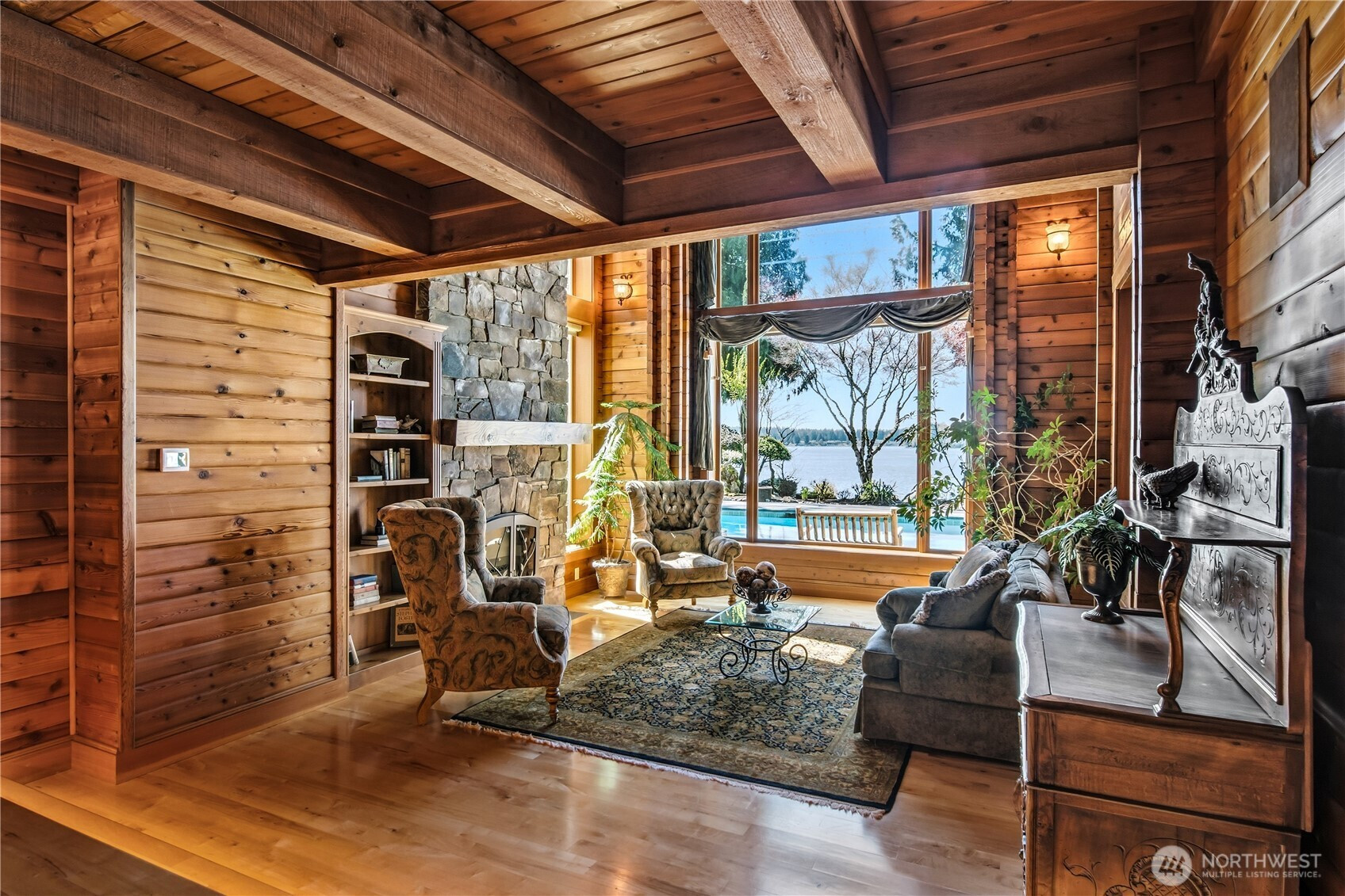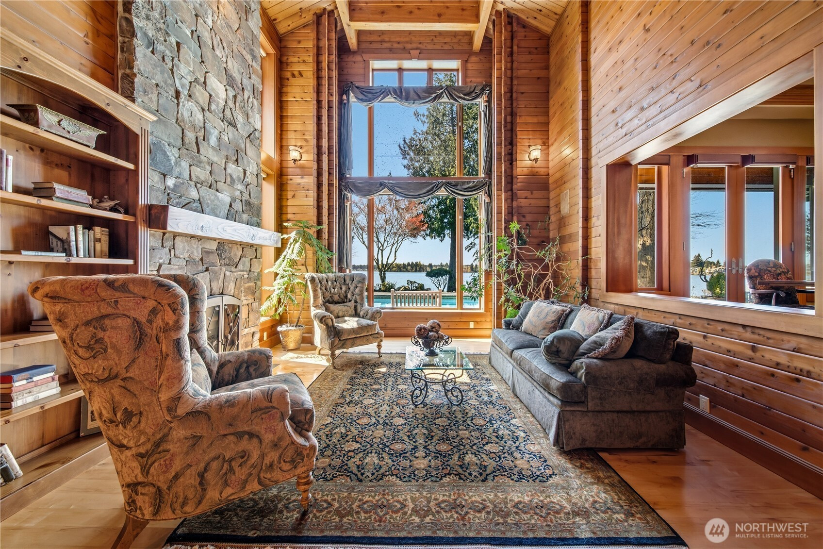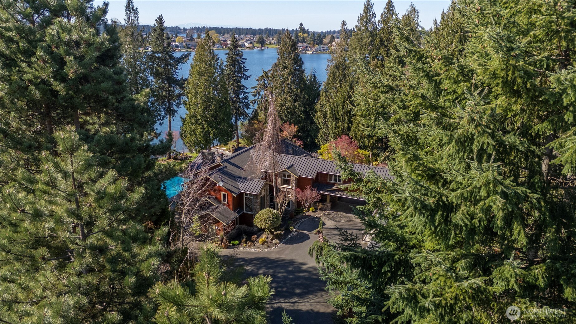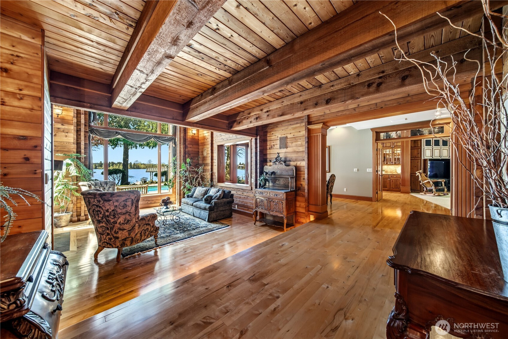 One of Lake Tapps’ most extraordinary waterfront estates, this rare Snag Island property offers 2.56 private acres with an incredible 290 feet of no-bank frontage and sweeping western-facing open water views. The impressive lodge-style residence spans over 7,000 square feet and showcases soaring two-story vaulted ceilings, rich wood and stone accents, and expansive windows framing breathtaking lake views throughout. Designed for both luxurious living and unforgettable entertaining, the home features 5 bedrooms, 4 bathrooms, an exercise room, and an oversized bonus room complete with a second kitchen—ideal for gatherings or extended living. The expansive chef’s kitchen overlooks the lake and flows seamlessly into the grand living spaces. Outdoors, the impeccably landscaped grounds create a resort-like retreat with an in-ground swimming pool, tranquil water features, and a covered outdoor BBQ area with fireplace for year-round entertaining. Additional highlights include five fireplaces, a massive 2,400 sq ft six-car attached garage with portico entry, and a 1,886 sq ft detached RV garage offering exceptional storage. Gated entry, abundant parking, private dead-end lane, covered dock slip with lift, and located within the highly sought-after Dieringer School District. Truly a one-of-a-kind property.