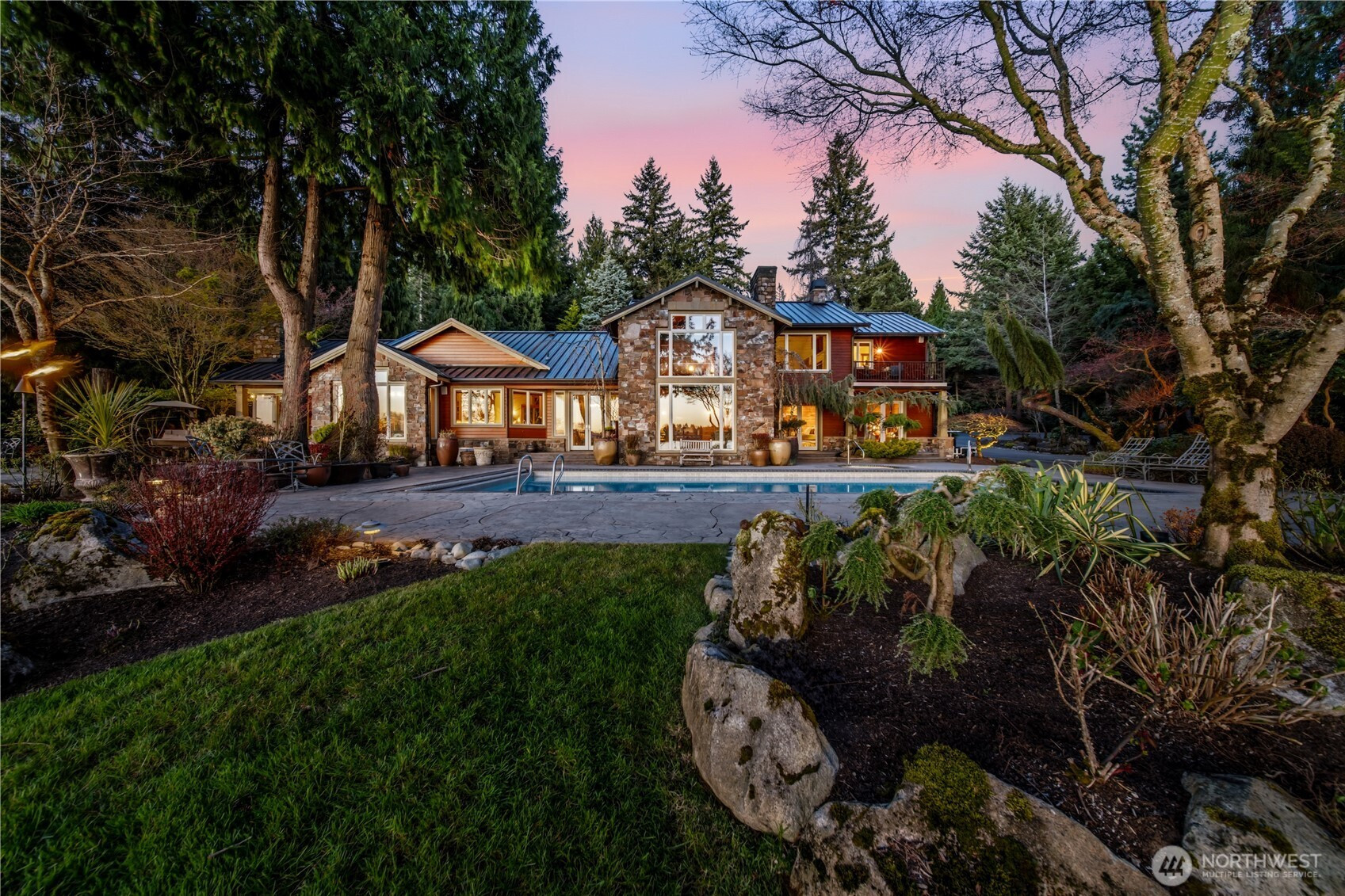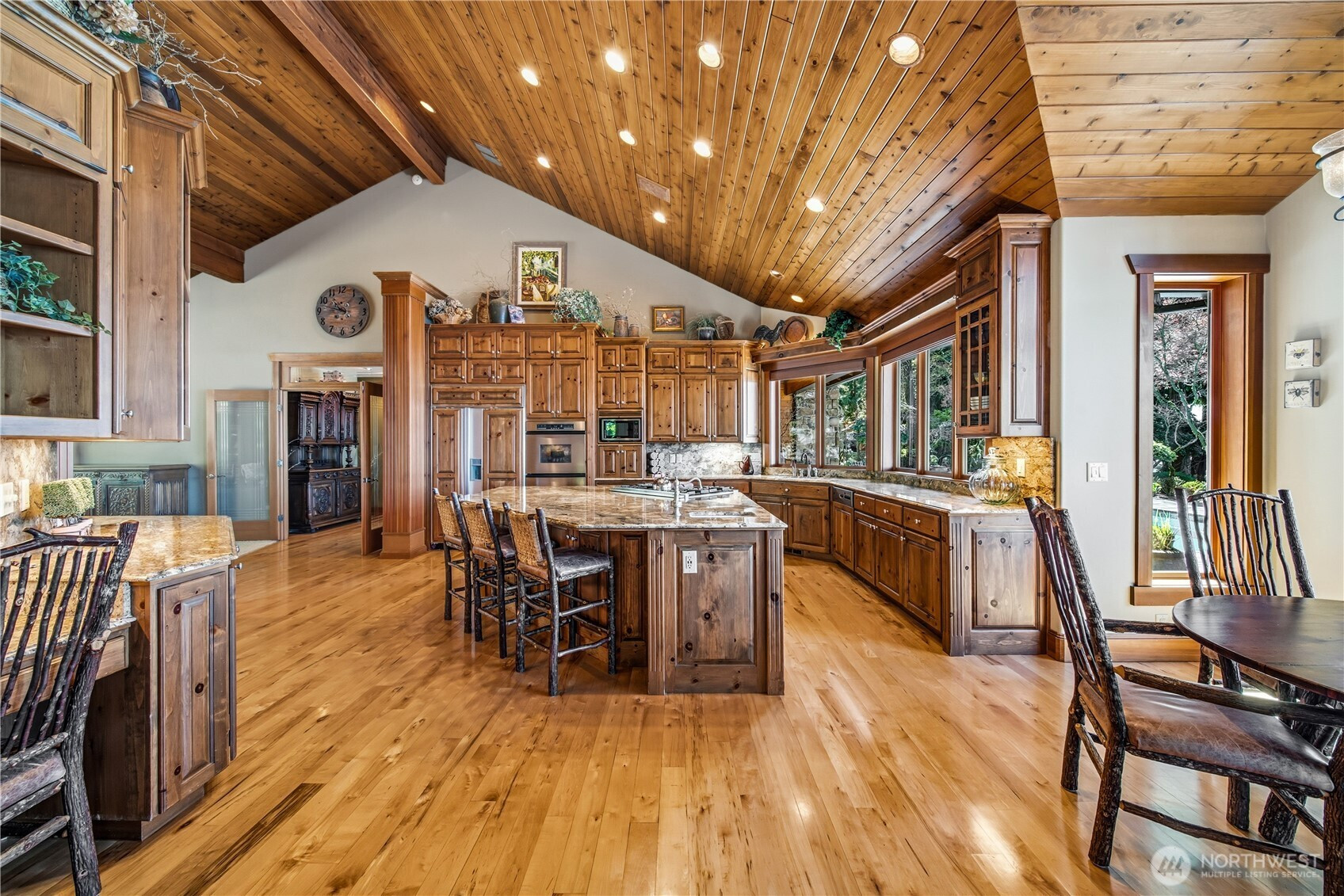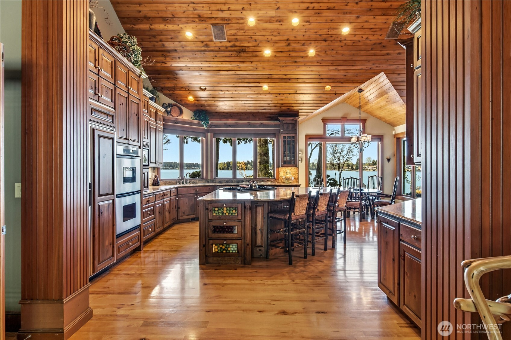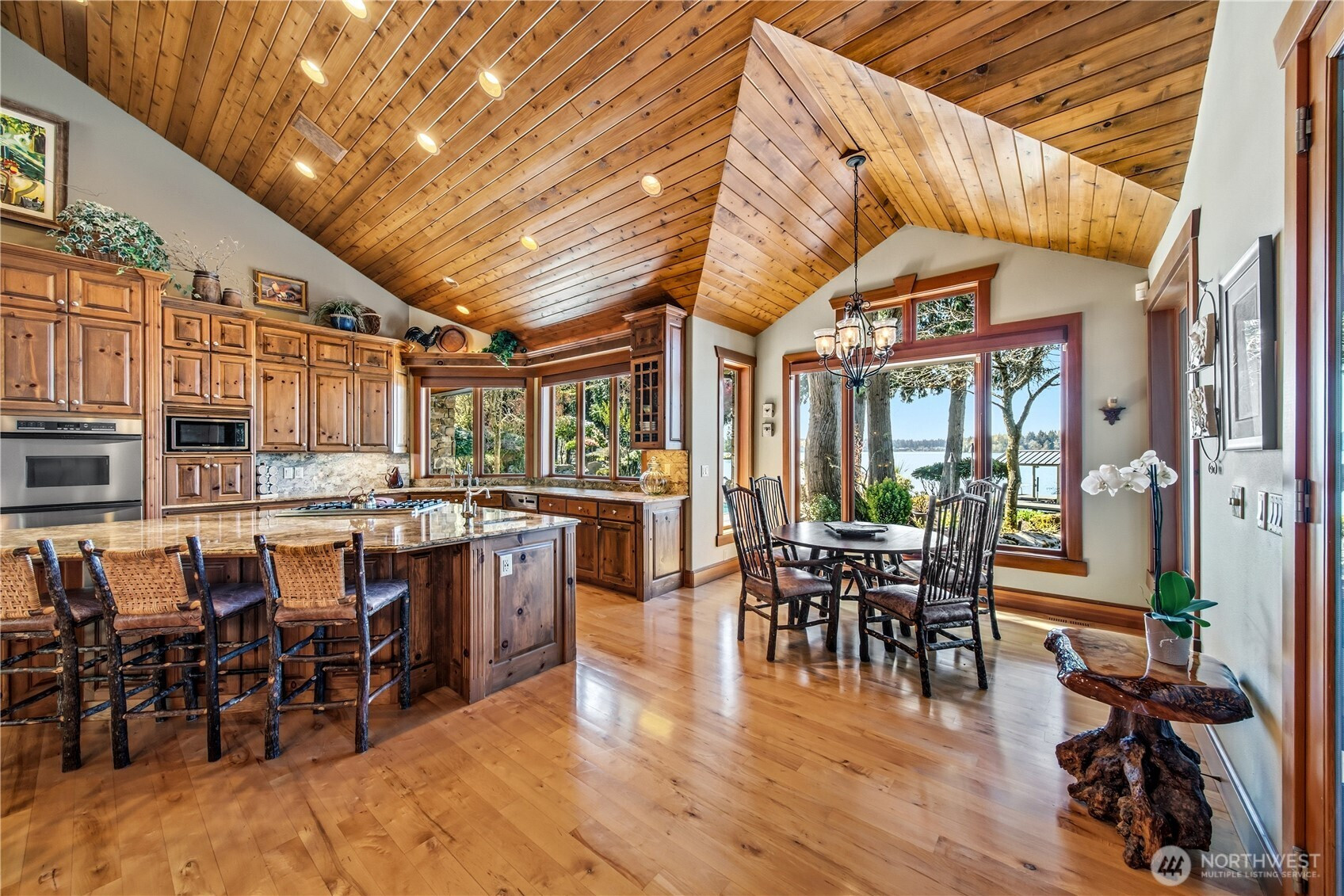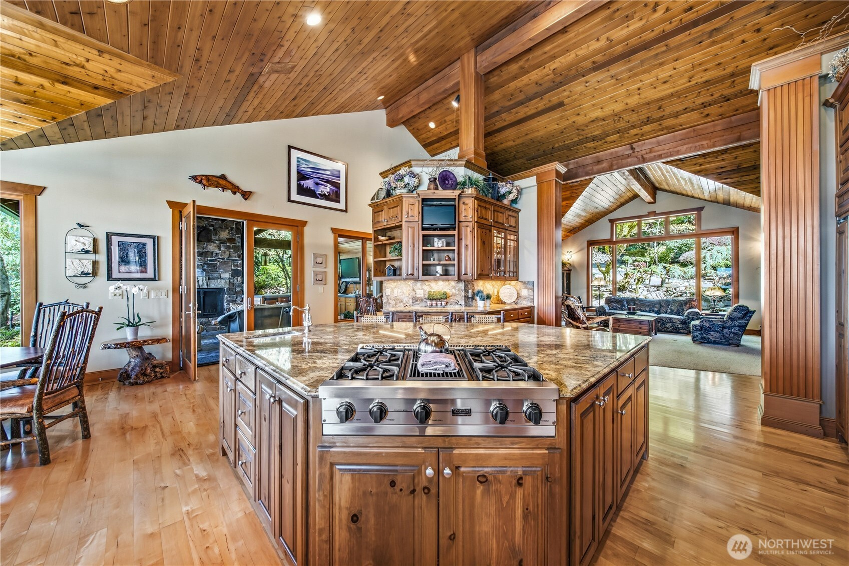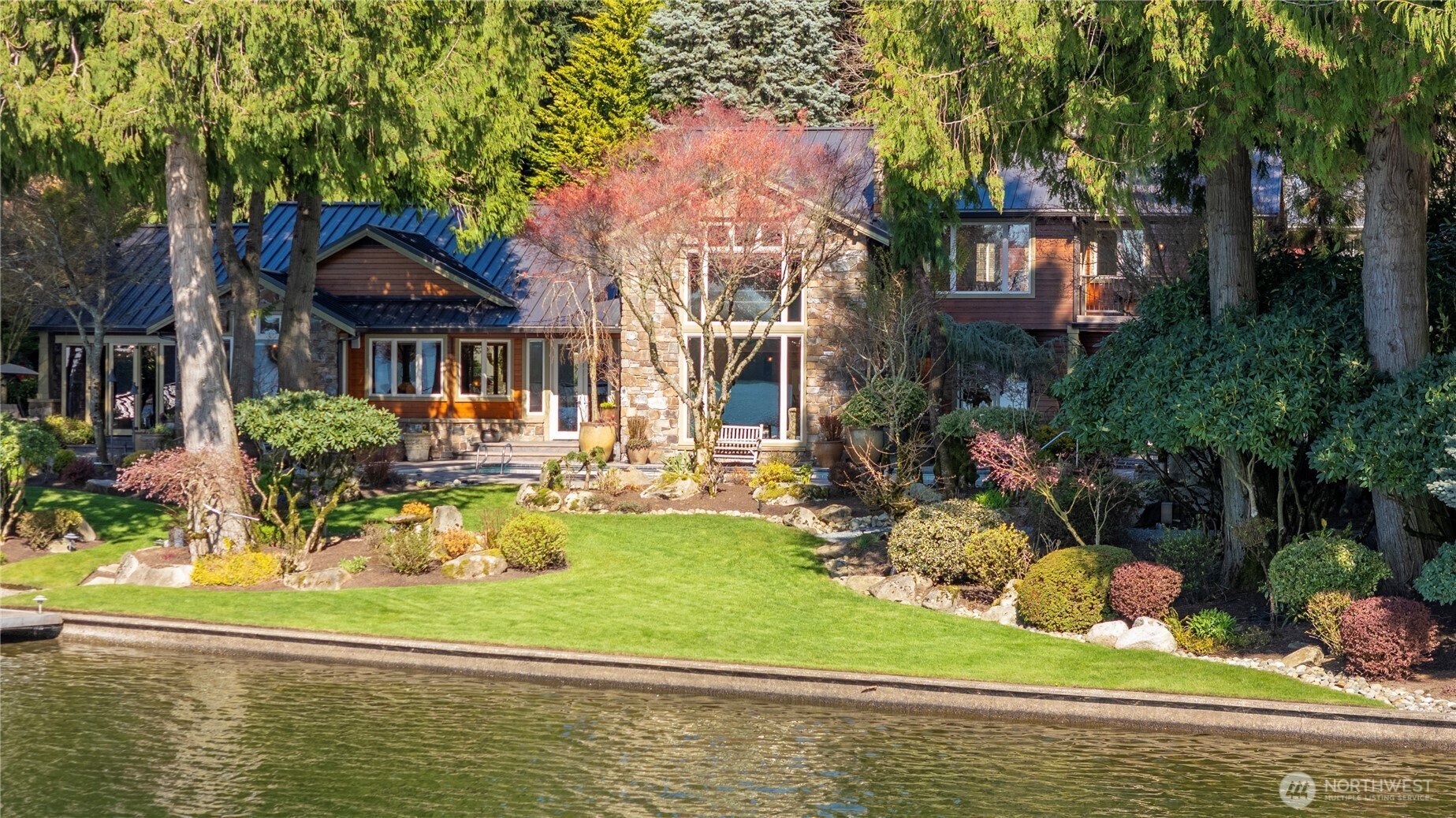 One of Lake Tapps’ most extraordinary waterfront estates, this rare Snag Island property offers 2.56 private acres with an incredible 290 feet of no-bank frontage and sweeping western-facing open water views. The impressive lodge-style residence spans over 7,000 square feet and showcases soaring two-story vaulted ceilings, rich wood and stone accents, and expansive windows framing breathtaking lake views throughout. Designed for both luxurious living and unforgettable entertaining, the home features 5 bedrooms, 4 bathrooms, an exercise room, and an oversized bonus room complete with a second kitchen—ideal for gatherings or extended living. The expansive chef’s kitchen overlooks the lake and flows seamlessly into the grand living spaces. Outdoors, the impeccably landscaped grounds create a resort-like retreat with an in-ground swimming pool, tranquil water features, and a covered outdoor BBQ area with fireplace for year-round entertaining. Additional highlights include five fireplaces, a massive 2,400 sq ft six-car attached garage with portico entry, and a 1,886 sq ft detached RV garage offering exceptional storage. Gated entry, abundant parking, private dead-end lane, covered dock slip with lift, and located within the highly sought-after Dieringer School District. Truly a one-of-a-kind property.