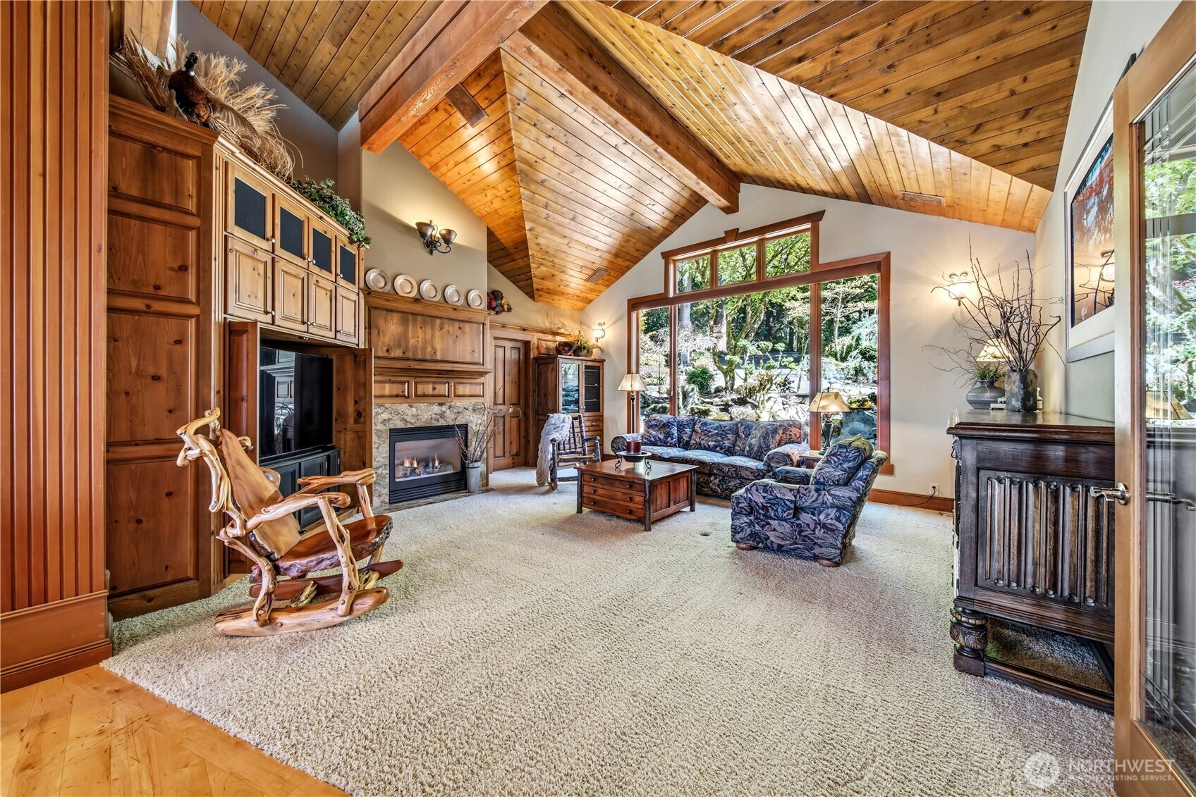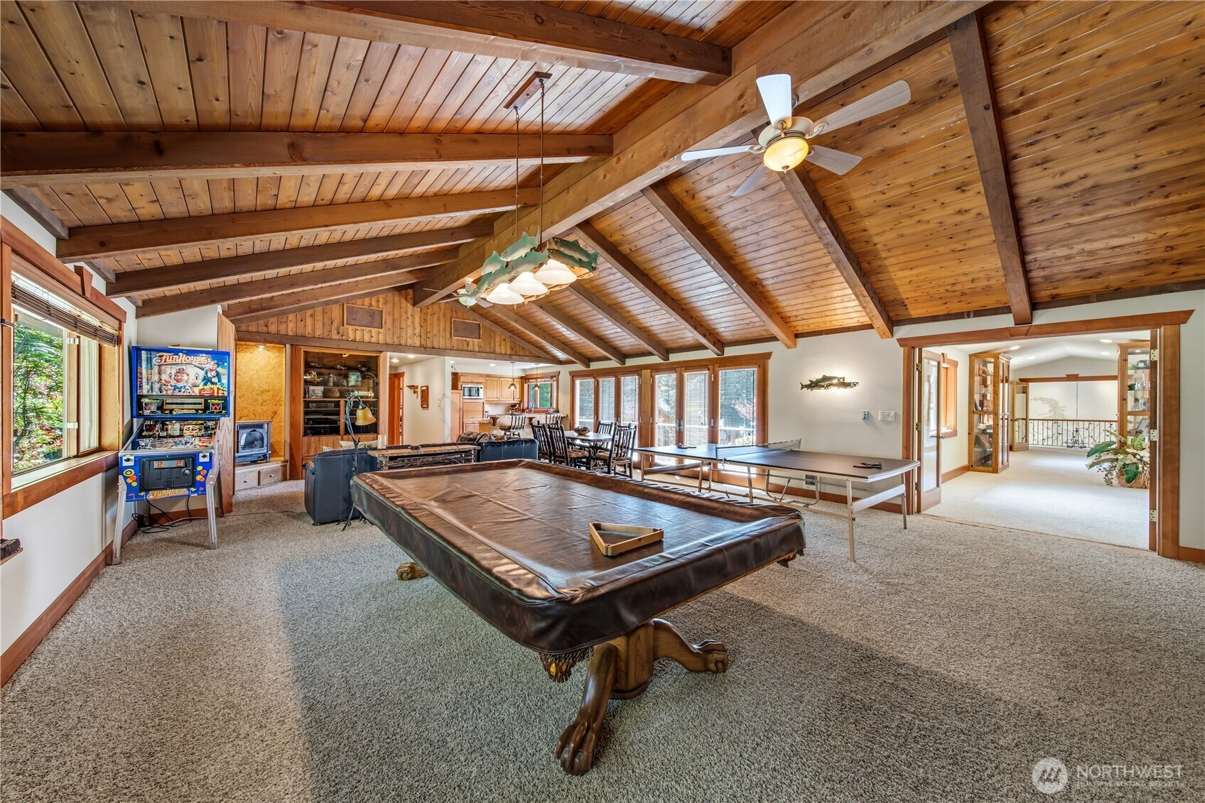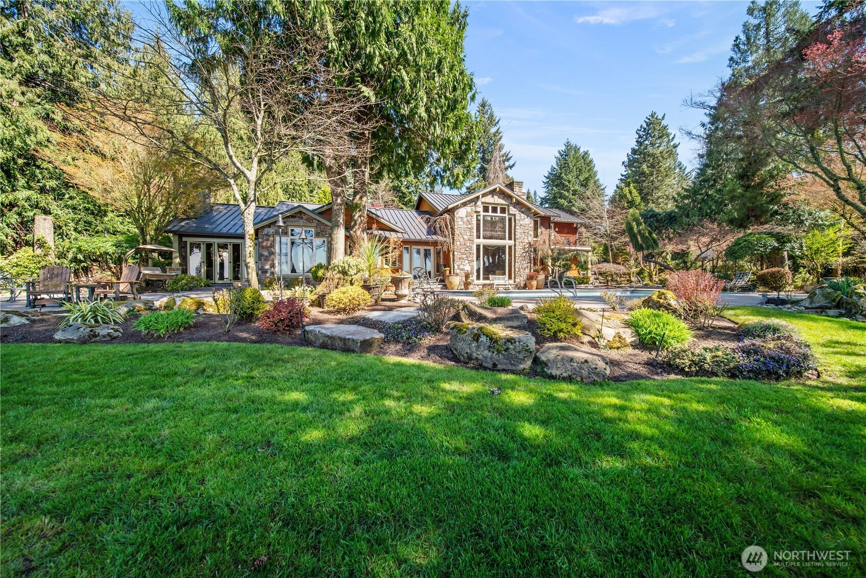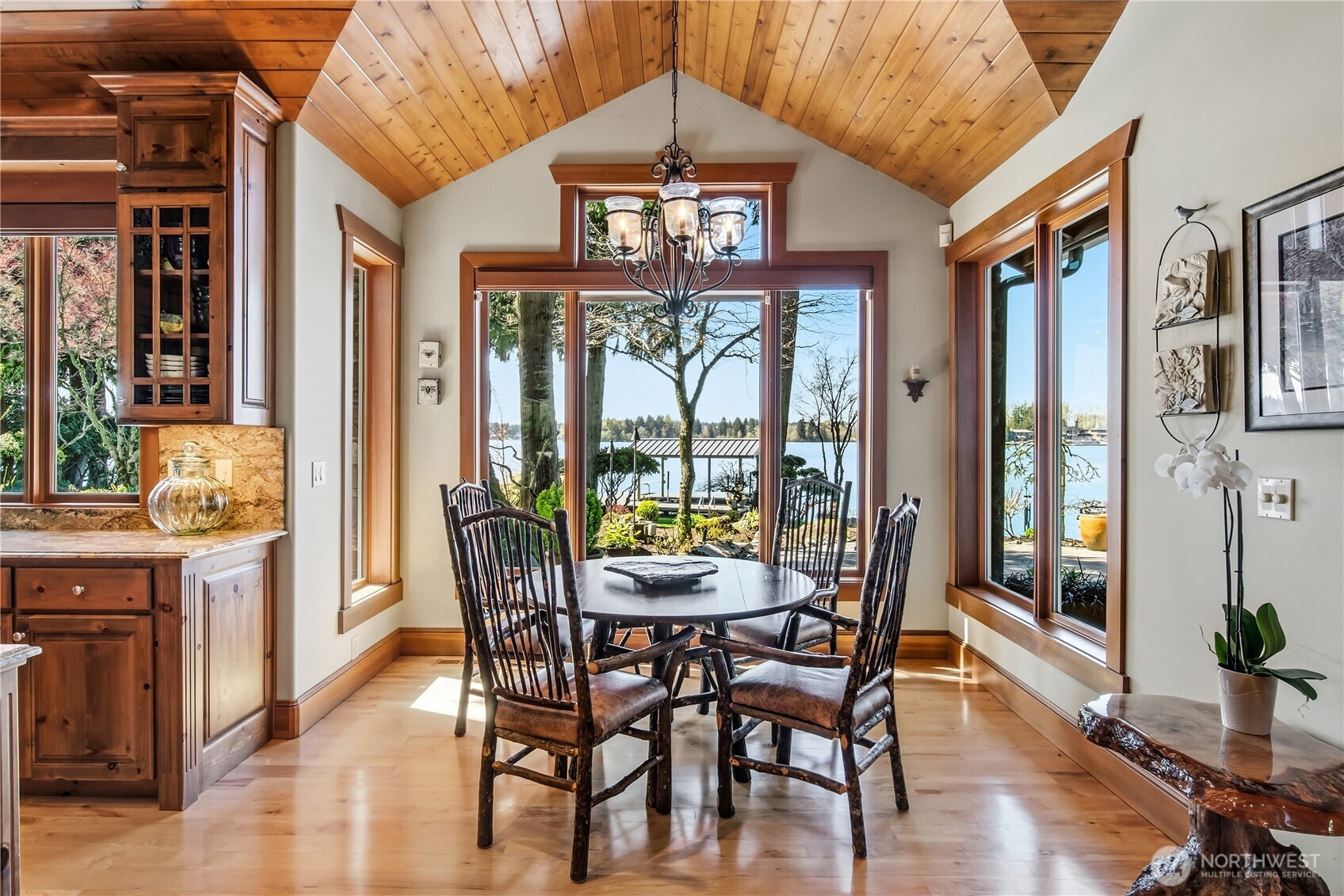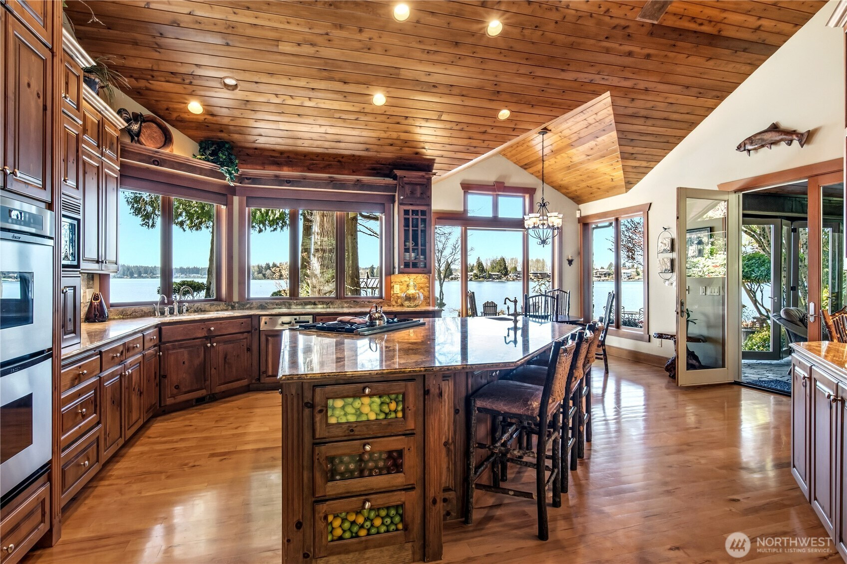 One of Lake Tapps’ most extraordinary waterfront estates, this rare Snag Island property offers 2.56 private acres with an incredible 290 feet of no-bank frontage and sweeping western-facing open water views. The impressive lodge-style residence spans over 7,000 square feet and showcases soaring two-story vaulted ceilings, rich wood and stone accents, and expansive windows framing breathtaking lake views throughout. Designed for both luxurious living and unforgettable entertaining, the home features 5 bedrooms, 4 bathrooms, an exercise room, and an oversized bonus room complete with a second kitchen—ideal for gatherings or extended living. The expansive chef’s kitchen overlooks the lake and flows seamlessly into the grand living spaces. Outdoors, the impeccably landscaped grounds create a resort-like retreat with an in-ground swimming pool, tranquil water features, and a covered outdoor BBQ area with fireplace for year-round entertaining. Additional highlights include five fireplaces, a massive 2,400 sq ft six-car attached garage with portico entry, and a 1,886 sq ft detached RV garage offering exceptional storage. Gated entry, abundant parking, private dead-end lane, covered dock slip with lift, and located within the highly sought-after Dieringer School District. Truly a one-of-a-kind property.
