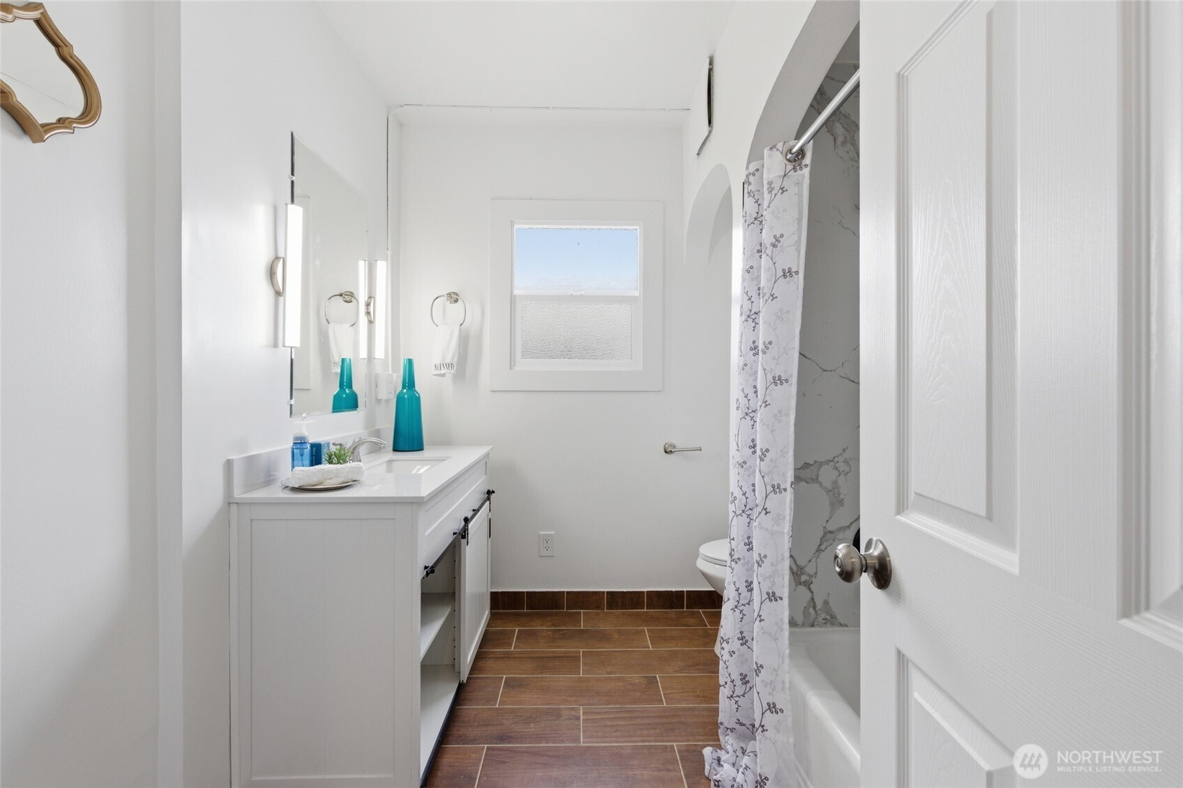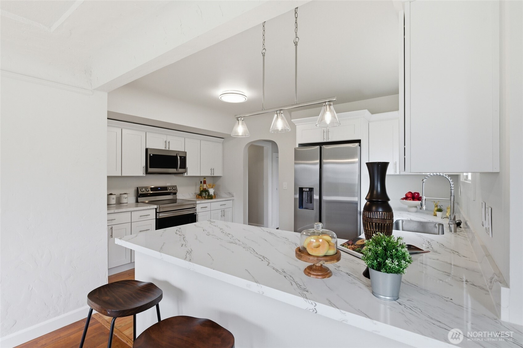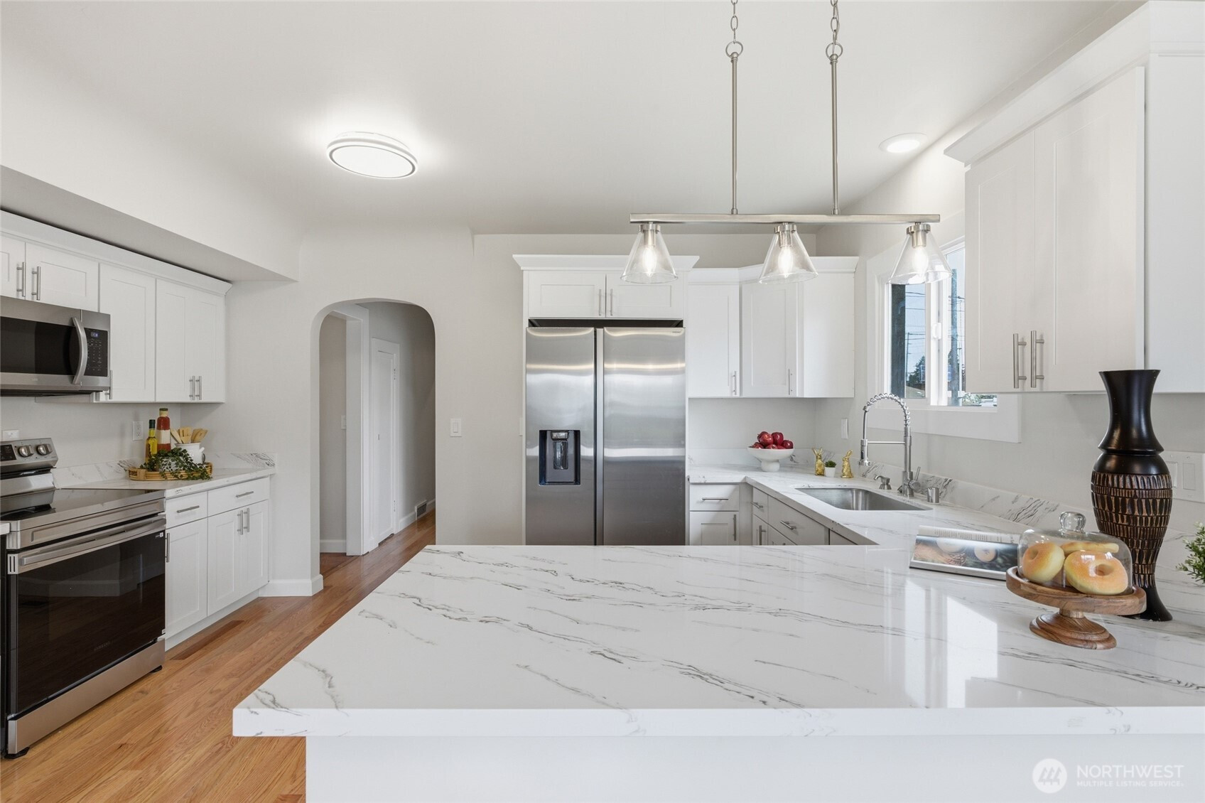 Experience the unique charm of this remodeled 3-bed, 1.5-bath Art Deco-style residence in SE Tacoma. This 1,424 sq ft single-story home features signature Southwest architecture, including a stucco exterior and soft arches throughout the interior. The home has been fully updated with a new kitchen featuring new cabinetry and countertops, alongside refreshed bathrooms with new vanities, showers, toilets, and sinks. Highlights include original flooring, fresh interior and exterior paint, built-in storage cabinets, and landscaped grounds. The layout provides an open feel with large windows and includes an unfinished basement for additional potential. An attached one-car garage offers extra storage space and presents an opportunity for future improvements. This property combines distinct architectural character with modern interior updates in a functional, well-maintained package.