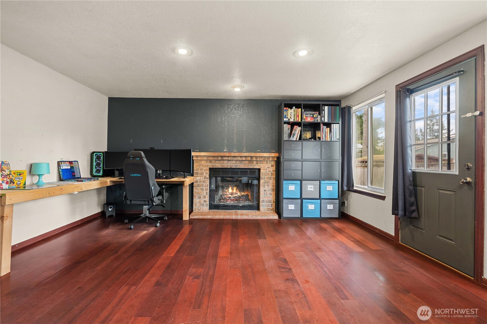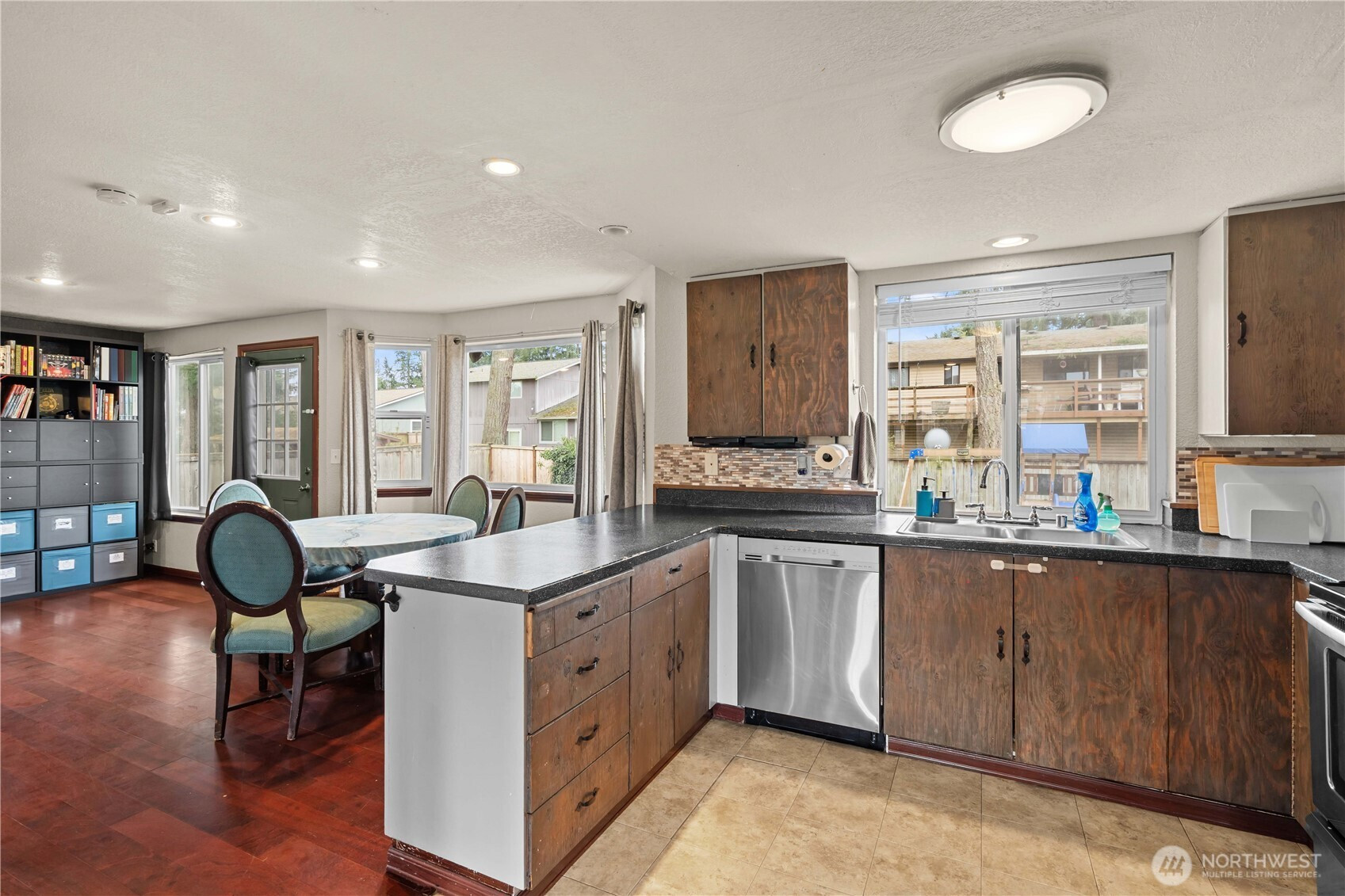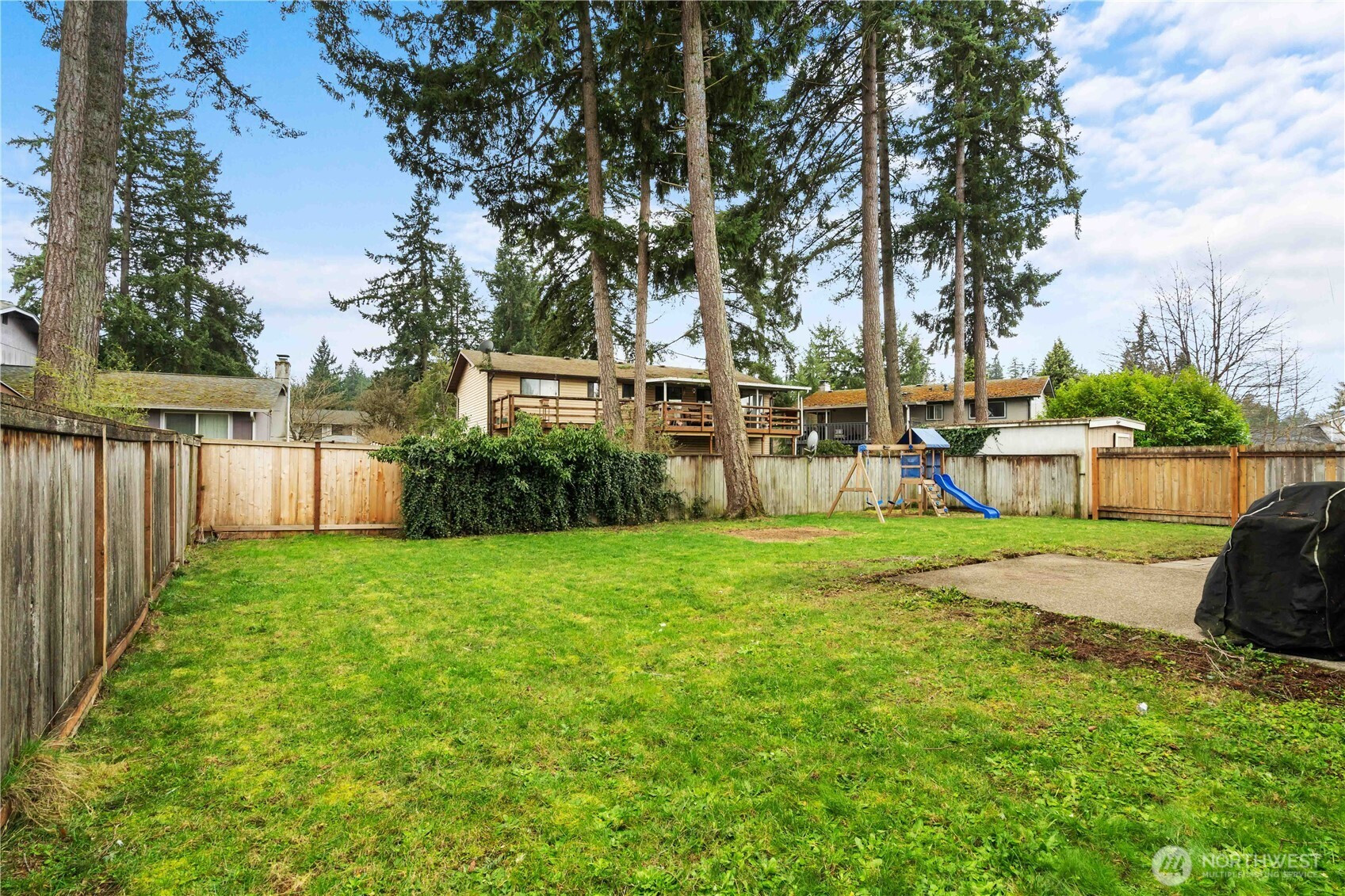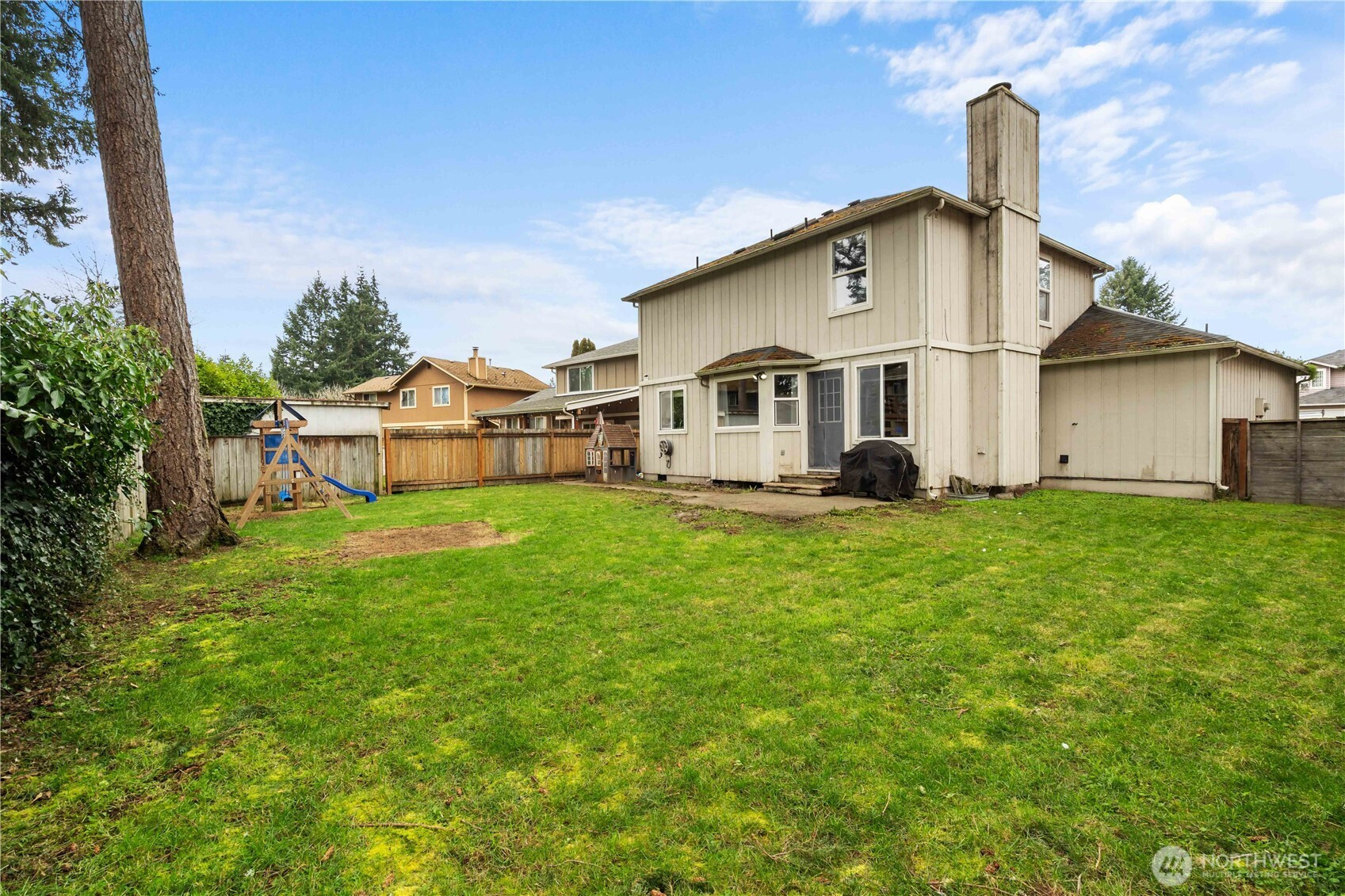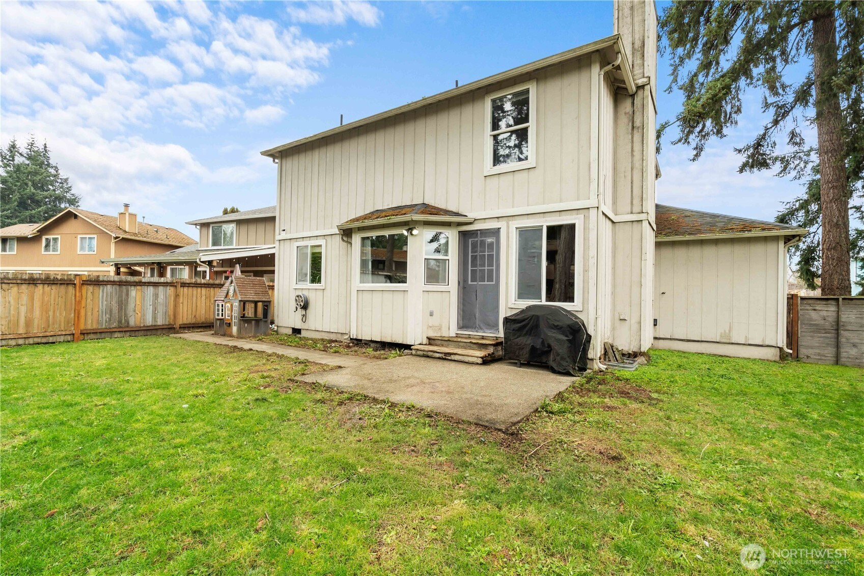 Located on a quiet cul de sac, this 3 bedroom, 2.5 bath home sits on a spacious lot with a large driveway and fully fenced backyard. The home offers a functional layout with comfortable living spaces, a cozy wood burning fireplace, and a kitchen featuring stainless steel appliances and plenty of cabinet storage. The primary suite includes double sinks and generous closet space, while additional bedrooms provide flexibility for guests, office space, or hobbies. The backyard patio creates a great space for outdoor enjoyment. A solid opportunity for buyers looking to bring their own updates and build equity while enjoying the space, lot size, and convenient location near schools, parks, shopping, and JBLM.