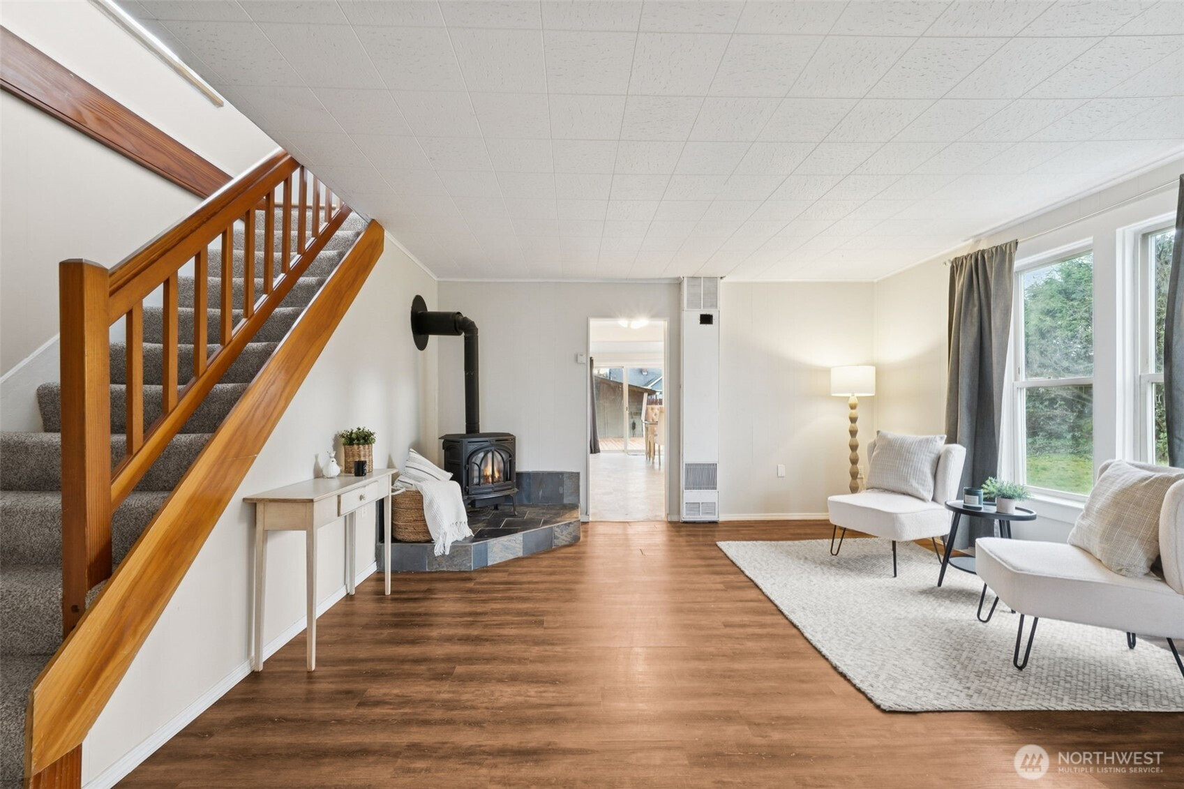 Discover the charm of this beautifully updated Craftsman in the heart of downtown Buckley! Step into a classic kitchen & dining area that flows seamlessly into a spacious living room featuring a freestanding stove with a slate surround. Enjoy laminate wood flooring & brand-new carpet for added comfort. The upper level offers a generous primary bedroom with dual closets & recessed lighting. Recent upgrades include refreshed bathrooms, updated flooring, modern fixtures, an upgraded electrical panel, & fresh interior paint. Entertain on the expansive deck with built-in benches. One car garage and shop space. Additional alley parking provides room for all your toys, too! This Buckley gem is ready to welcome you home.