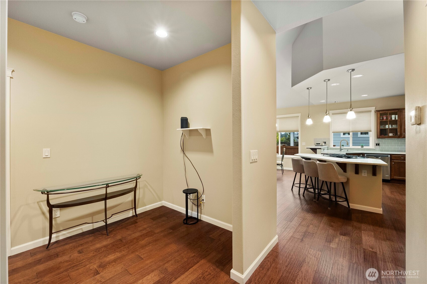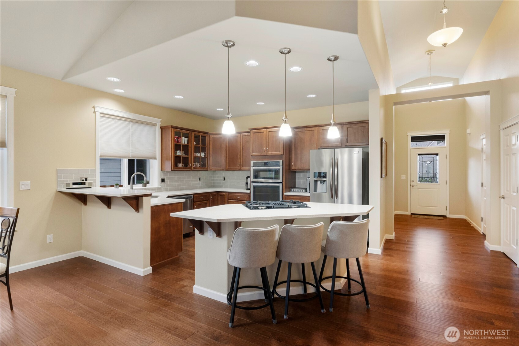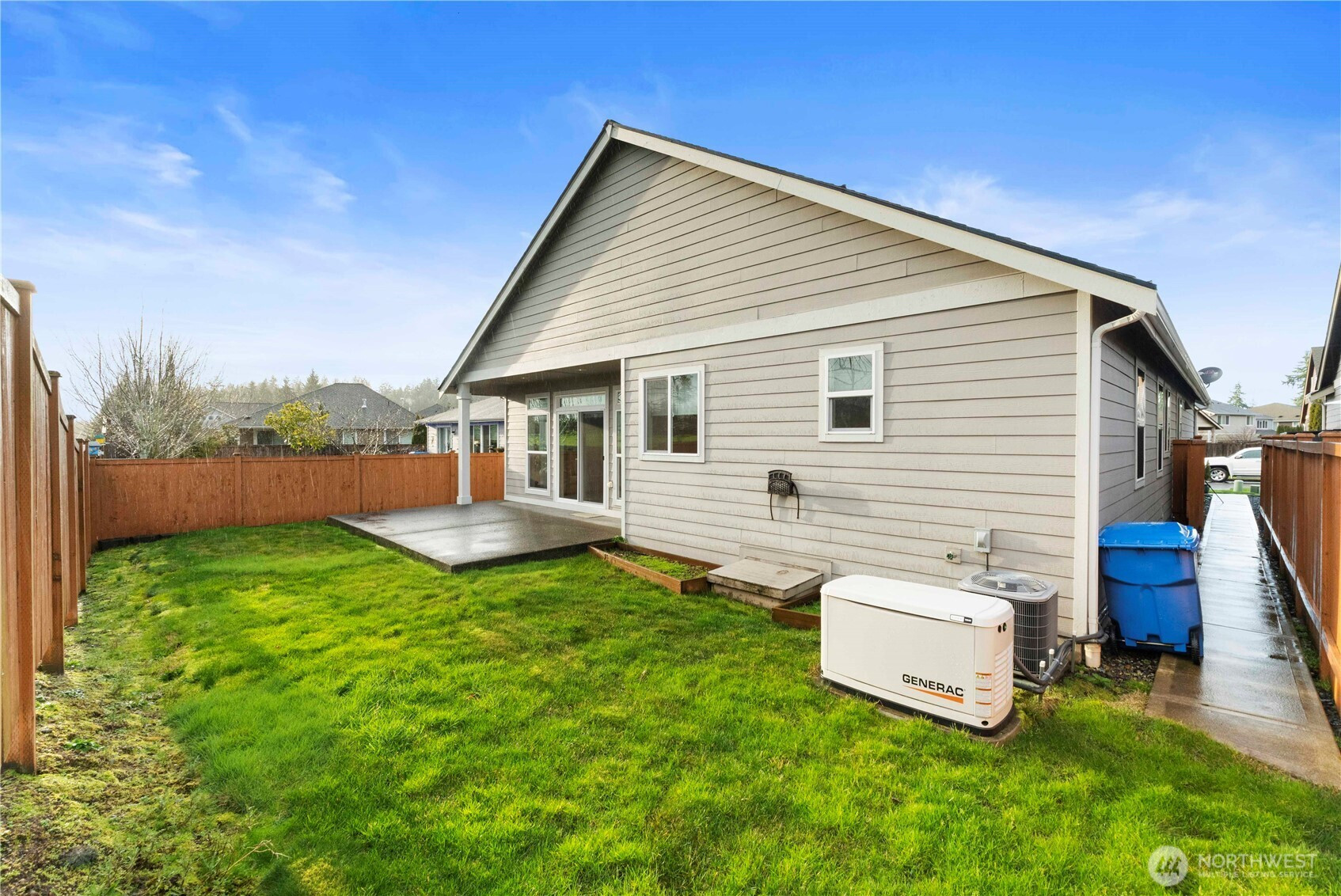 Welcome home! This one level rambler is the one you have been looking for. Walk in to beautiful hardwood floors through the entry and great room. Wonderful kitchen with quartz countertops, island with room for sitting at, stainless steel appliances, beautiful cabinetry. Great room has room for dining table and space to relax and watch TV or enjoy the cozy gas fireplace. Great interior paint color that gives you a comfortable feeling that your at home. Large primary bedroom with private bathroom with soaking tub, shower and tile floors with quartz countertops, and walk in closet. Second bedroom has plenty of space and convenient to guest bathroom with quartz countertops and tile floors as well. Separate laundry room and all appliances stay. Office/den is large, and a closet was originally in the plans but owners chose to not have one installed, tax records show 3 bedroom, install a closet to make it a bedroom. Step outside to a large semi covered patio with your view of Mount Rainier. Entire yard has sprinkler system. This home comes with A/C and a Generac Generator, so you never have to worry about losing power! Great location close to mall, shopping, and quick access to freeways.