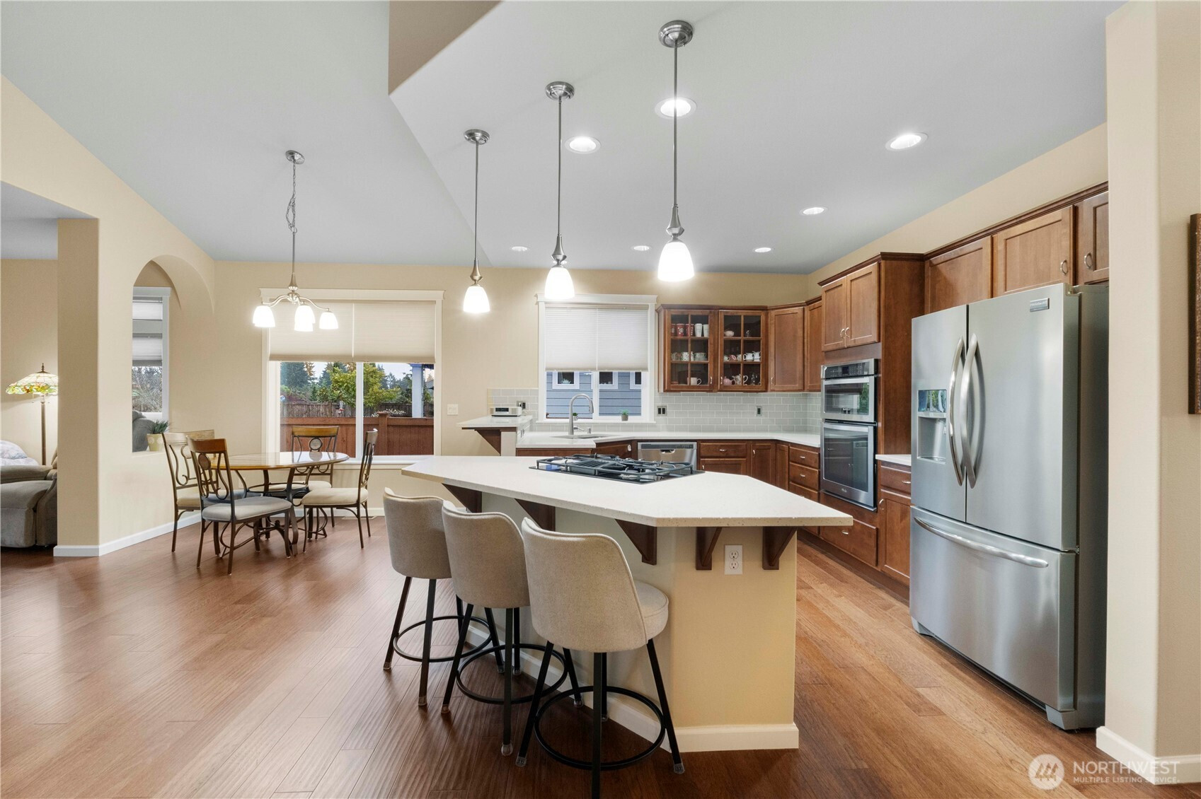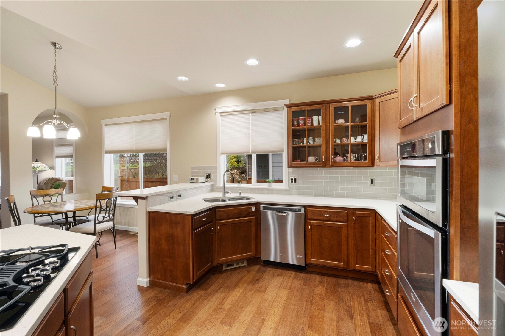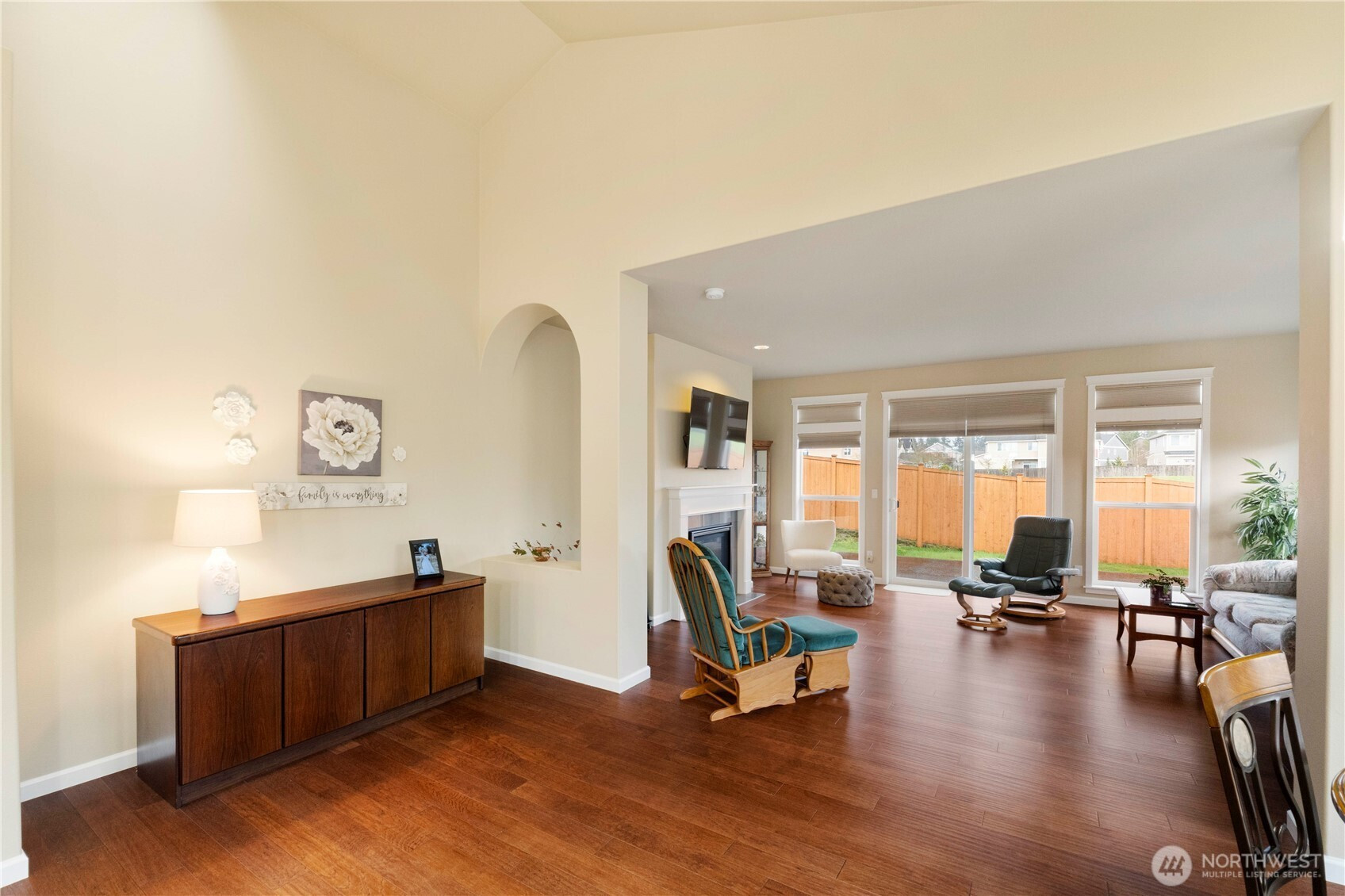 Welcome home! This one level rambler is the one you have been looking for. Walk in to beautiful hardwood floors through the entry and great room. Wonderful kitchen with quartz countertops, island with room for sitting at, stainless steel appliances, beautiful cabinetry. Great room has room for dining table and space to relax and watch TV or enjoy the cozy gas fireplace. Great interior paint color that gives you a comfortable feeling that your at home. Large primary bedroom with private bathroom with soaking tub, shower and tile floors with quartz countertops, and walk in closet. Second bedroom has plenty of space and convenient to guest bathroom with quartz countertops and tile floors as well. Separate laundry room and all appliances stay. Office/den is large, and a closet was originally in the plans but owners chose to not have one installed, tax records show 3 bedroom, install a closet to make it a bedroom. Step outside to a large semi covered patio with your view of Mount Rainier. Entire yard has sprinkler system. This home comes with A/C and a Generac Generator, so you never have to worry about losing power! Great location close to mall, shopping, and quick access to freeways.