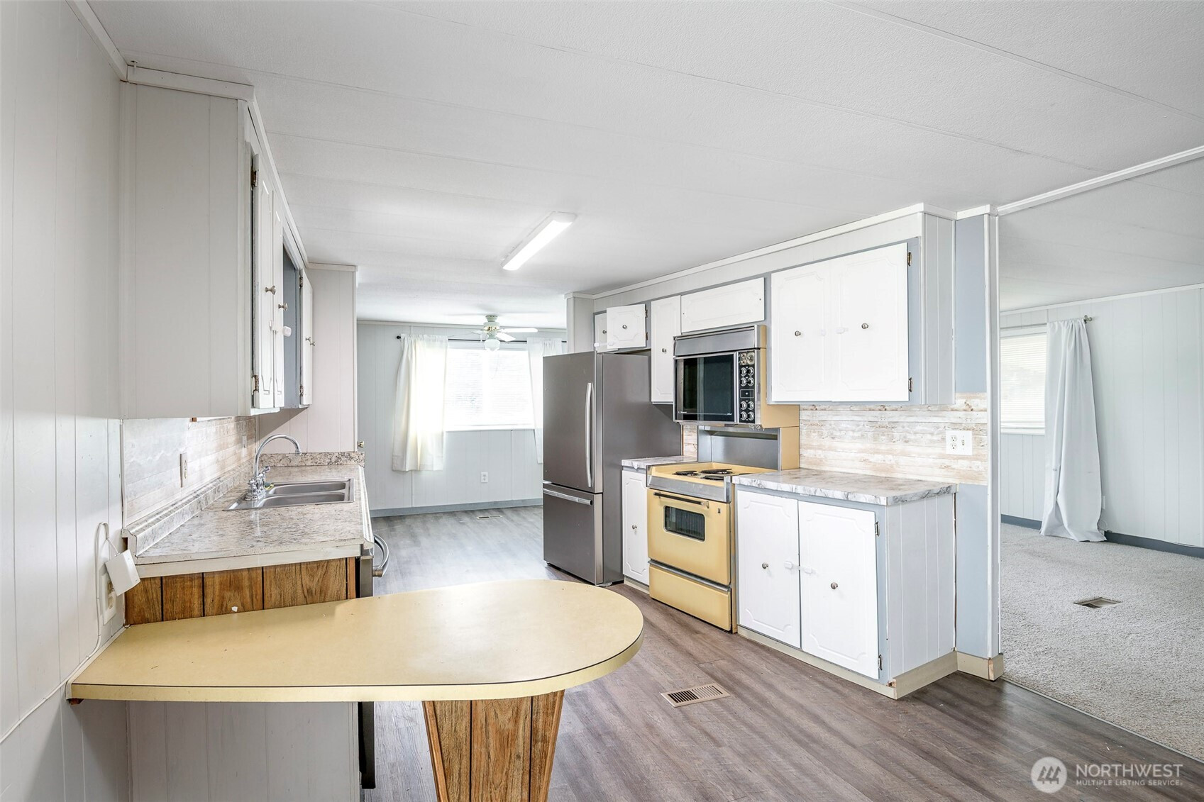 Come see this manufactured home on a huge lot! The cul-de-sac and neighborhood have a park-like setting. The living room offers freshly cleaned carpets and large windows for lots of natural lighting. The living room flows into the dining area with custom built-in shelving and cabinetry for extra storage space. The kitchen features white cabinetry, a peninsula with additional eating space and a slider to the back deck. Conveniently located washer and dryer just off the kitchen. The primary suite has its own private access to the deck and a 3/4 en suite with walk-in shower. Two additional bedrooms plus a full bath with large soaker tub. Attached carport has a shed for extra storage. Front and back decks are fully covered and overlook the fully fenced lawn!