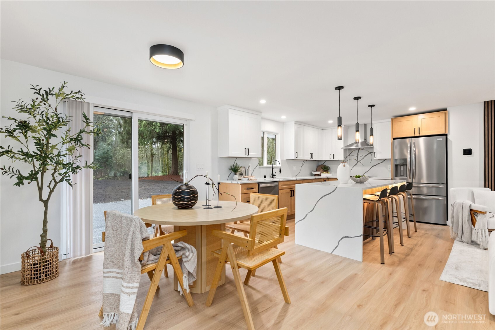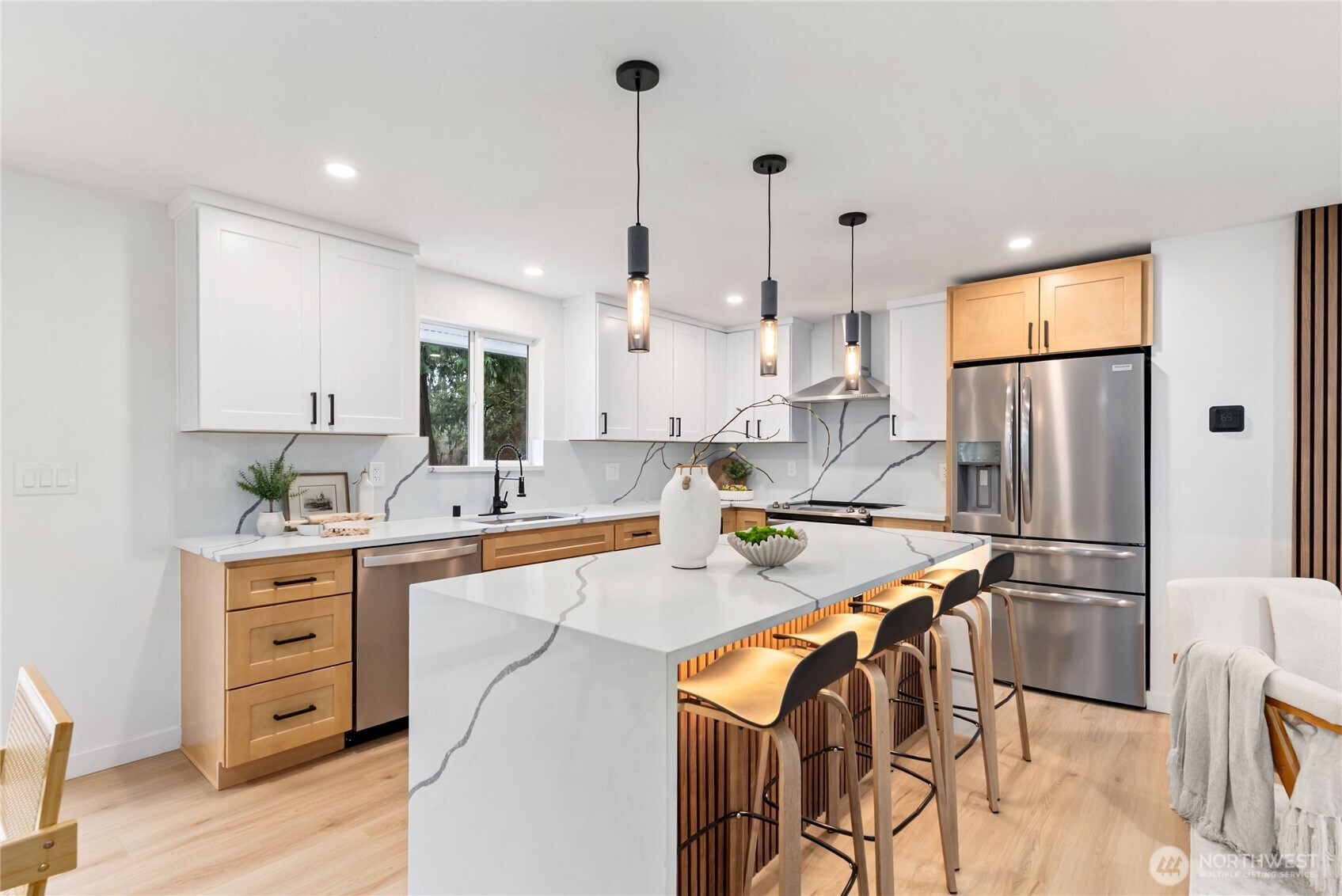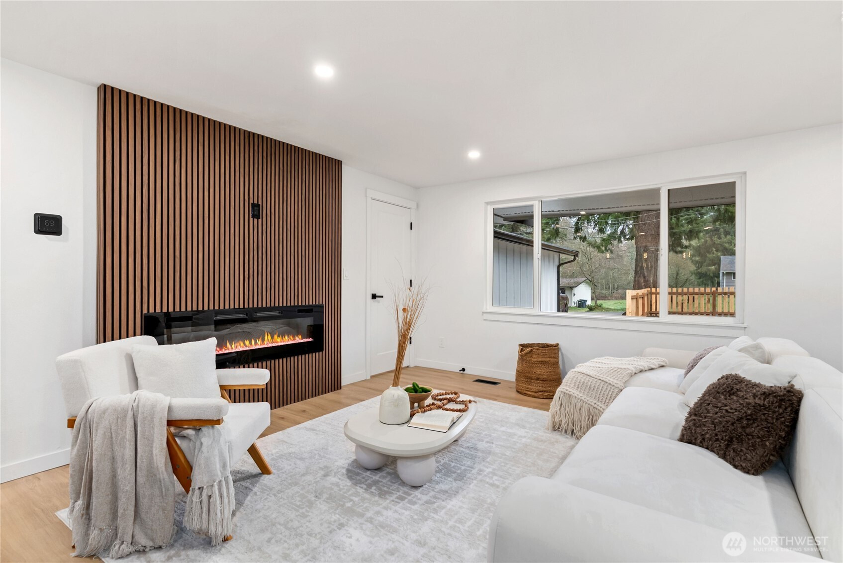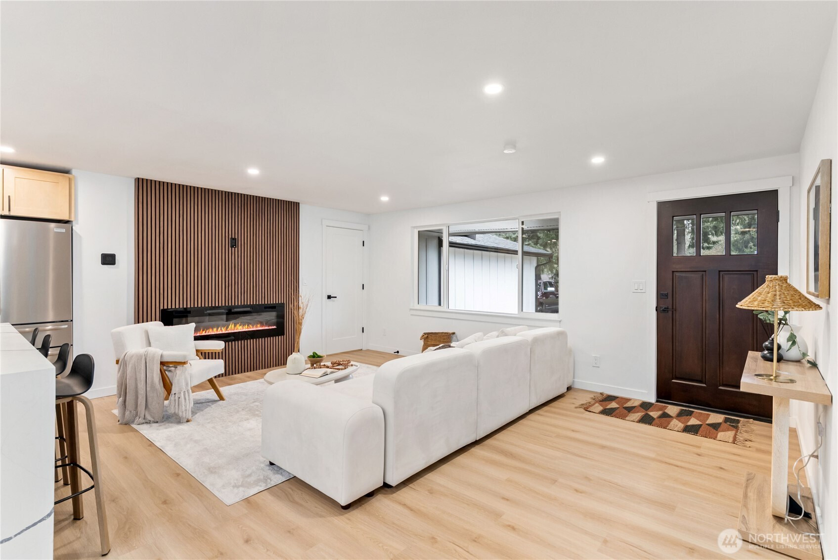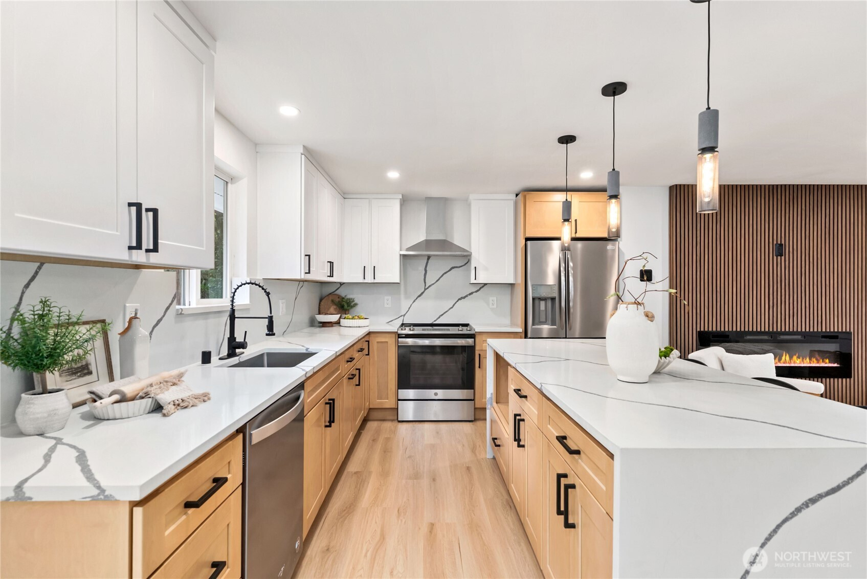 Thoughtfully remodeled Summit-area rambler offering refined design and true turn-key living. From the moment you enter, you are welcomed into an open-concept living space highlighted by a custom accent wall and sleek electric fireplace, creating a warm yet sophisticated atmosphere.The chef’s kitchen is a showstopper, featuring stainless steel appliances, elegant two-tone cabinetry, quartz countertops, and a full quartz backsplash for effortless maintenance. A dramatic island with dual waterfall edges and motion-activated under-island lighting anchors the space and invites gathering. The oversized laundry room provides convenience and generous storage. The private primary suite is a serene retreat with a walk-in closet and designer accent walls. The spa-inspired primary bath offers a luxurious soaking tub with niche lighting, double vanity, private bathroom, and a stunning custom walk-in shower. Three additional bedrooms are thoughtfully positioned on the opposite side of the home, offering privacy and flexibility for guests, office, or lifestyle needs. Outdoors, enjoy peace of mind with a brand-new roof, partially fenced yard, RV parking, and a spacious patio overlooking a large backyard—perfect for entertaining, relaxing, or future outdoor living dreams. This home blends style, comfort, and functionality in a sought-after Summit location. Must See!