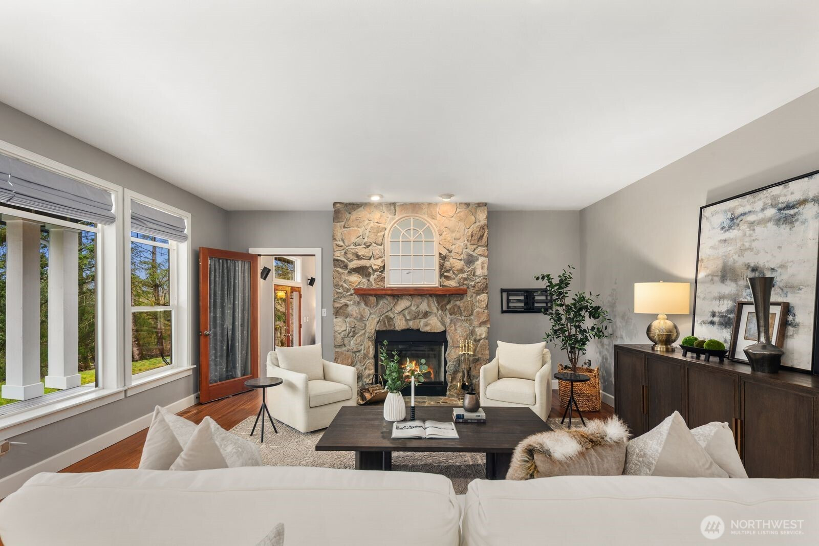 Tucked inside Blacktail Ridge, an enclave of custom homes on 5+ acre parcels, this quality-built retreat delivers the privacy you crave without feeling remote. Set on 5 wooded acres with old-growth evergreens, daily wildlife visitors, and a peaceful pace of life—yet still within reach of Bonney Lake, Tacoma, and Seattle. Inside, enjoy 4,028 sq ft of light-filled living with all-new interior paint, hardwood floors throughout, and floor-to-ceiling windows that bring the outdoors in. The kitchen is built for real hosting—granite counters, solid wood cabinetry, a commercial-grade gas range, oversized island, and abundant storage—all flowing directly into the heart of the home: a warm, inviting living room anchored by a wood-burning fireplace. From there, the main level expands into the spaces buyers are craving right now: a dedicated office, formal living room, generous dining room, and a huge bonus room with endless flexibility. Upstairs, unwind in the primary suite with its own fireplace, private balcony, walk-in closet, and a truly impressive spa bath. 3 additional bedrooms feature oversized layouts and walk-in closets, plus a large mudroom for everyday function. For the hobbies, toys, and future plans: an attached 3 car garage + an additional 1,200 sq. ft. detached, powered 3-bay shop with unfinished space above ready to be transformed. Starlink available for modern connectivity. A rare blend of refined interiors, true acreage privacy, and commuter-friendly convenience.