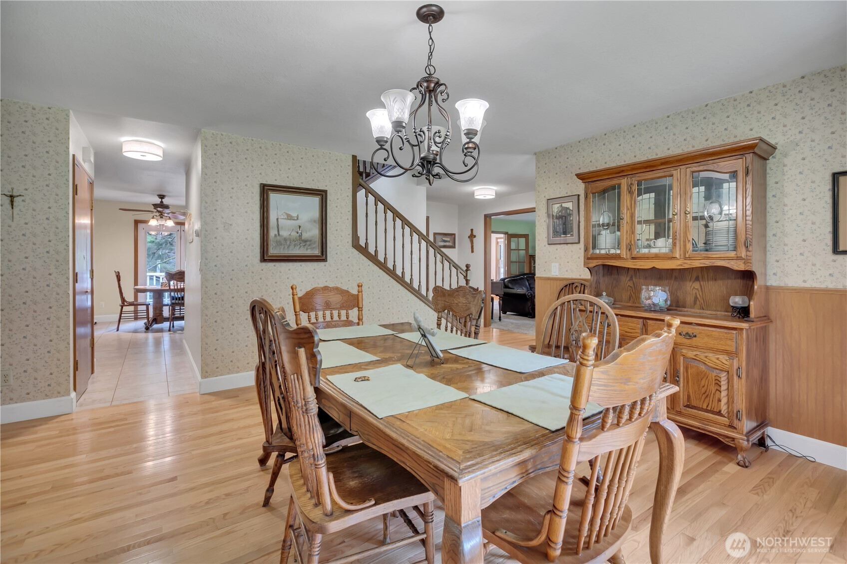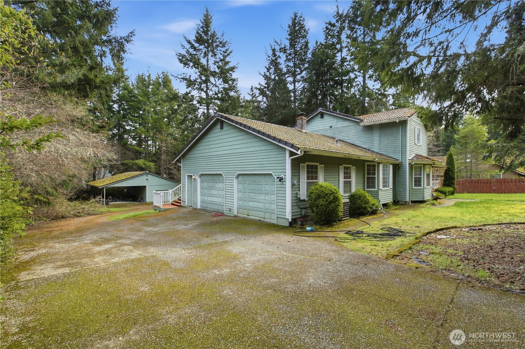 Set on a private acre lot, this spacious 2-story home with a finished basement offers versatile living for entertainers. The basement features a flex room, rec area, storage, and setup for a third wood stove (brick), perfect for cozy evenings or hosting guests. The main level includes a chef’s island kitchen with stove/oven, separate oven, convection microwave, and breakfast nook, along with a family room, dining area, full guest bath, and den/office with French doors. Upstairs, the primary suite boasts a private ensuite, accompanied by three guest bedrooms and a full guest bath. RV enthusiasts will enjoy the 40x40 detached carport and shop with RV parking and septic dump. Additional highlights include an attached garage and covered wrap-around deck leading to a two-tier open deck. Nestled on a secluded lot, this home offers privacy, outdoor living, and modern comfort—all wired for a security system (not in use). The home and detached garage/carport are equipped with Ring cameras, and the deck features a gas hookup ready for your BBQ. A perfect blend of style, functionality, and endless possibilities for living and entertaining.
