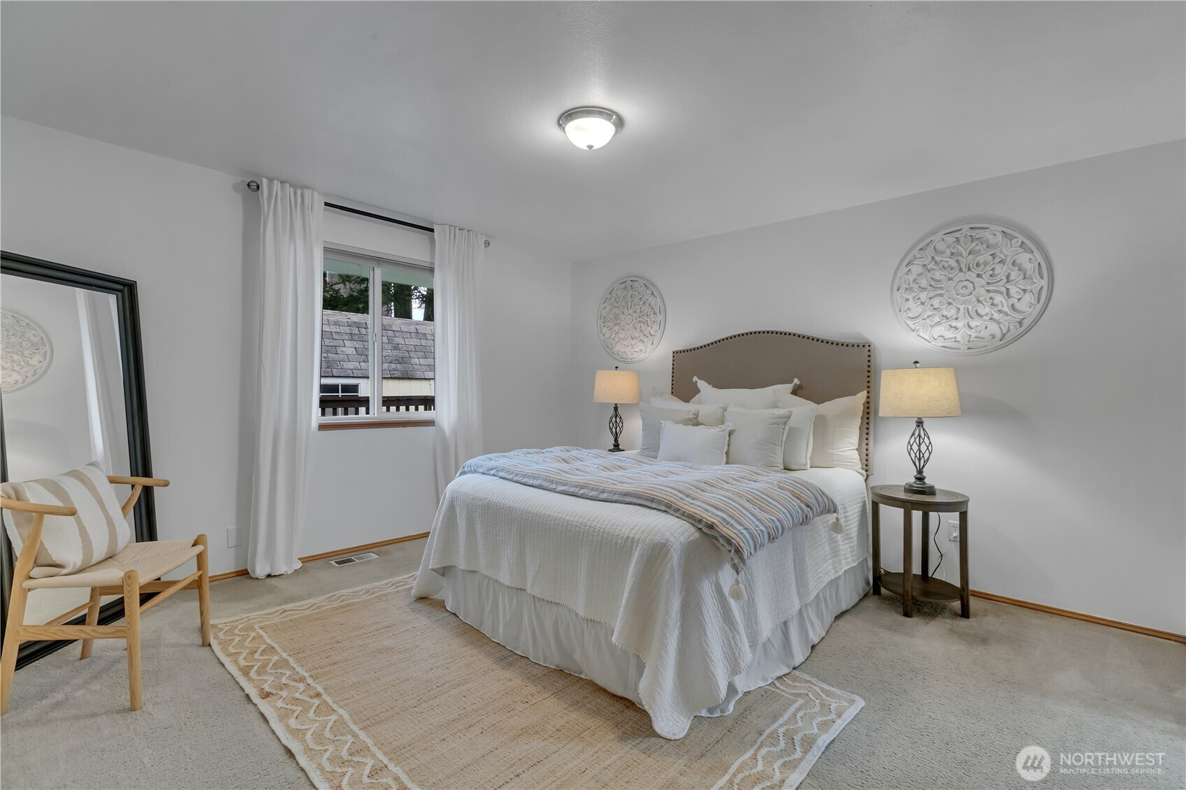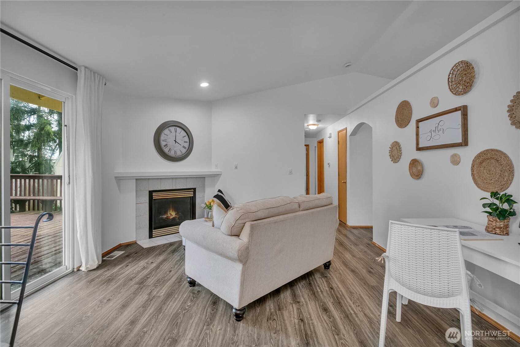 Discover the ease of single-level living in this charming Tacoma home, perfectly situated on a quiet cul-de-sac just minutes from Frederickson's shopping and dining. The open concept floorplan flows effortlessly beneath vaulted ceilings and is finished with new interior paint and vinyl windows throughout. The inviting living room centers around a gas fireplace and opens through sliding glass doors to a large deck with two sets of stairs leading to the fully fenced backyard. The kitchen features honey oak cabinetry, crisp white counters, a breakfast bar, stainless steel appliances including a gas range, built-in microwave, refrigerator, and dishwasher, plus a skylight and garden window that fill the space with natural light. The primary suite offers a walk-in closet, dual vanity, marble-patterned tile floors, and an accessible step-in tub with low-maintenance shower surround and built-in shelving. Two additional bedrooms with large windows share a stylish three-quarter bath featuring a custom tile shower with rainfall showerhead. The backyard is ready for your hot tub with a concrete pad and 220V wiring already in place. Additional highlights include a new roof within the last three years, large driveway with ample parking, an epoxy-floored garage and 50-gallon gas water heater.