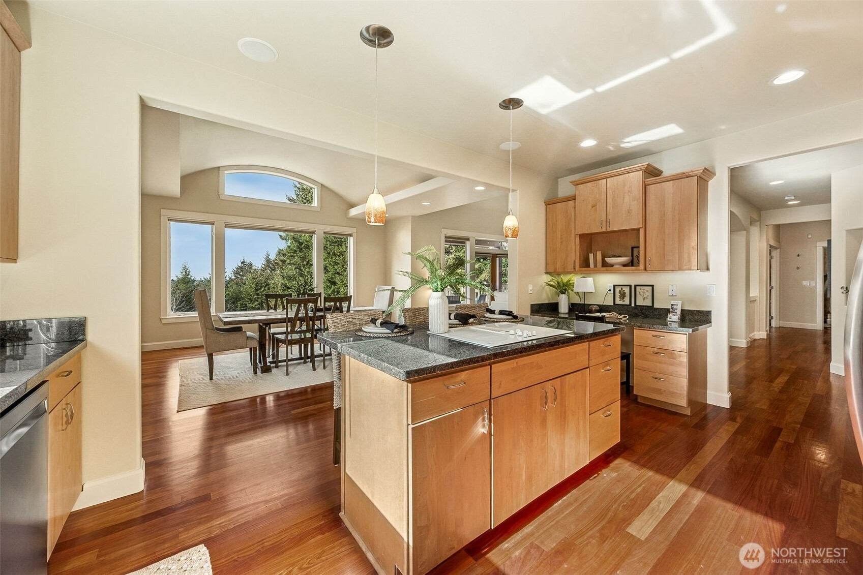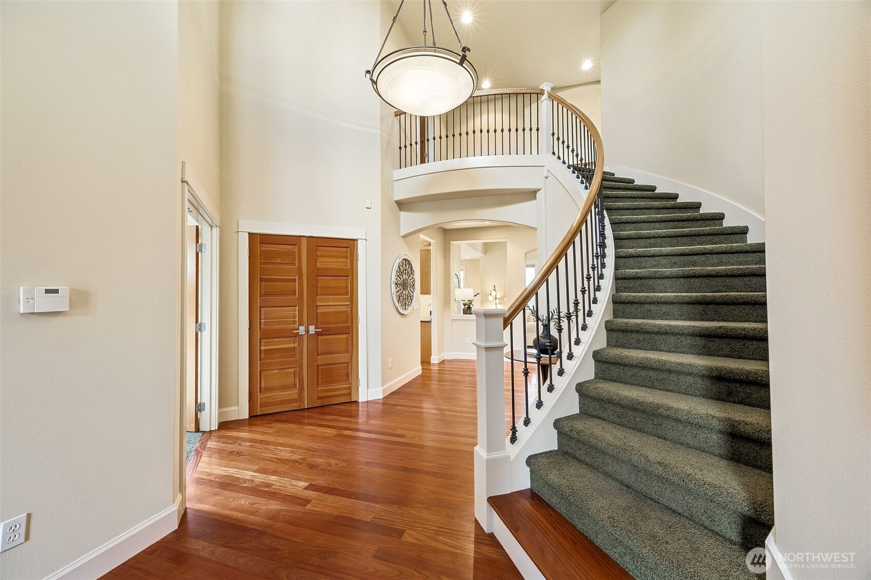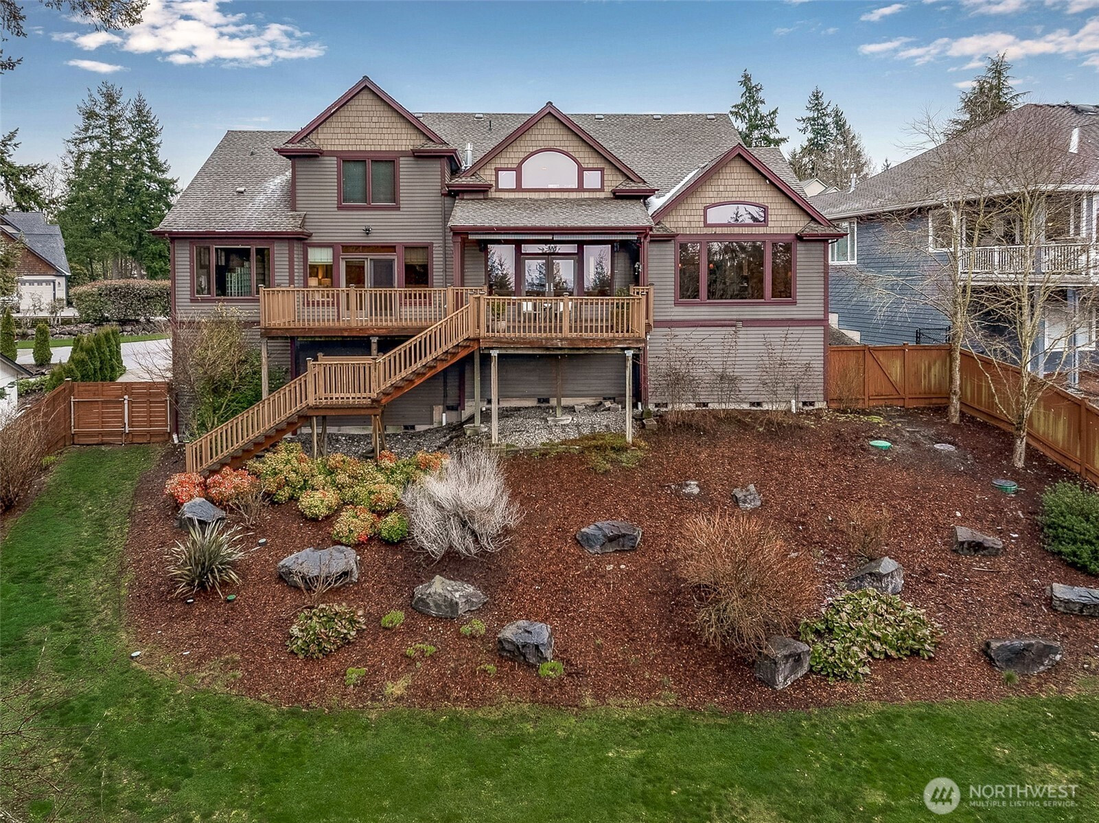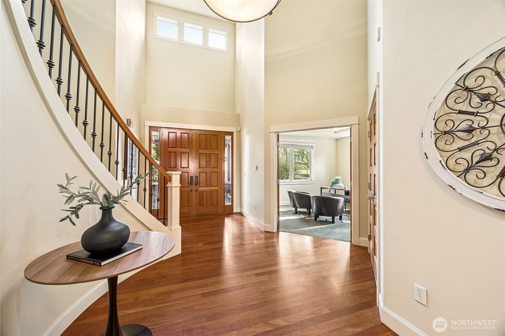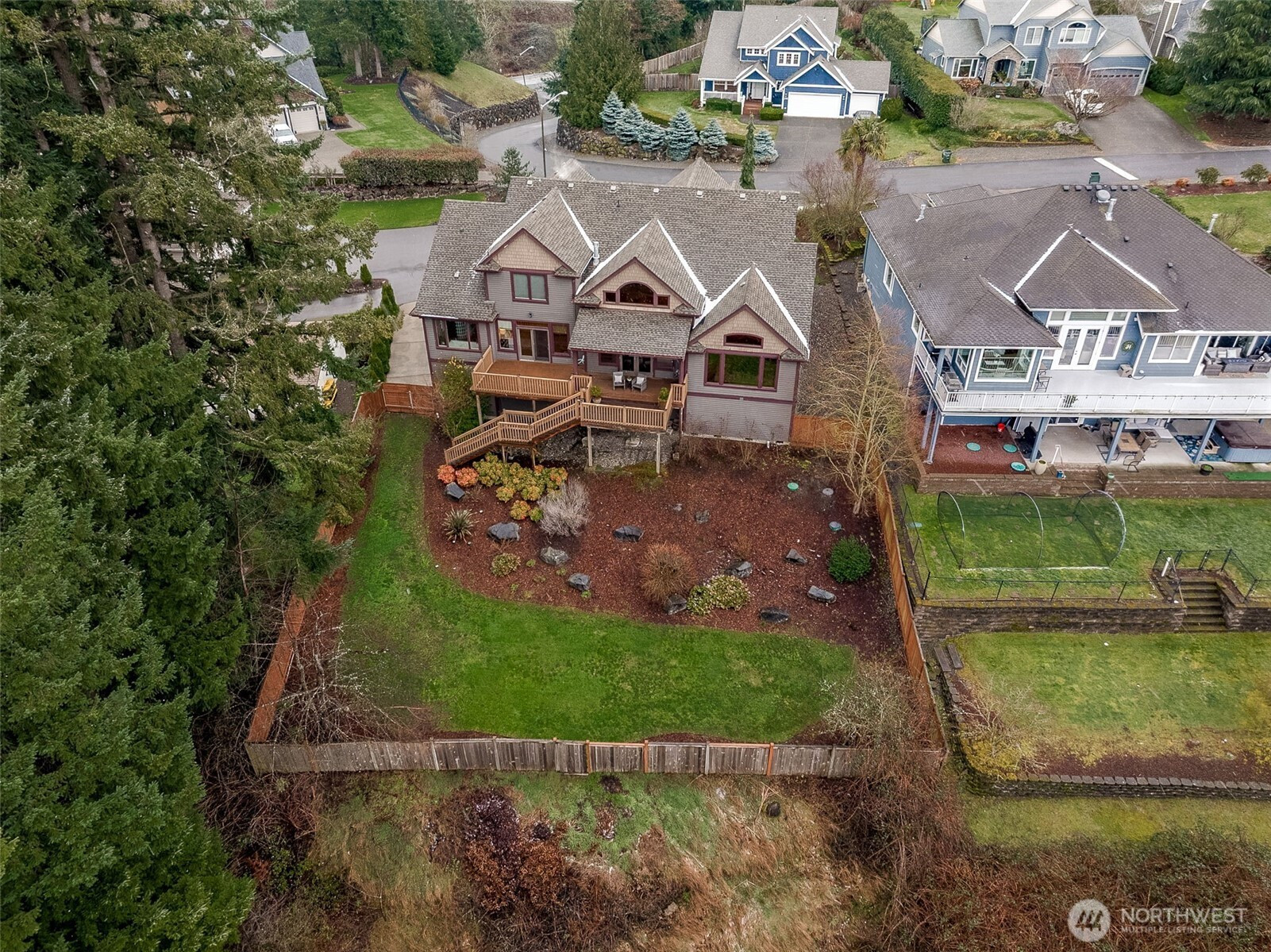 Located in the desirable Lake Tapps community of Orion Ridge and within the highly sought-after Dieringer School District, this beautifully crafted custom home features a coveted main floor primary suite and a finished 20’x20’ shop with 220V—perfect for hobbies, storage, or workspace. Enjoy partial Olympic Mountain views and a light-filled open concept floor plan designed for both comfort and entertaining. A grand double entry door with curved staircase welcomes you inside to Santos mahogany hardwood floors, wood-wrapped windows, solid-core fir doors, & surround sound. The spacious kitchen offers granite countertops, stainless steel appliances, crown-molded cabinetry, under-cabinet lighting, walk-in pantry, and a dining room with custom barrel-vaulted ceilings. The main level primary retreat showcases double door entry, French doors to the covered back deck, walk-in closet, and a luxurious 5-piece bath with vaulted ceilings- plus a main floor office/den with walk-in closet and 1 addtl. finished room/opt 4th bedroom on the main! While upstairs offers two more guest bedrooms and a versatile extra-finished room. Outdoor living shines with a covered deck featuring built-in speakers and BBQ gas stub for year-round enjoyment. Additional highlights include A/C, cedar siding with stone accents, and recent updates including furnace and septic pump and exterior paint. Exceptional quality in a prime Lake Tapps location! Ask for our Features List!