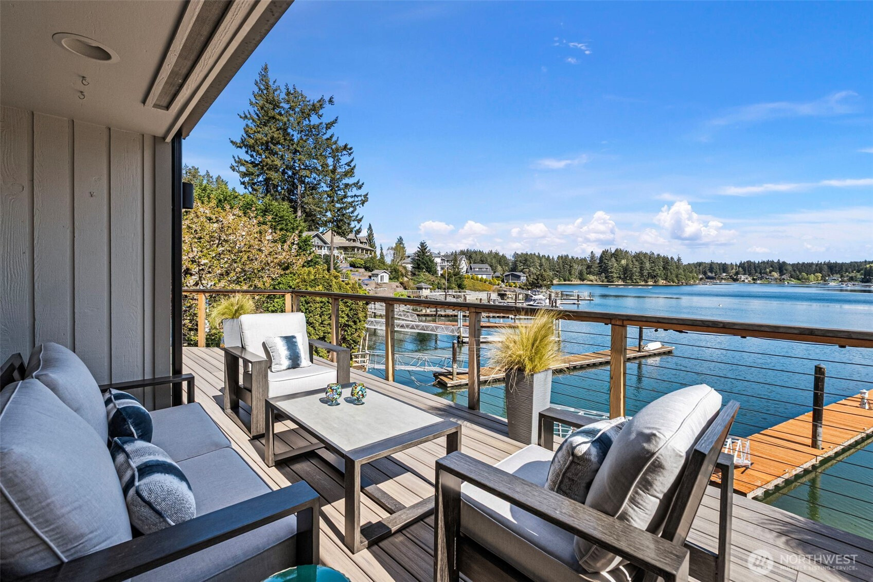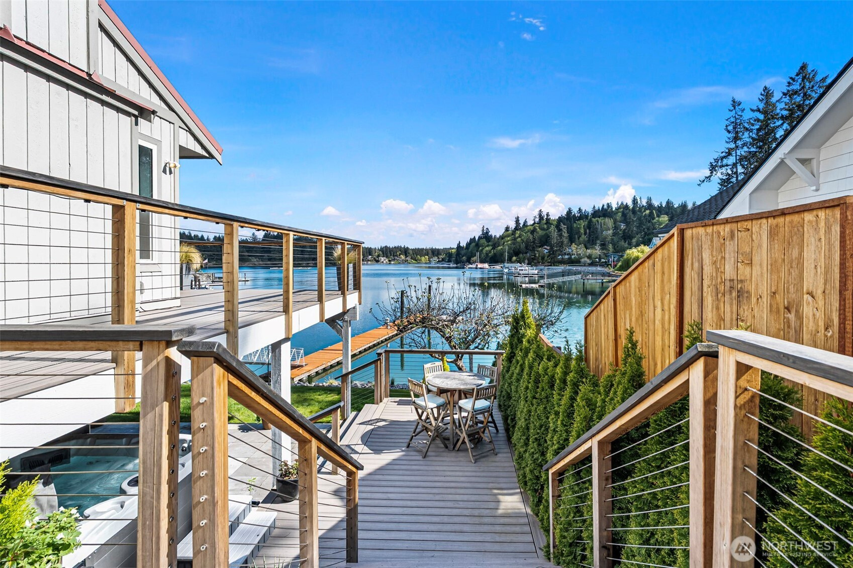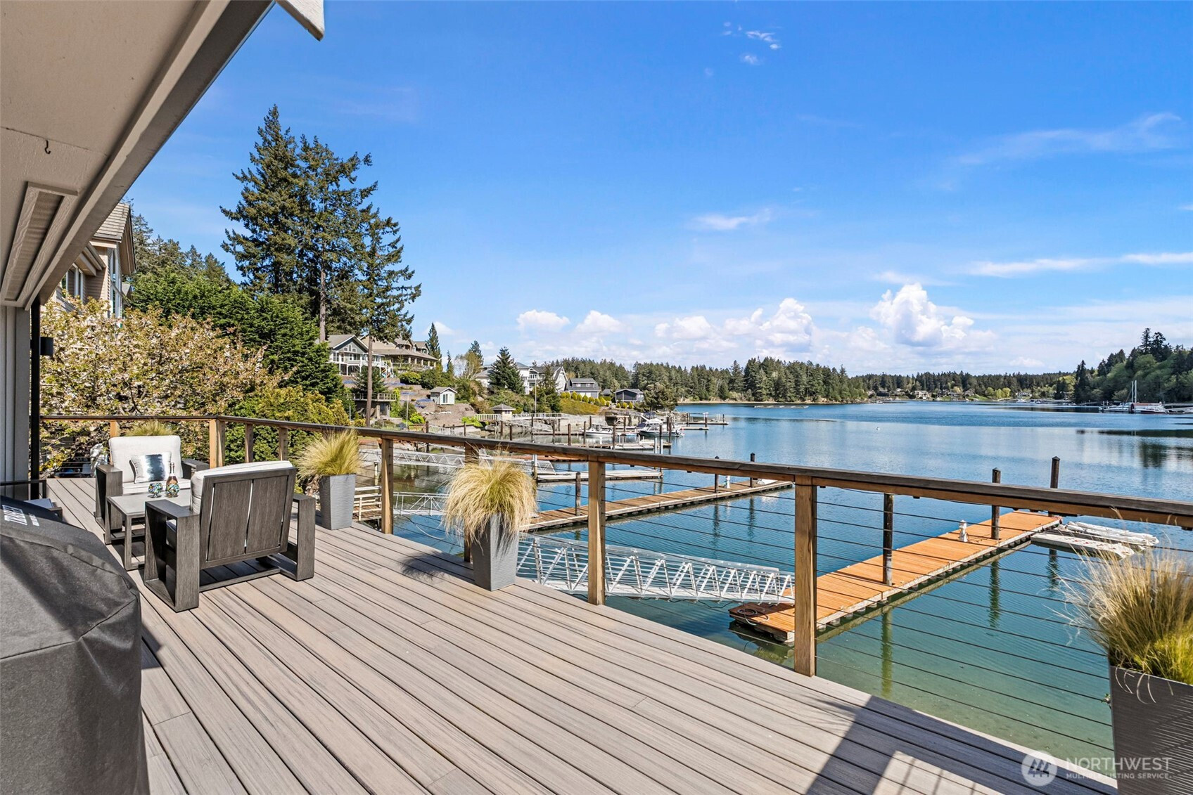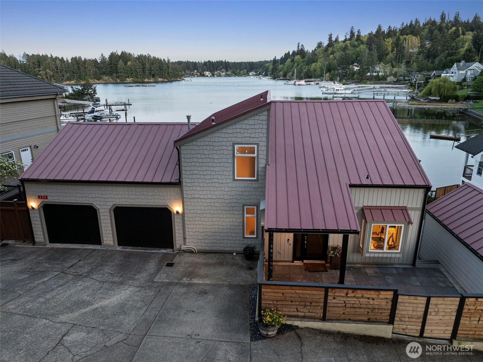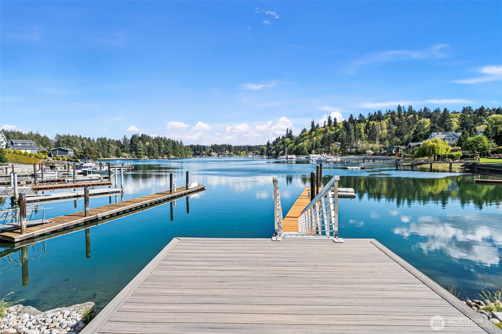 295 Shorewood Court is where Fox Island waterfront living feels effortless. Set along Echo Bay, tucked quietly off the main road, this multi-level home captures unobstructed water and Mount Rainier views from every room, and every level. The presence of the water is felt throughout, and every level opens to the outdoors. Wake up to the glassy waters of Echo Bay and start your day from the water. Swim, kayak, or boat from your own backyard. Great room flows seamlessly through double doors extending your living to the outdoors onto the new Trex multi-level decks and cable railing. A bedroom and bath on every level. Primary Suite is private and occupies its own level with an open loft, balcony, and abundant storage. Renovated lower level features a full kitchen, secondary living, and flex space/3rd bedroom — ideal for extended guests. Concrete patio just a few steps to the private dock. New 73' engineered rock bulkhead - professionally installed & permitted. Private dock with water. New 42' commercial-grade aluminum gangway. New 3-tank GeoFlow septic system with drainfield. Metal roof. Central A/C. Wired for generator. Hardwood floors on main and plank flooring on lower level. Tinted windows add privacy. Attached 2-car garage, detached 1-car garage/shop/gym. Fully inspected. Fox Island has a rhythm of its own with annual community events, summer concerts, or walks to Bella Bella Beach. 295 Shorewood Court — where the life you imagined becomes the one you live.