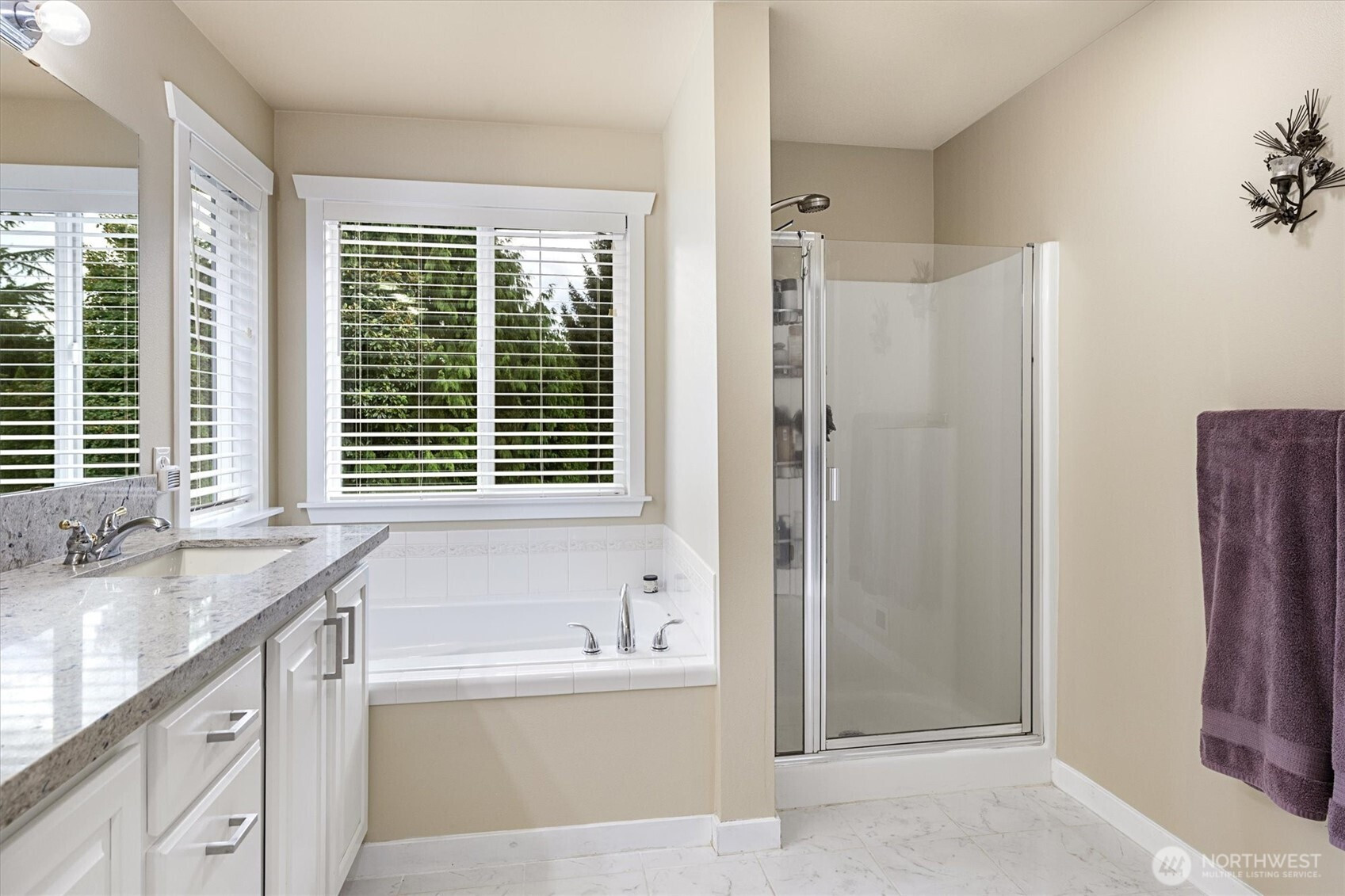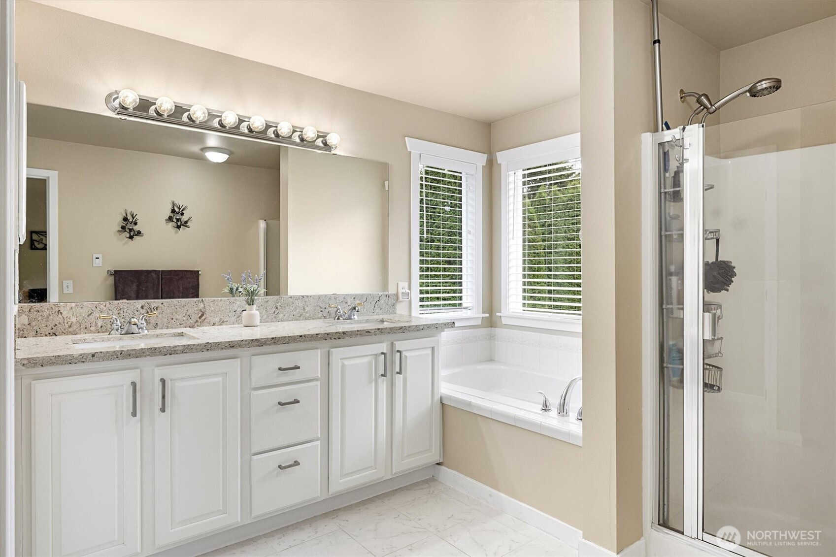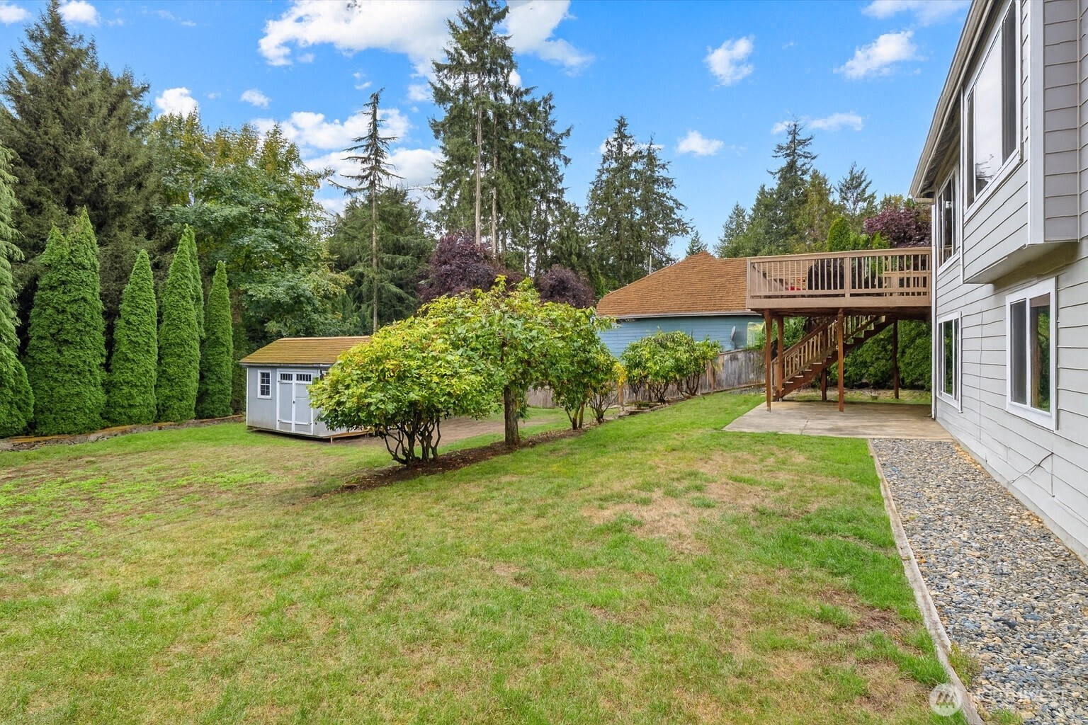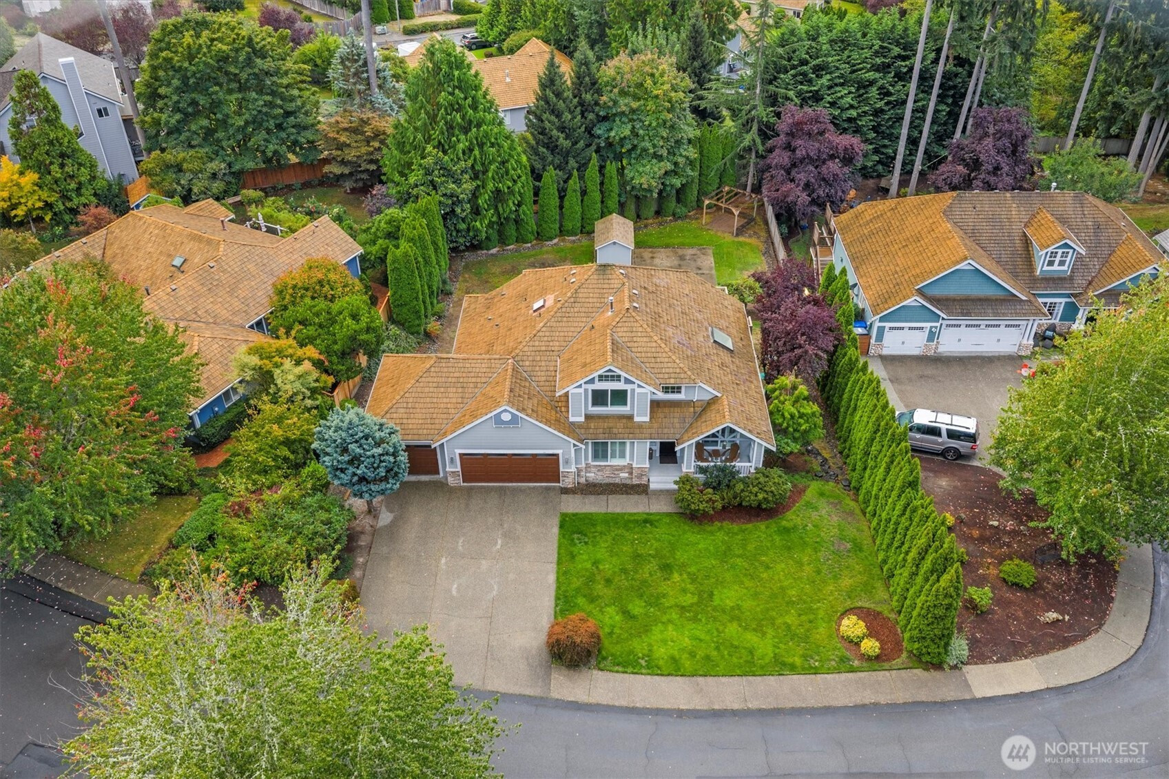 Welcome to Discovery Point, a coveted gated community in a prime location! This fully pre-inspected 5-bedroom + office, 3,242 sq ft home sits on a lush .36-acre lot w/ hardiplank siding & fresh curb appeal: new garage doors, newer windows, & a statement front entrance. Inside, quartz counters, plantation shutters, & custom blinds elevate each space. The large kitchen shines w/ new appliances, soaring ceilings, & a skylight that floods the room with light. Two primary suites (one on the main w/ soaker tub) offer flexible living, while the daylight basement invites multi-generational potential. Enjoy large yard w/ mature landscaping, fruit trees, & storage shed. Closely located near Madrona Links Golf Course, schools, Hwy 16, & shopping!