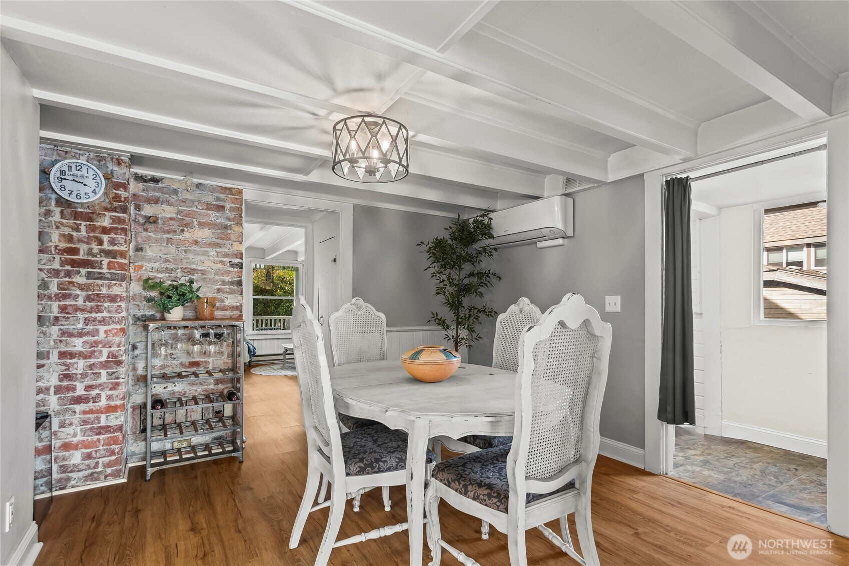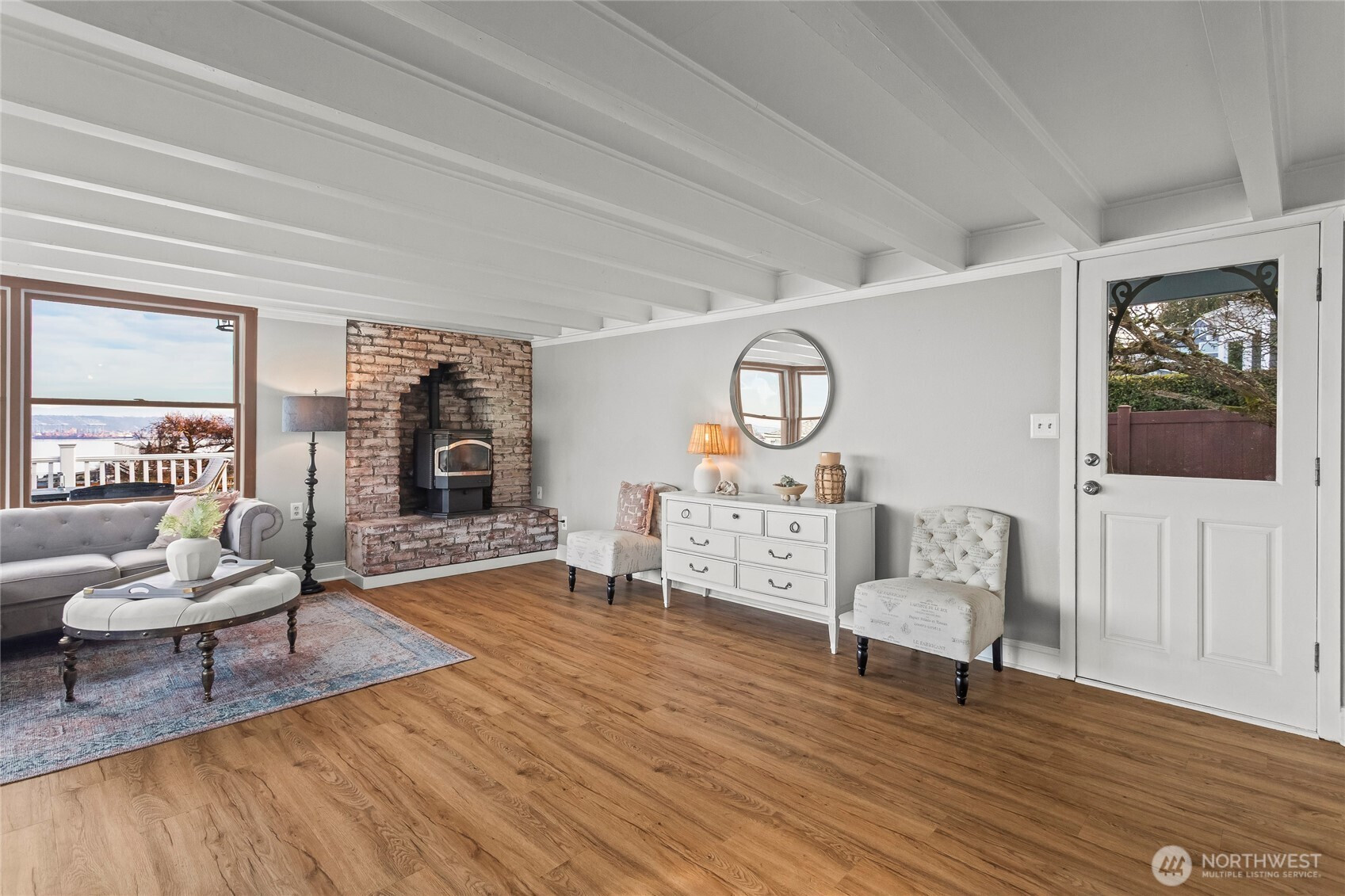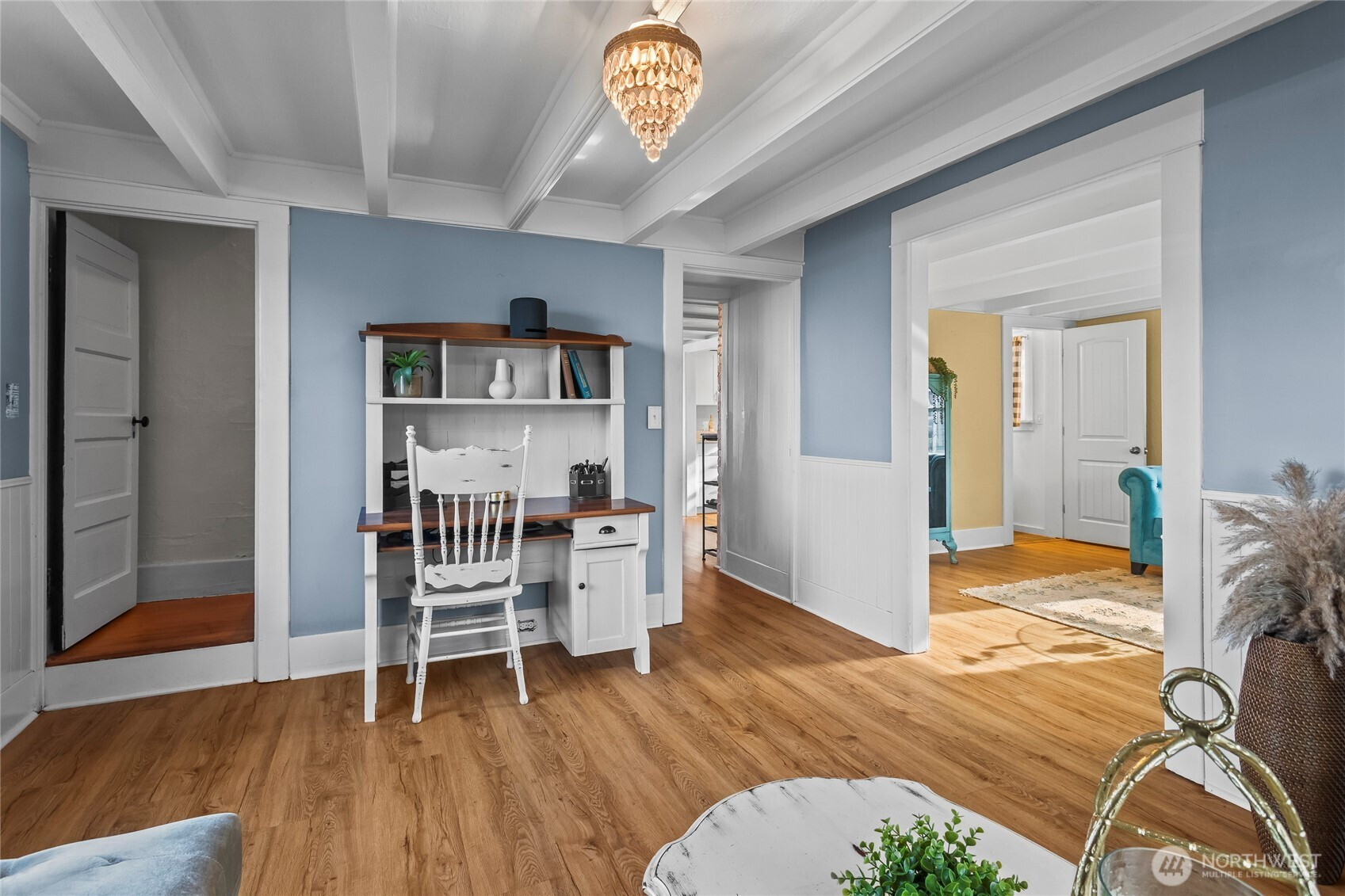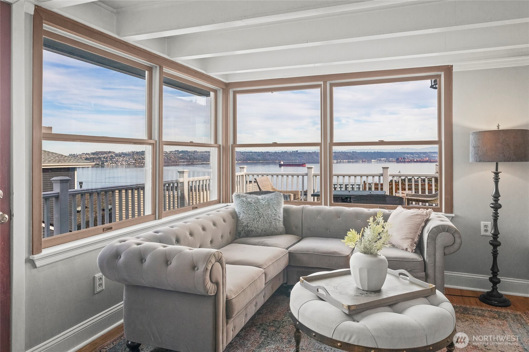 In the North End of Tacoma a cottage stands on a hill overlooking the Salish Sea where ferries go from shore to shore, sailboats race and the sunrise reflects on the water, doubling the light and color as days begin. Living room windows show Commencement Bay year round, while summer invites you to the back deck to enjoy the view in the sunshine. Open the gate beneath the arbor to enter a garden where hydrangeas and roses bloom beside the covered front porch, then come inside to get acquainted with this 1905 home with beamed ceilings, a 1/2 bath for guests and two flexible front rooms in addition to the dining room and living room. Upstairs, find fir floors, two quaint bedrooms, glimpses of the water and a 2nd bath. Updates include a 2018 roof and sewer line, new floors, and a professionally built deck, retaining wall, pergola and arbor. Set above Old Town with its waterfront dining and sandy beach, and less than a mile from Proctor shops, markets and cafes.