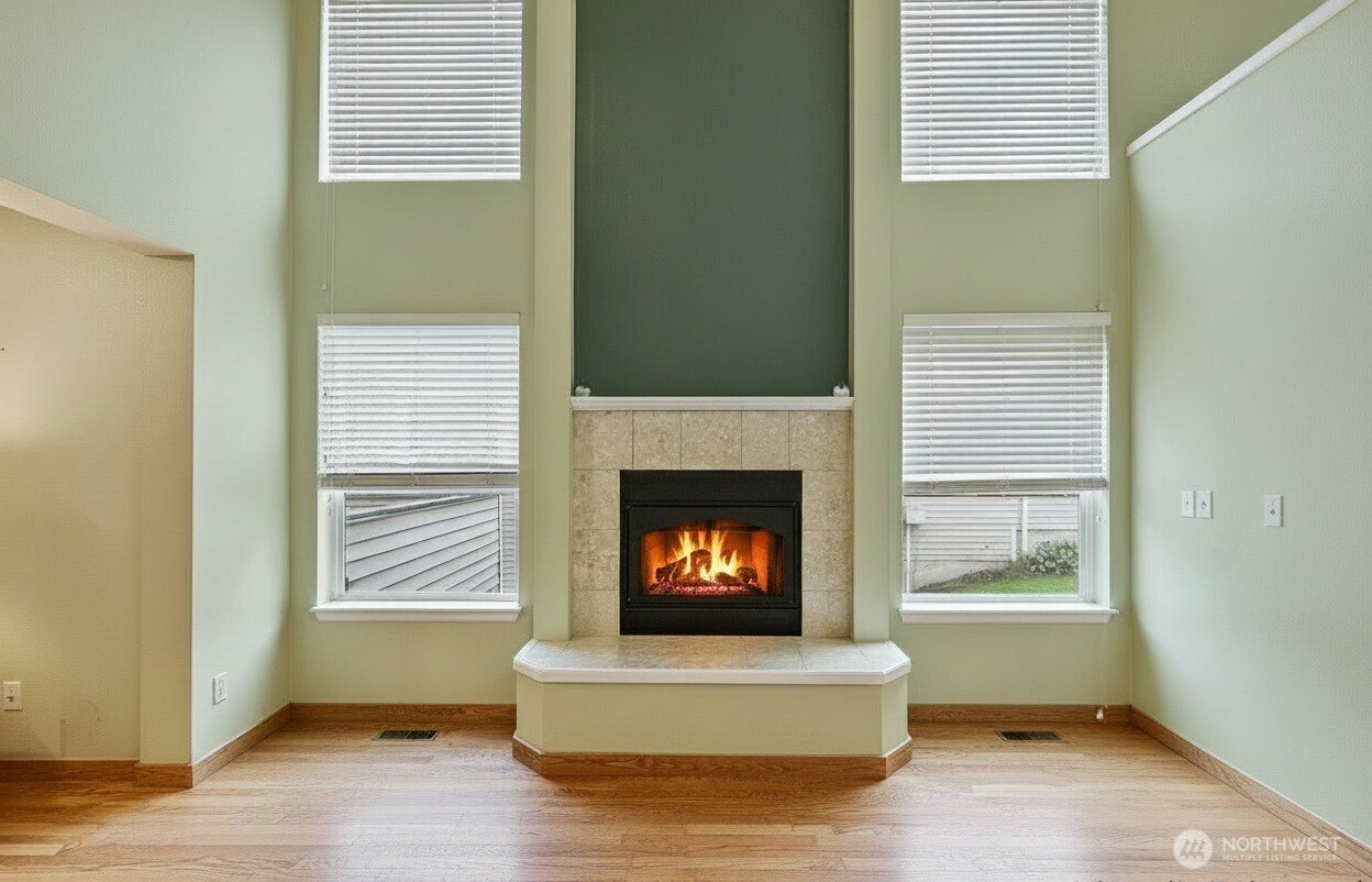 Bright and inviting home featuring soaring ceilings, abundant natural light, and a warm gas fireplace as the living room centerpiece. The open layout flows into a well-appointed kitchen with breakfast bar seating and ample cabinet space. Versatile dining and flex areas offer room for entertaining, work, or relaxation. Large windows overlook the surrounding greenery, creating a peaceful indoor-outdoor connection. Thoughtful updates and spacious rooms throughout make this home move-in ready and perfect for comfortable everyday living.