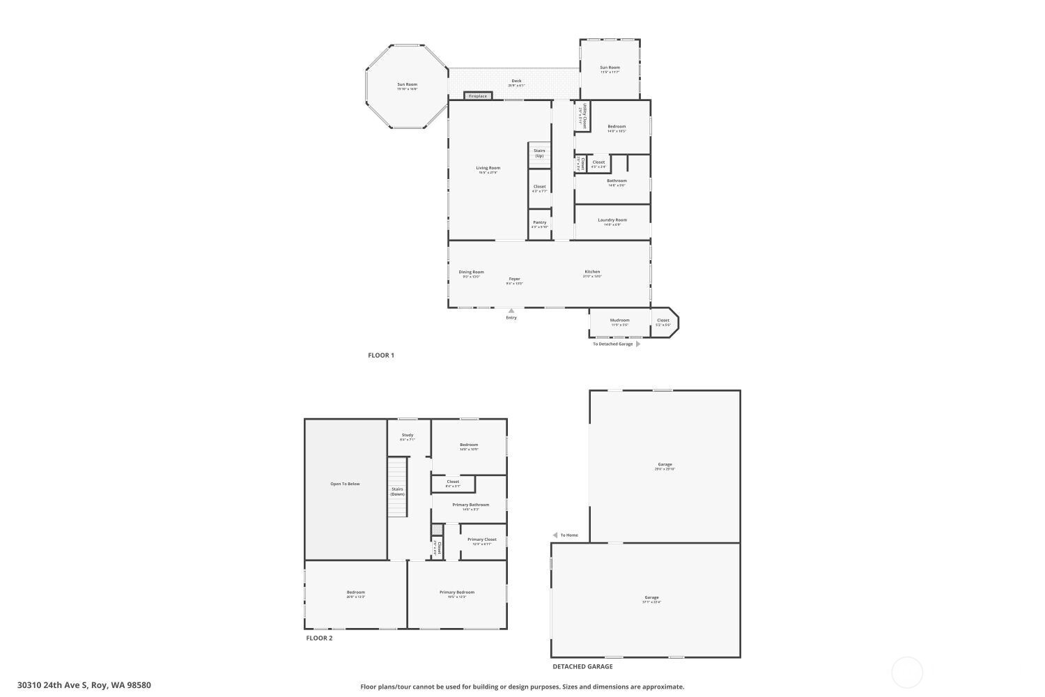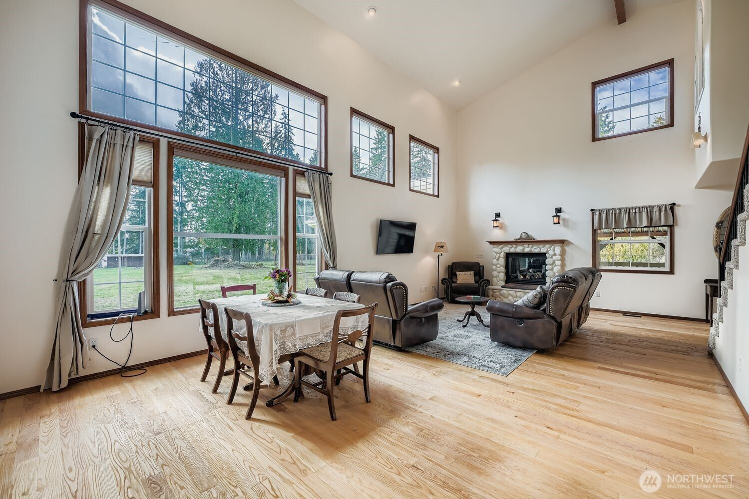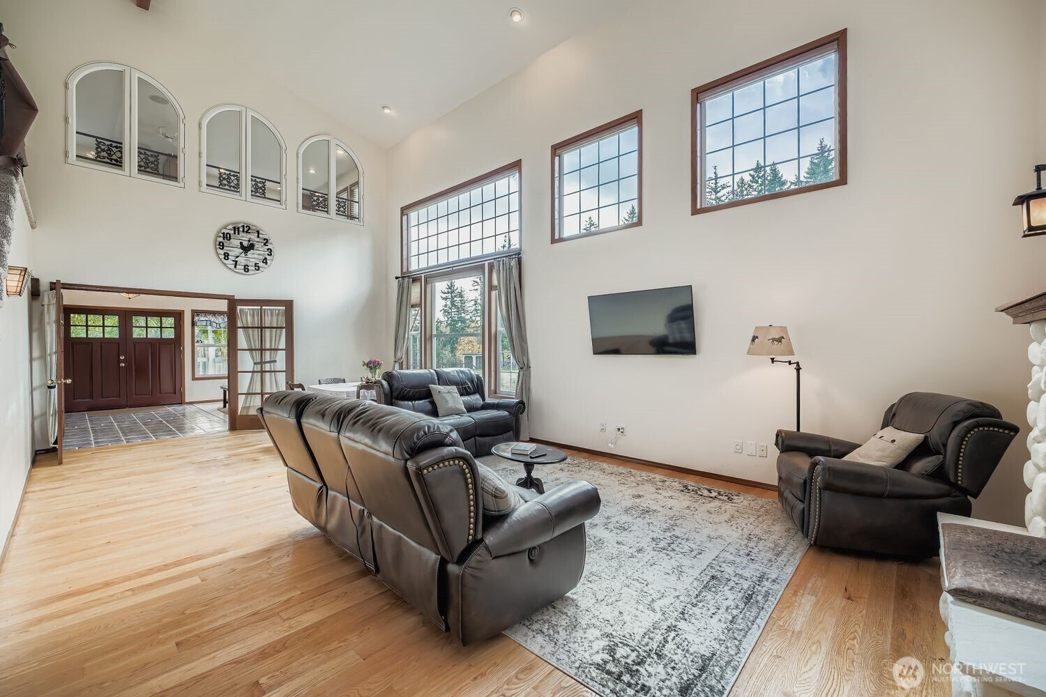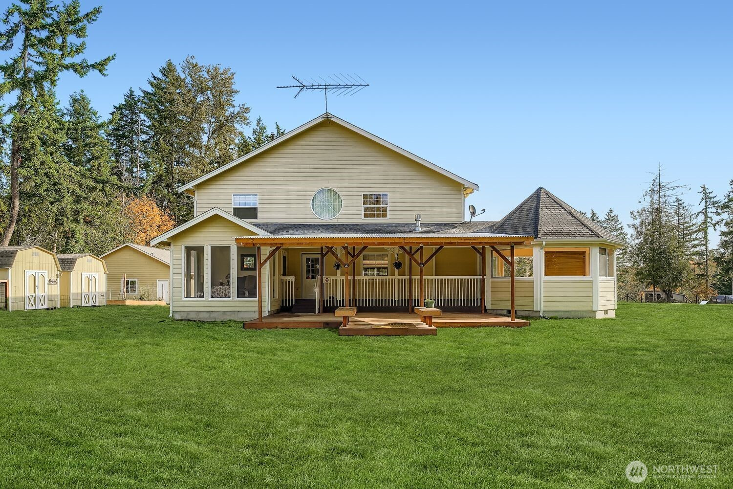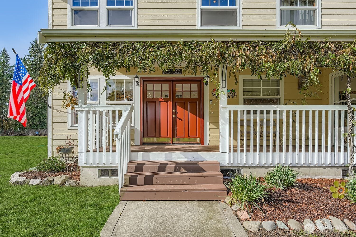 Modern farmhouse on 4.4 serene acres w/sweeping pastoral views. Nearly 3,000 sqft custom home w/handsome craftsmanship: solid oak doors, rich hardwoods, vaulted ceilings & abundant natural light framed by wrought-iron accents. Designed for entertaining, the open layout features a gourmet kitchen w/hickory cabinetry, generous dining area & seamless indoor-outdoor living w/covered front & back porches. True equestrian setup, 6 fenced pastures, horse shelters, 2 sheds, gardens, large shop built for a car lift & covered RV parking. Unique octagon music room w/private sauna. Smart ranch layout w/main-level mud/tack rooms & laundry. Upper-level office overlooks acreage & livestock w/partial Mount Rainier view. Assumable VA 3.5%!