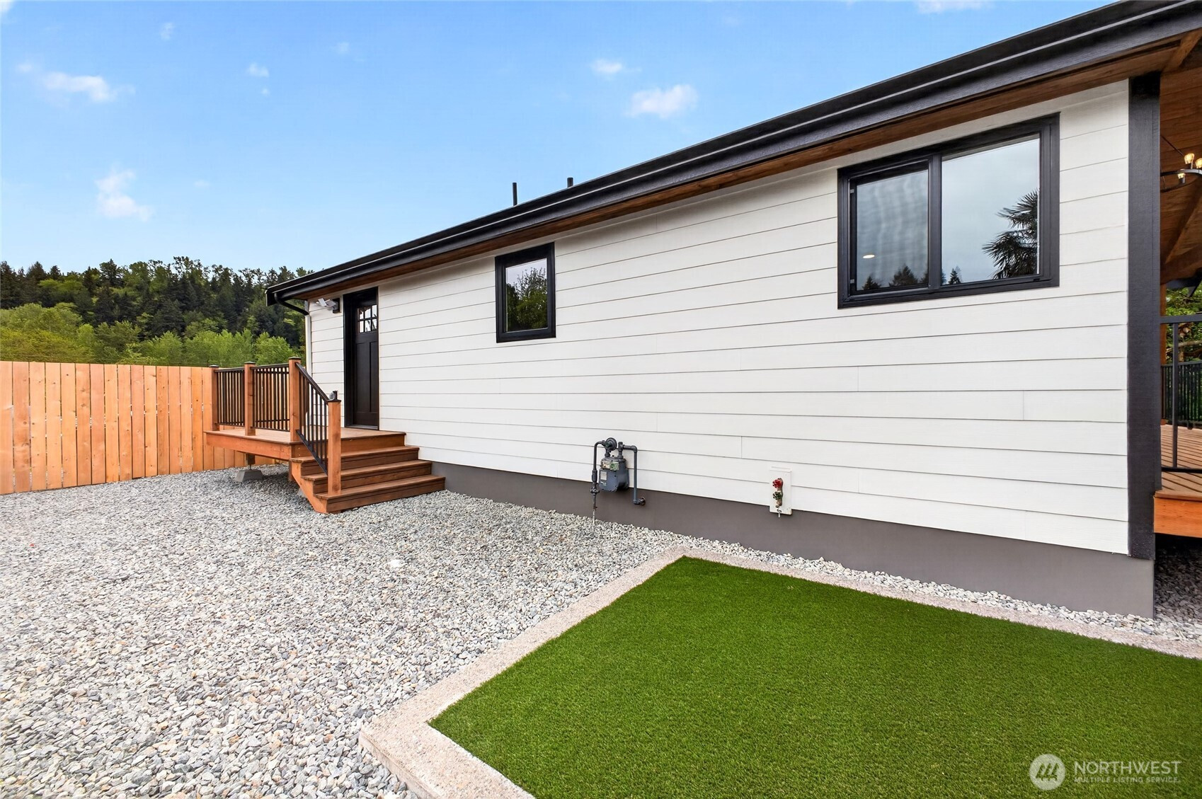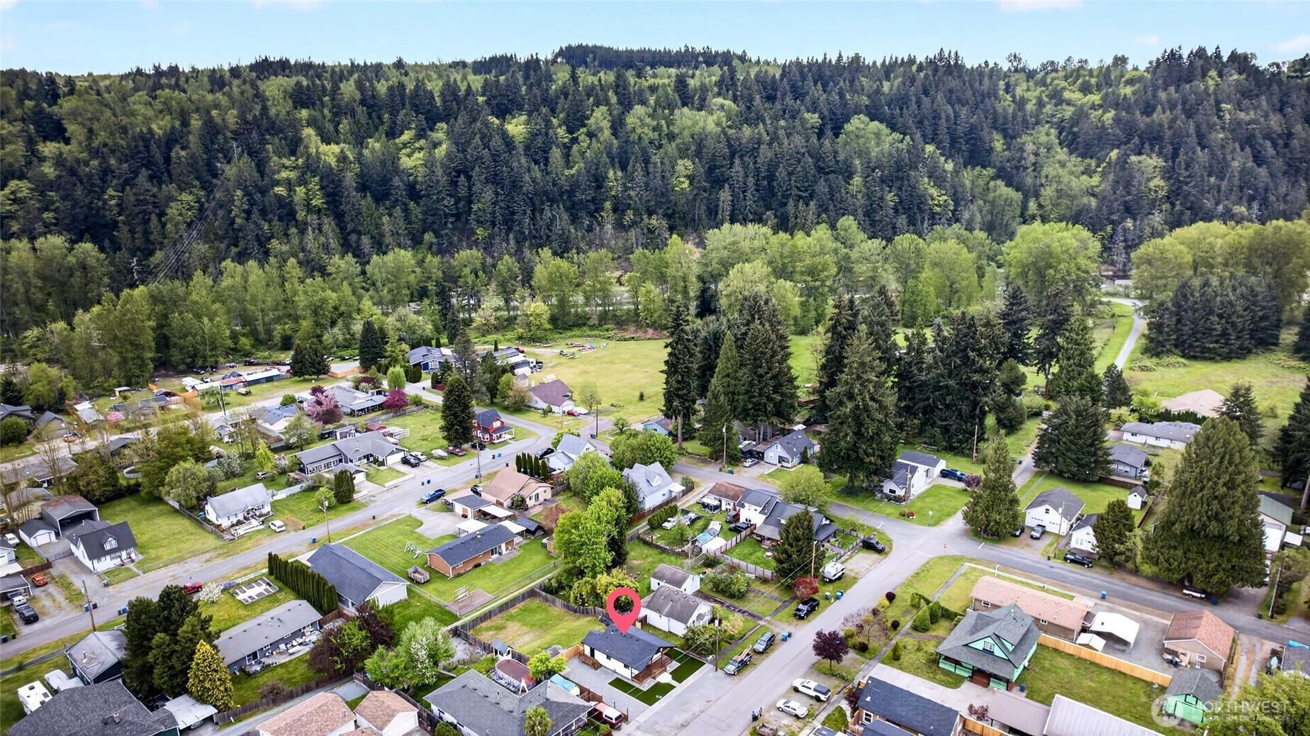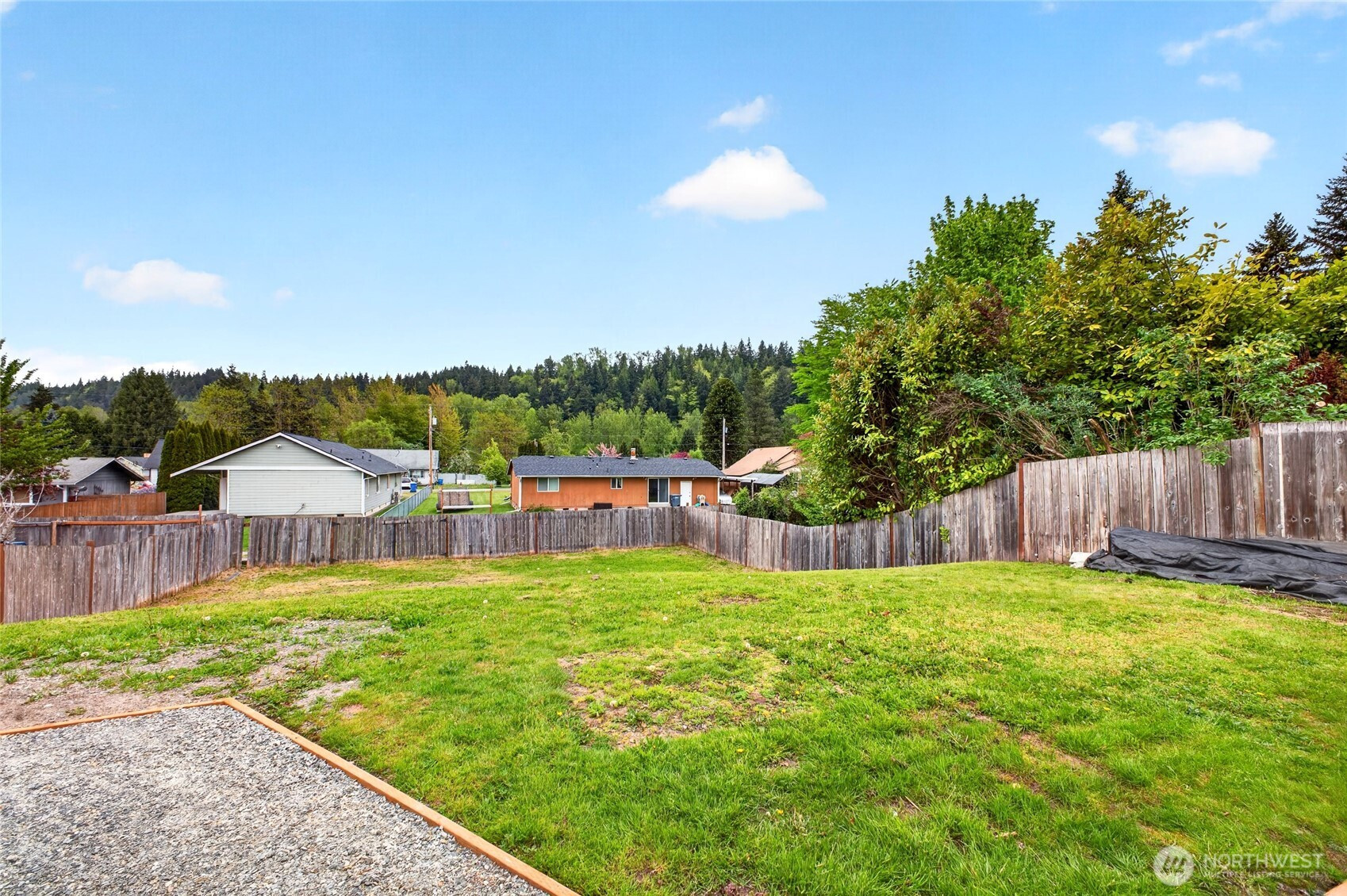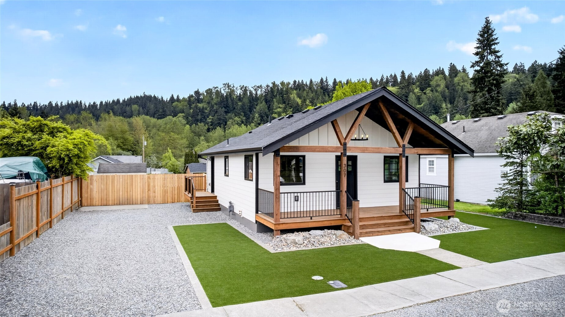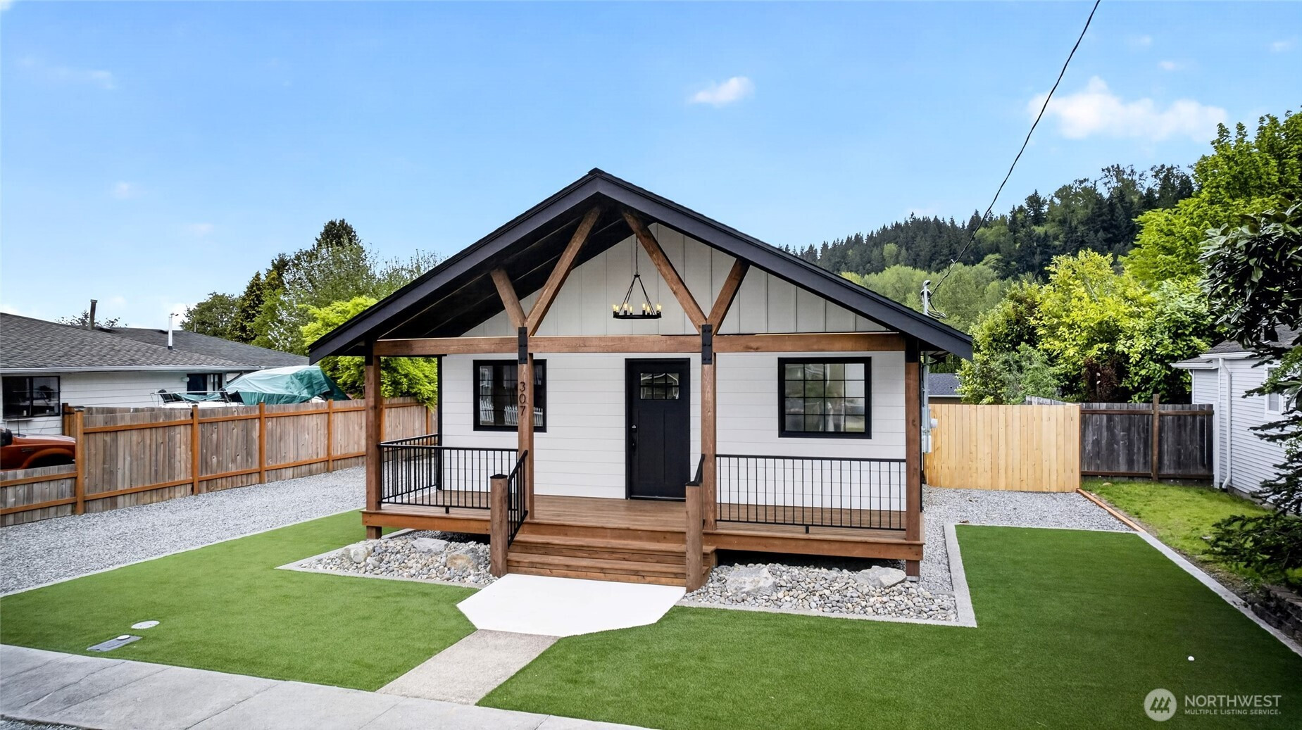 Welcome to this charming 2 bedroom 1 bath home located in the cute town of Orting. An inviting and spacious front porch greets you into this meticulously fully remodeled home that blends original charm with modern efficiencies. Step into a bright, move in ready interior featuring an open concept, yet cozy living room and a perfectly laid out kitchen that shows off ample counterspace, nice finishes, and optimizes space with built in cabinet storage. Conveniently located laundry room offers storage and stackable Samsung washer and dryer. Each bedroom showcases plenty of natural light with barn door finishes for the closets. Down the hall is your perfect full bath with a nice tub for soaking in. The large back yard is fully fenced with endless possibilities: Shop, ADU, or for the green thumb, a large garden space. Additional highlights: All appliances are brand new and stay, Low maintenance turf front yard, toe-kick lighting in kitchen, AC, RV parking, located within walking distance to town and recreation trails. Don't miss this gem!