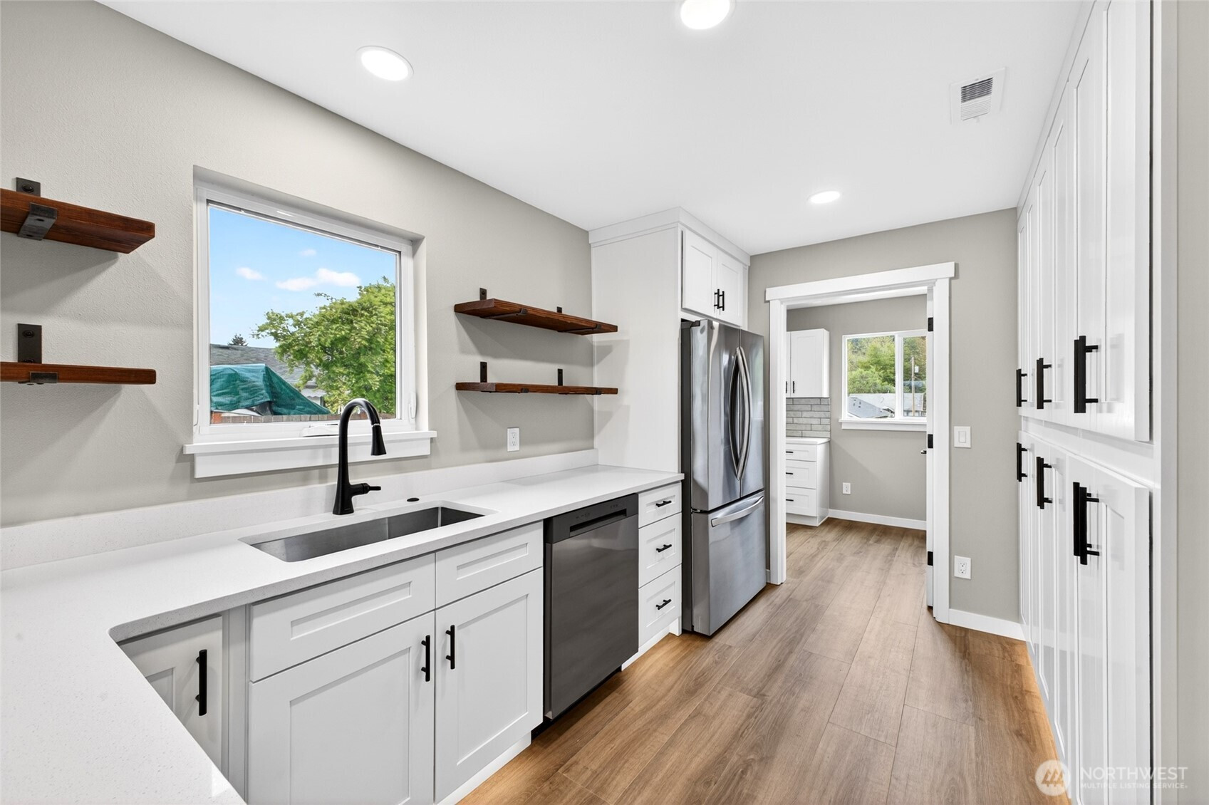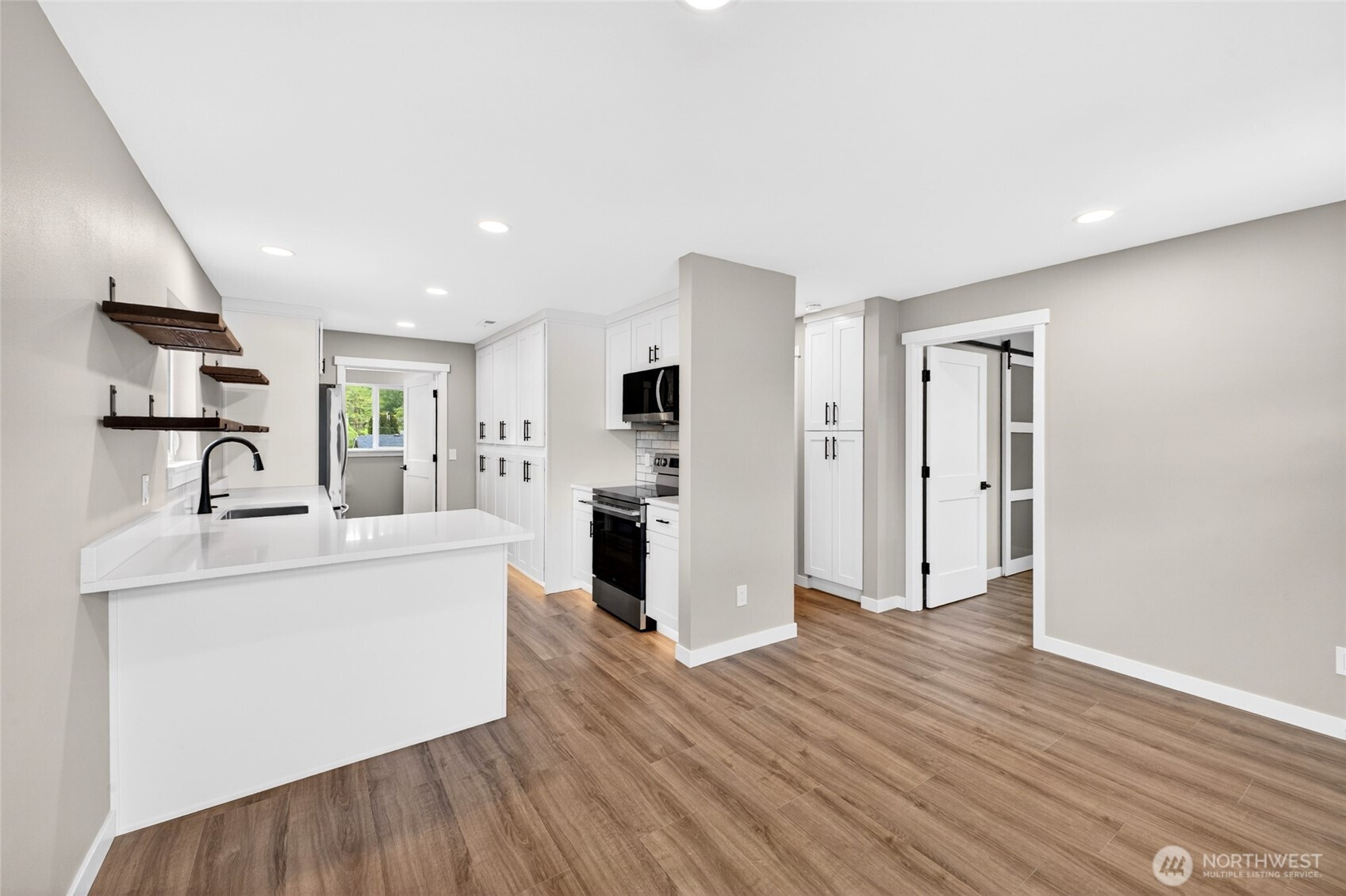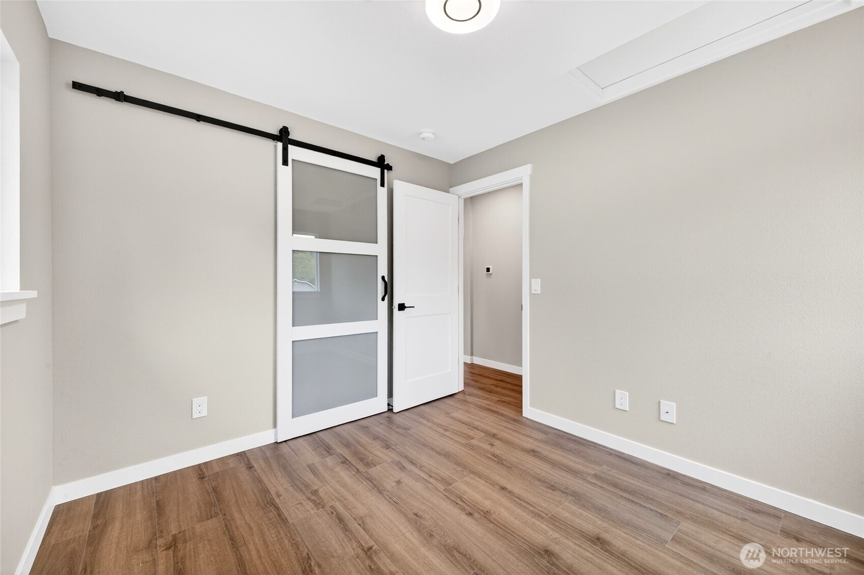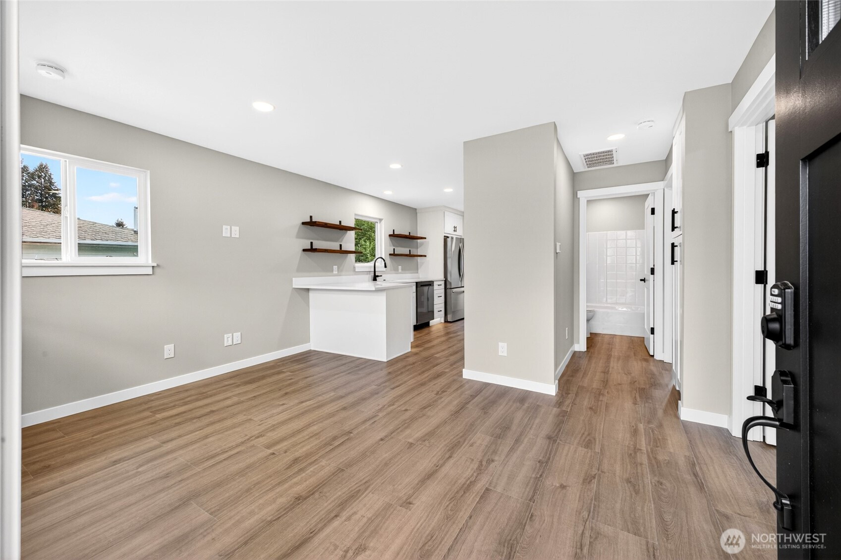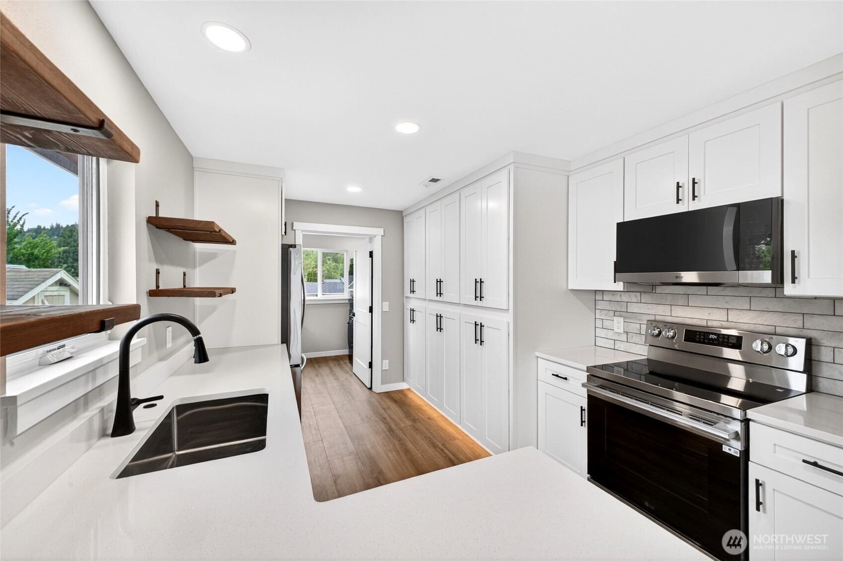 Welcome to this charming 2 bedroom 1 bath home located in the cute town of Orting. An inviting and spacious front porch greets you into this meticulously fully remodeled home that blends original charm with modern efficiencies. Step into a bright, move in ready interior featuring an open concept, yet cozy living room and a perfectly laid out kitchen that shows off ample counterspace, nice finishes, and optimizes space with built in cabinet storage. Conveniently located laundry room offers storage and stackable Samsung washer and dryer. Each bedroom showcases plenty of natural light with barn door finishes for the closets. Down the hall is your perfect full bath with a nice tub for soaking in. The large back yard is fully fenced with endless possibilities: Shop, ADU, or for the green thumb, a large garden space. Additional highlights: All appliances are brand new and stay, Low maintenance turf front yard, toe-kick lighting in kitchen, AC, RV parking, located within walking distance to town and recreation trails. Don't miss this gem!