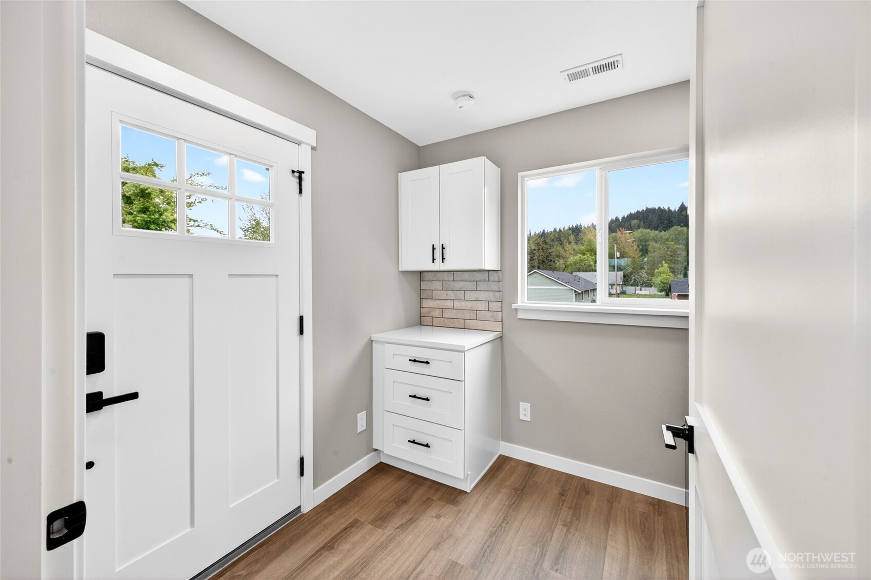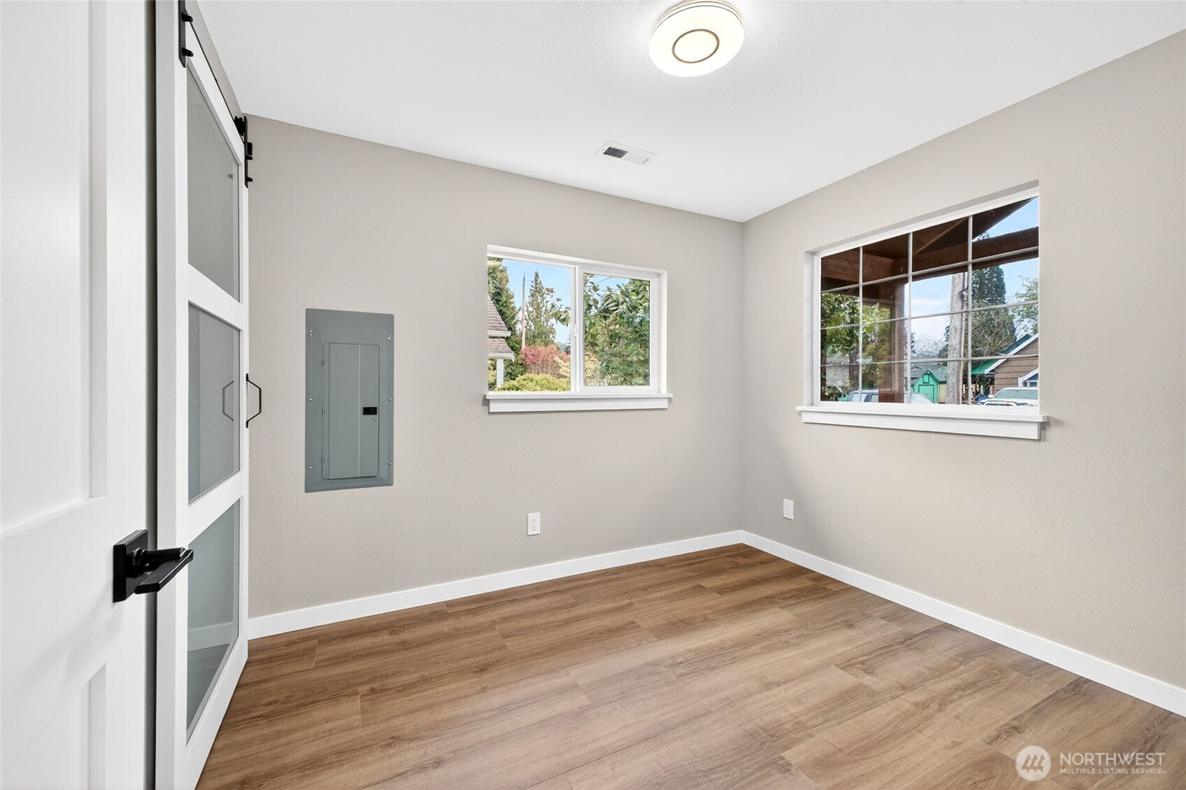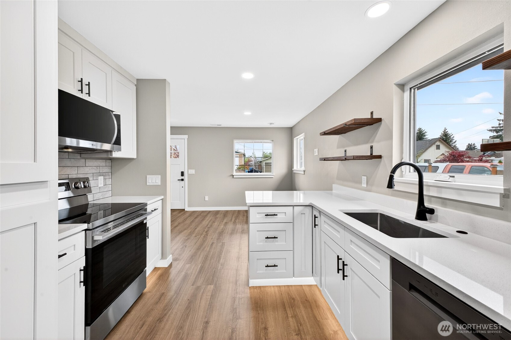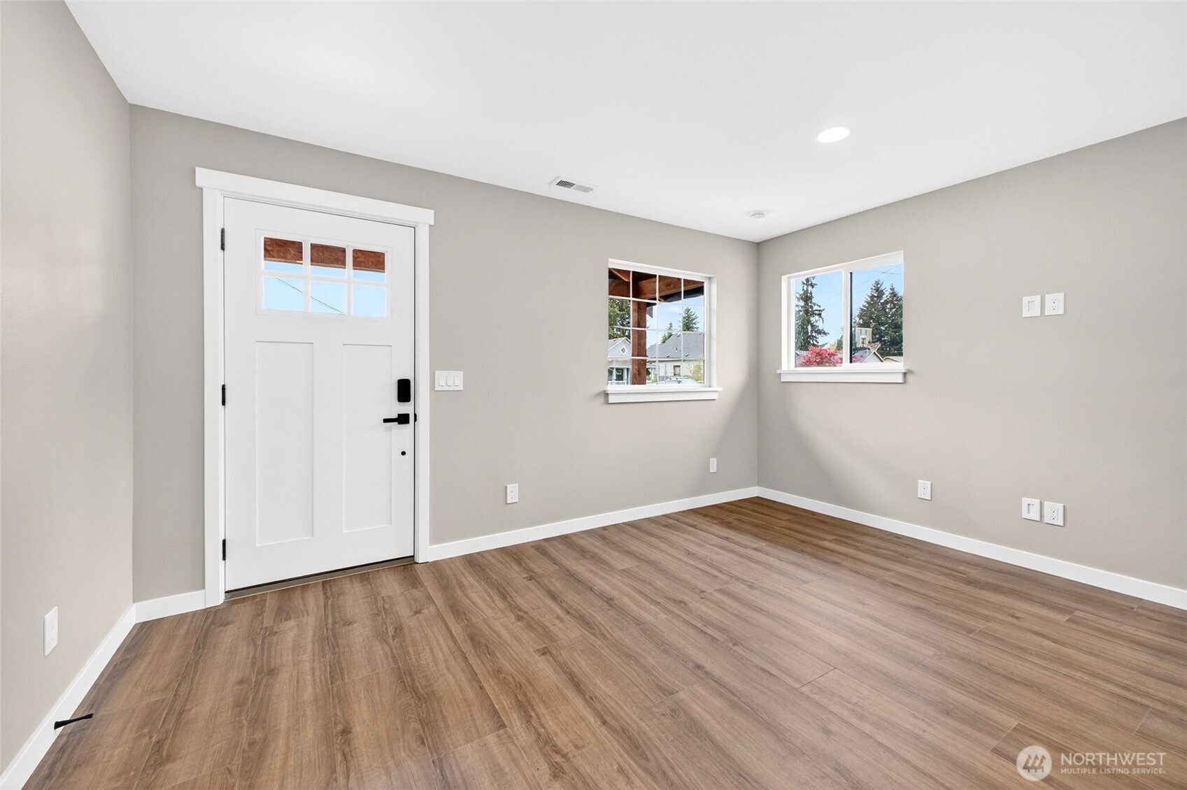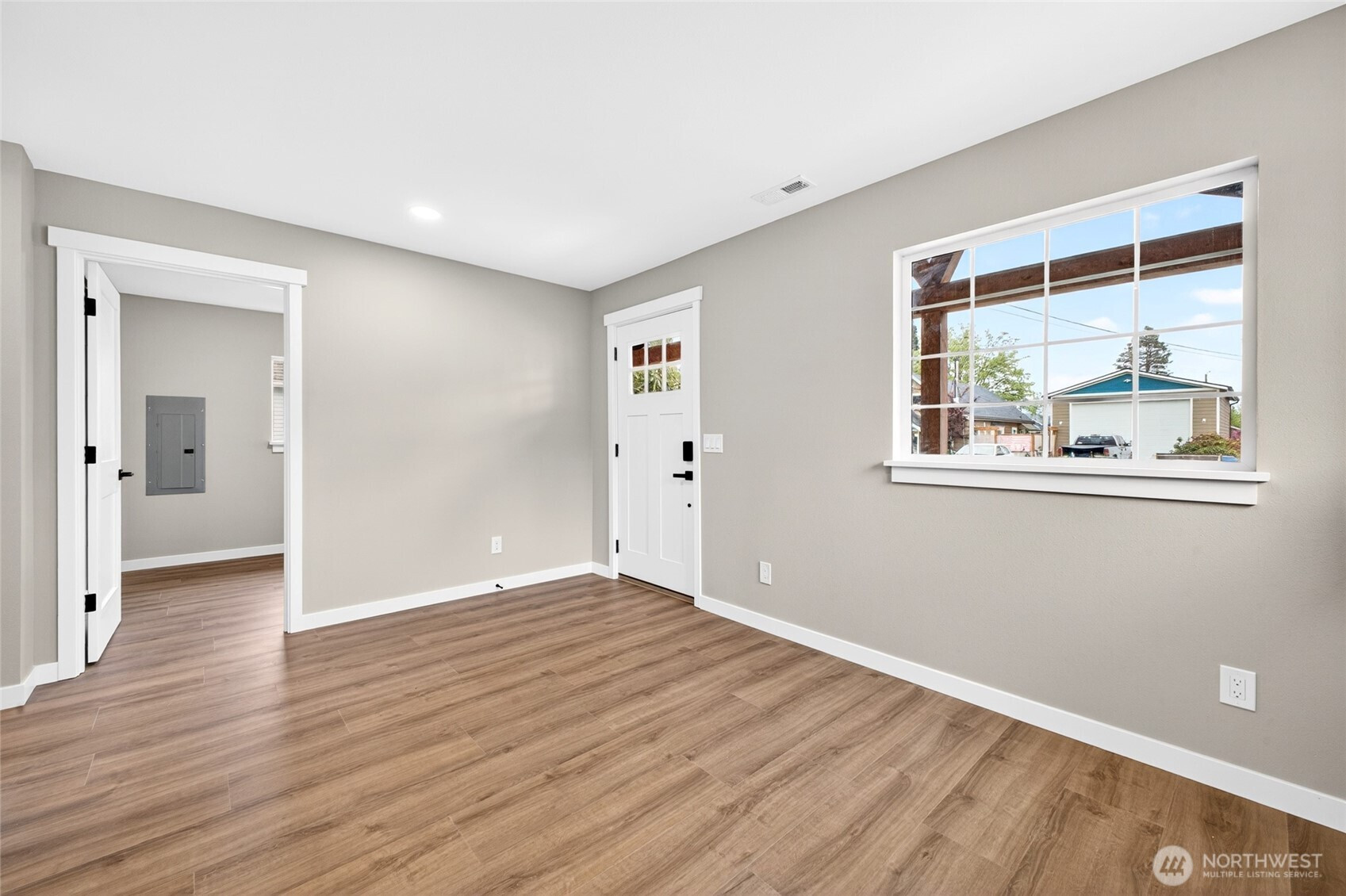 Welcome to this charming 2 bedroom 1 bath home located in the cute town of Orting. An inviting and spacious front porch greets you into this meticulously fully remodeled home that blends original charm with modern efficiencies. Step into a bright, move in ready interior featuring an open concept, yet cozy living room and a perfectly laid out kitchen that shows off ample counterspace, nice finishes, and optimizes space with built in cabinet storage. Conveniently located laundry room offers storage and stackable Samsung washer and dryer. Each bedroom showcases plenty of natural light with barn door finishes for the closets. Down the hall is your perfect full bath with a nice tub for soaking in. The large back yard is fully fenced with endless possibilities: Shop, ADU, or for the green thumb, a large garden space. Additional highlights: All appliances are brand new and stay, Low maintenance turf front yard, toe-kick lighting in kitchen, AC, RV parking, located within walking distance to town and recreation trails. Don't miss this gem!