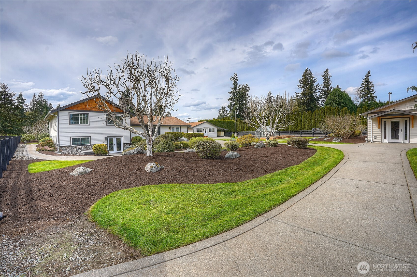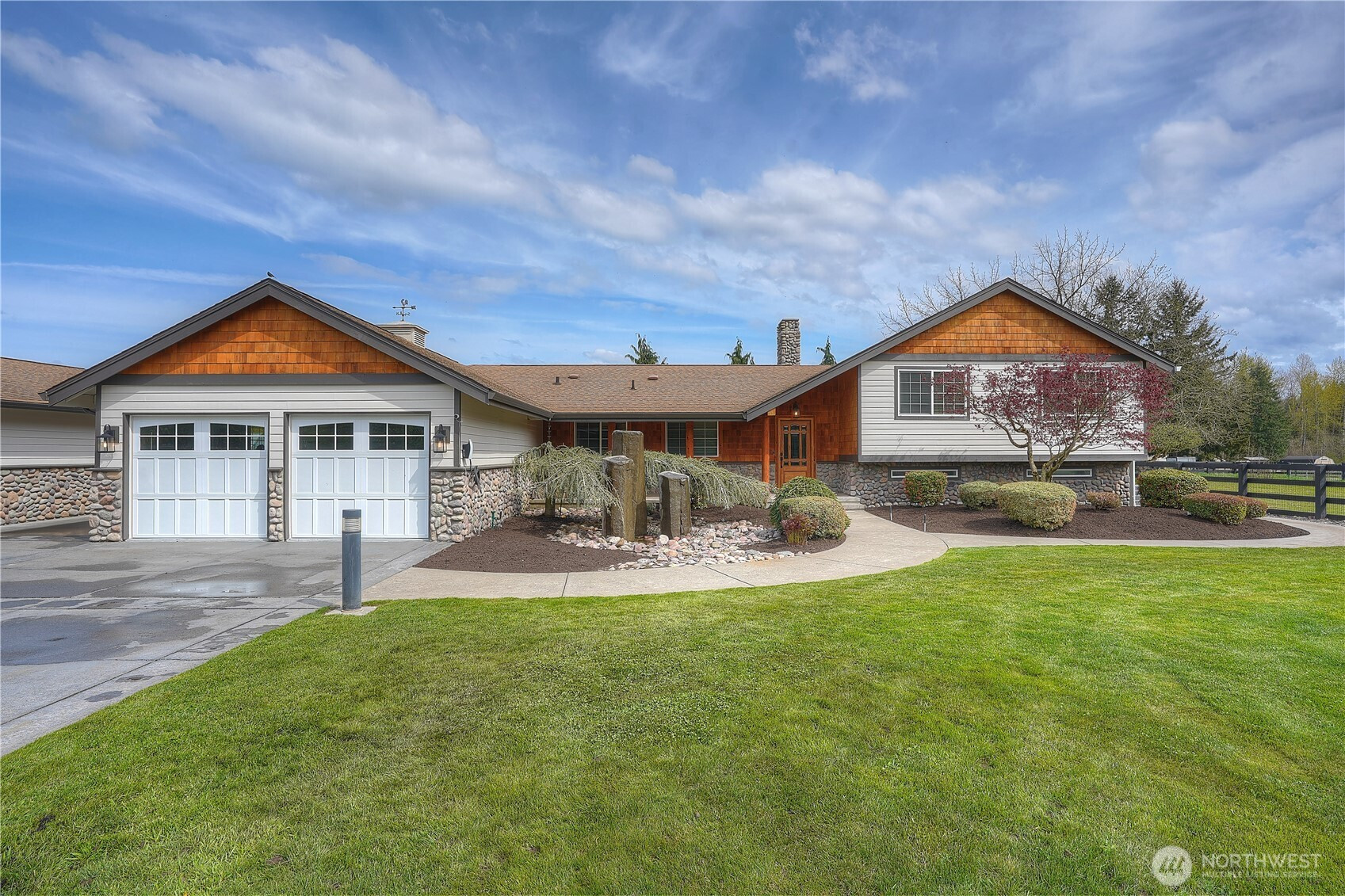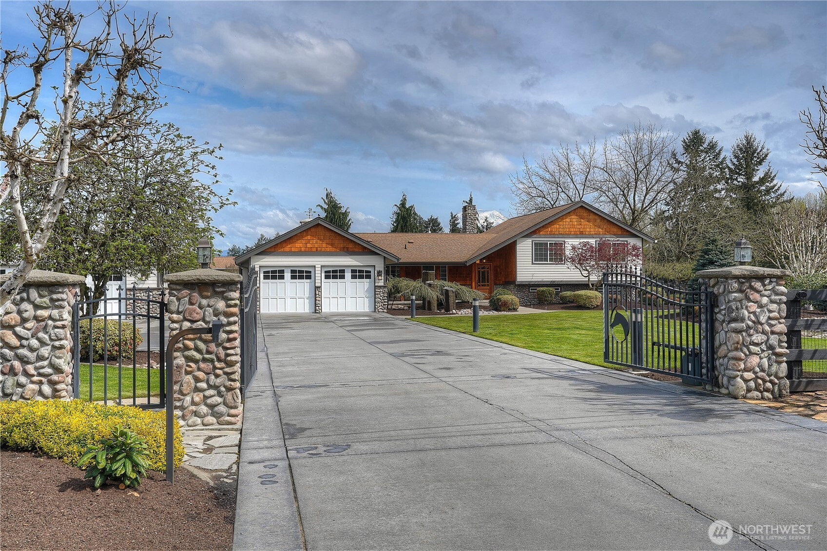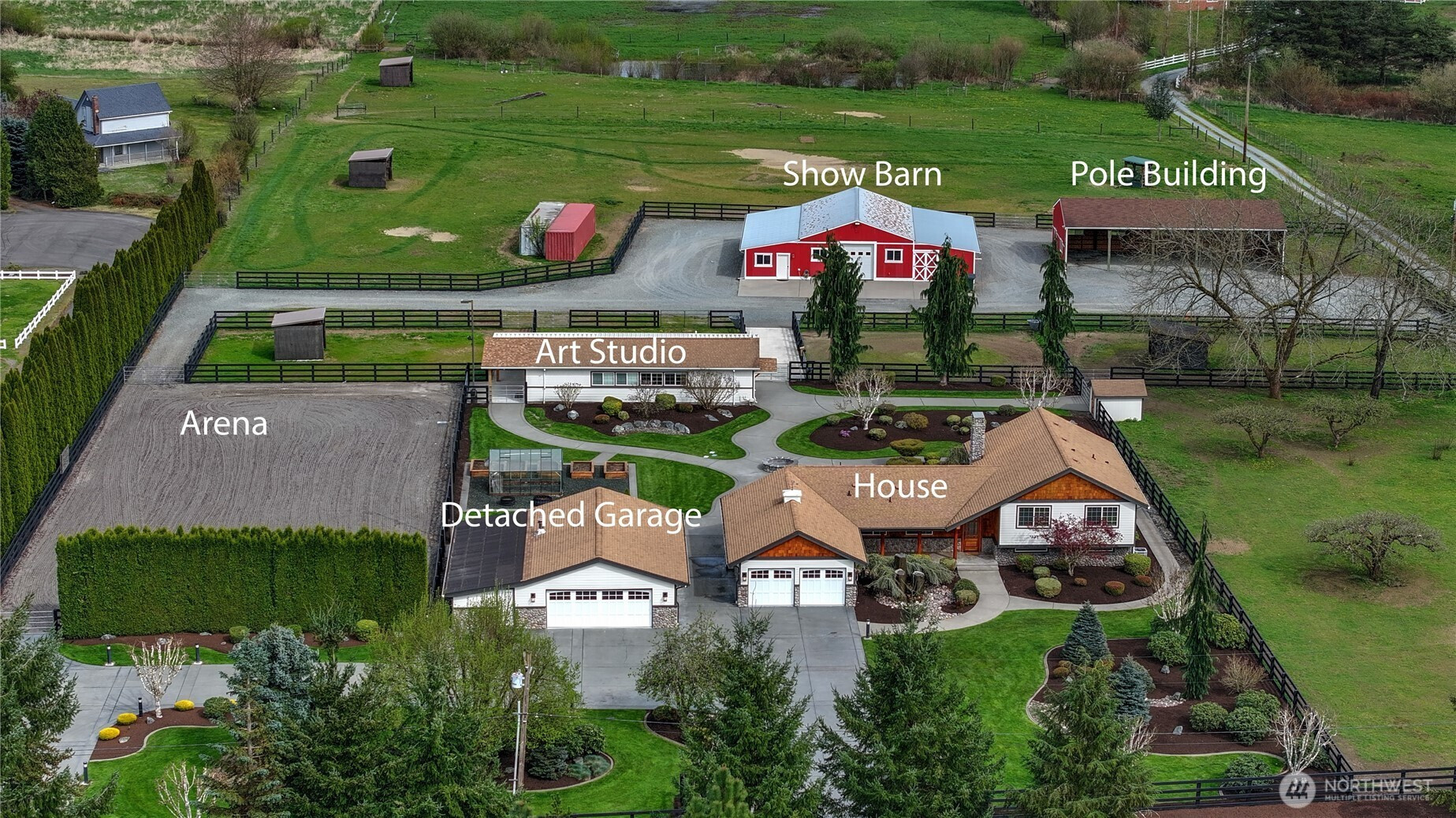 This one checks ALL the boxes!! An exceptional 10-acre equestrian estate with Mt. Rainier views, designed for horse enthusiasts, hobby farmers, or anyone seeking space, beauty, and versatility. Enter through custom wrought iron gates with stone columns and onto impeccably maintained grounds framed by mature landscaping and wide-open pastures. The tastefully updated 3-bedroom home blends comfort & luxury with a chef’s kitchen featuring high-end stainless appliances, granite countertops and custom tile back splash, open living spaces, and a spacious owner’s suite with fireplace, spa-inspired bath, huge walk-in closet, and French doors which leads to a private patio with hot tub. A finished 1,000sf detached art studio with ¾ bath extends your living space, and adds flexible area ideal for a home office, gym, bonus room or your creative needs! The 8-stall show barn features power, water, tack room, and feed storage, while the 160x75 outdoor arena offers all-weather footing & lighting. A 60x30 detached 5-bay pole barn/building provides abundant space for equipment, RVs, vehicles, or workshop use. The property is fully fenced & cross-fenced with dual access with plenty of room to turn your horse trailers or big rigs around and is perfectly tailored for heavy equipment or the most discerning mechanic's desires. This remarkable property delivers it all - space, style, and endless possibilities, every detail has been thoughtfully curated - move in ready, versatile, & unforgettable.
