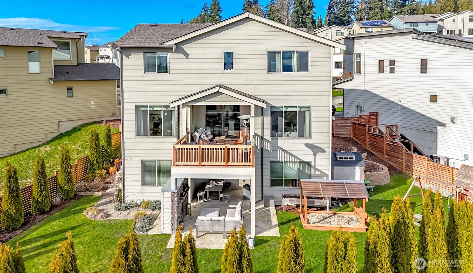 All square footage is not created equal. The offering of this exceptional Edgewood view residence delivers refined living across three fully finished levels. Thoughtfully designed for flexibility and elevated entertaining, the home blends luxury finishes with spaces ideal for multigenerational living. The main level showcases an open-concept kitchen, dining, living area and coffee bar designed for gathering and making memories. Complemented by a ¾ bath, mudroom, and private den or guest suite. Expansive outdoor living extends seamlessly from the interior, creating a true indoor-outdoor experience. Upstairs, the grand primary suite offers a retreat-like setting with a spa-inspired bath and generous proportions. Two additional oversized bedrooms, a full bath, and a spacious laundry room with utility sink provide both comfort and function. The lower-level lives as private quarters, featuring open living space, a full bedroom and bath, and a stunning covered stamped-concrete patio with outdoor gas fireplace—perfect for extended living, long-term guests, or private retreat space. Beautifully designed grounds provide privacy and tranquility. Sweeping views of the mountains, sound, and city are captured from every floor. High-end LVP, crisp white millwork, shiplap detailing, custom railing, clean white quartz, and designer ceramic tile reflect quality craftsmanship throughout.