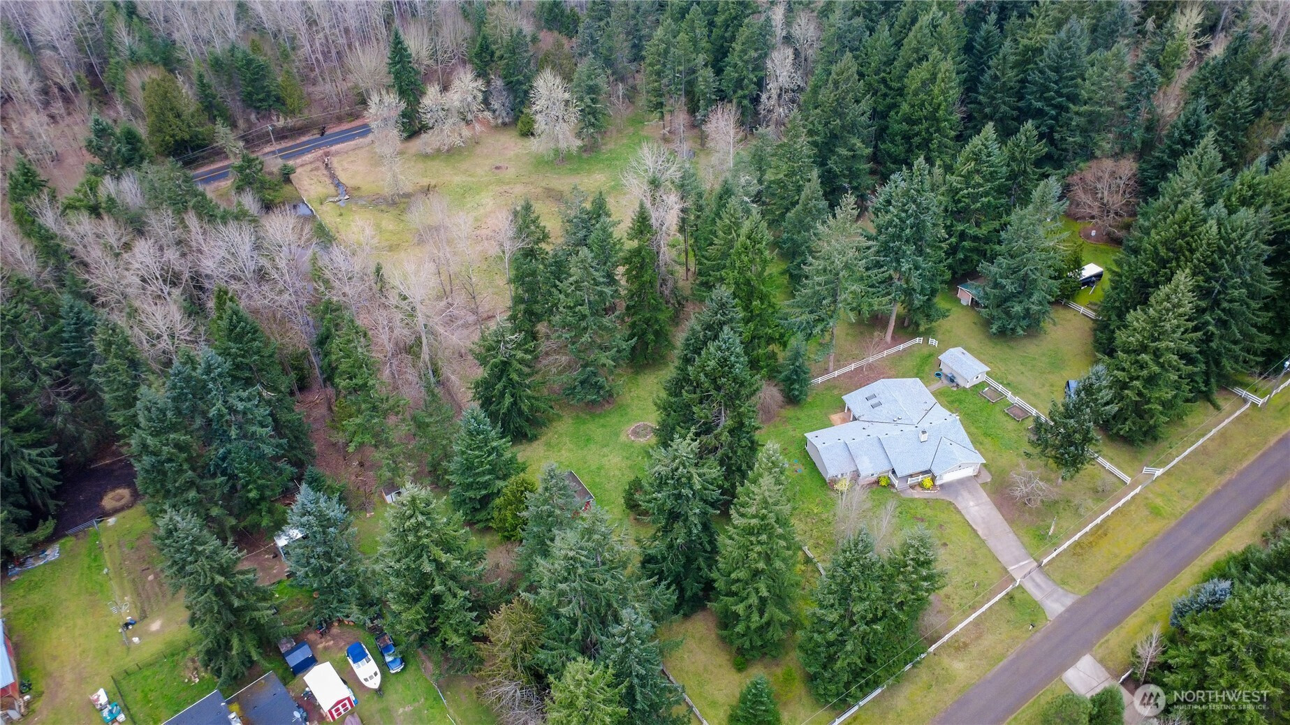 Welcome to peaceful country living in Roy, WA! This beautifully updated equestrian-friendly rambler sits on 5 fully fenced and cross-fenced acres in a desirable rural neighborhood. Horse lovers will appreciate the 3-stall barn, animal-ready outbuildings, and secure electric gate offering both convenience and privacy. Inside, the spacious open-concept layout features an enormous kitchen with abundant cabinetry, generous living areas, and large bedrooms. A stunning 400 sq ft great room addition creates the perfect space for entertaining or relaxing while enjoying serene property views. The primary bath has been thoughtfully upgraded, and a mini-split system provides efficient heating and A/C year-round. Step outside to a custom covered patio with skylights—ideal for gatherings or quiet evenings. The property also offers mature cherry, apple, pear, almond, hazelnut and walnut trees, , raised garden beds, and space for animals, hobbies, or simply enjoying the quiet country lifestyle. New roof on the home and shed adds peace of mind, while the garage workshop area is perfect for projects and storage. Experience the charm of rural living with room to roam, ride, and grow—yet still within easy reach of nearby amenities. Easy access to JBLM.
