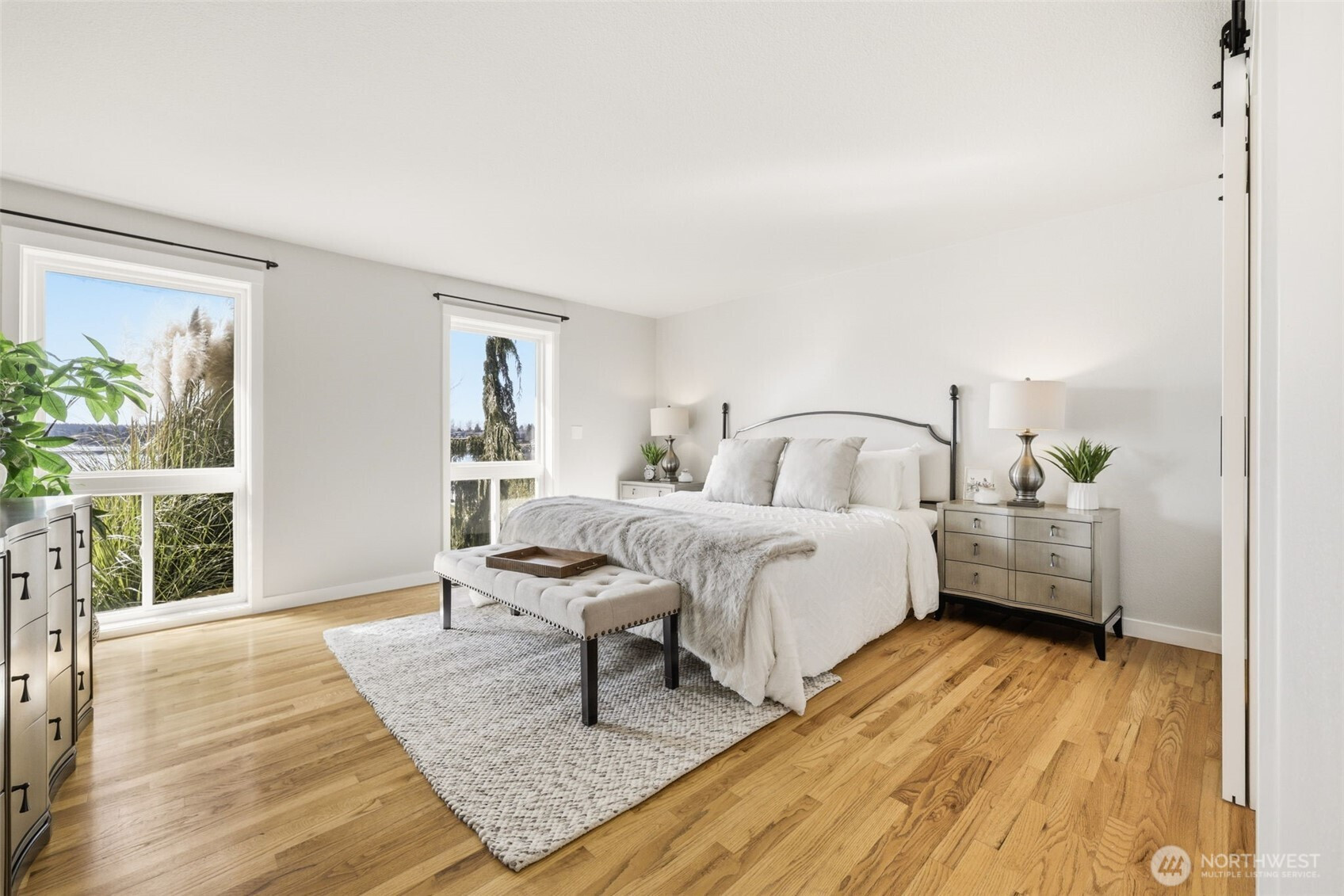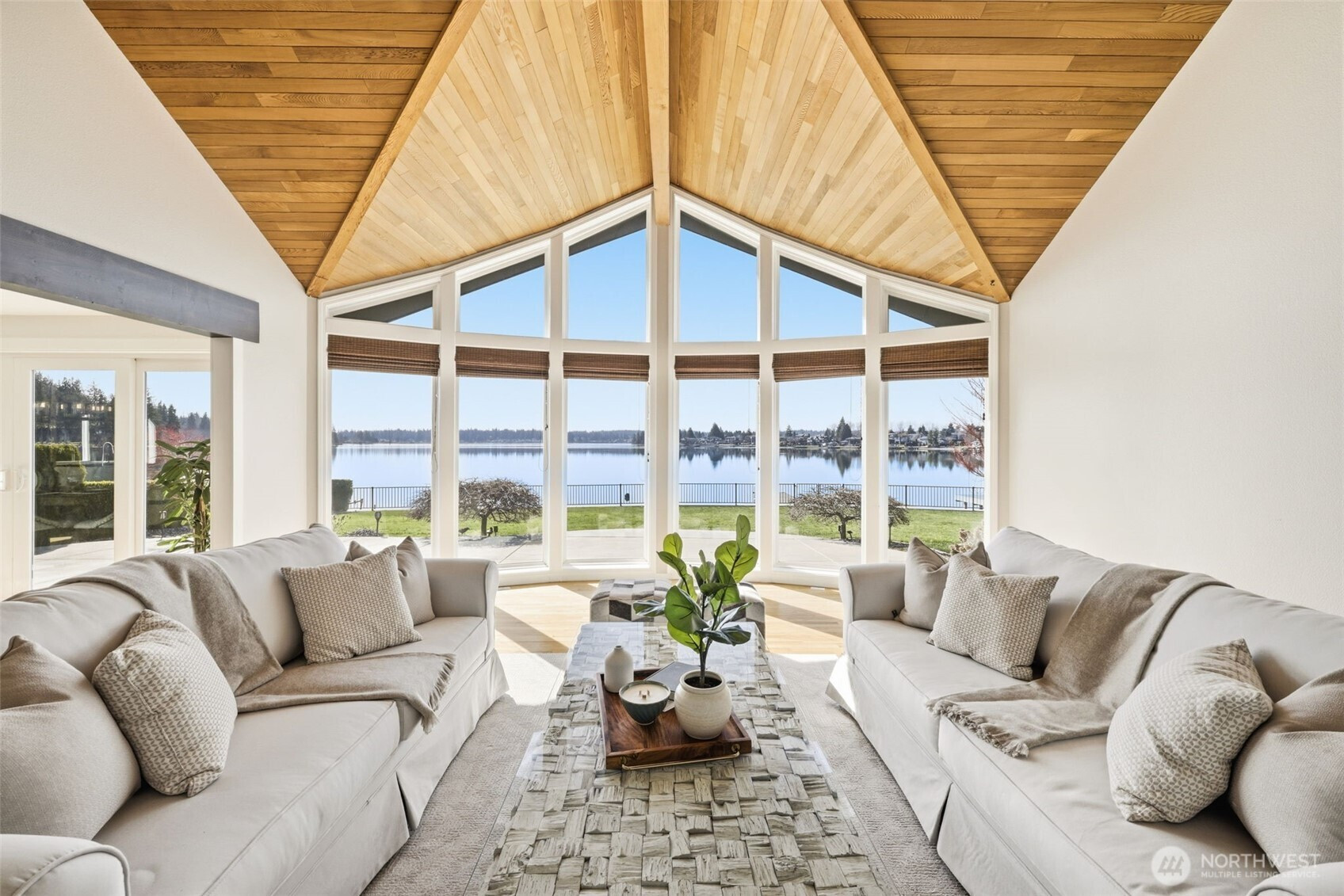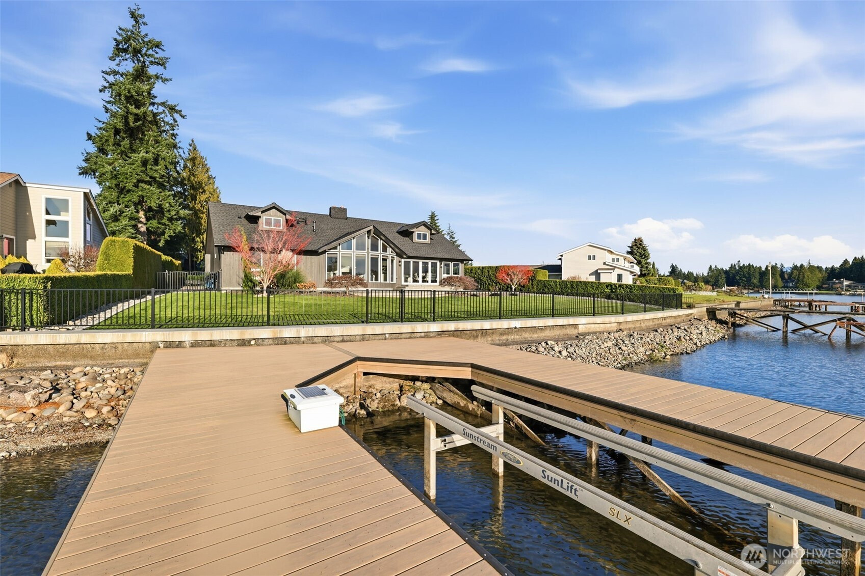 Exceptional Tapps Island waterfront home situated on a rare no-bank lot with 87 feet of pristine Lake Tapps frontage, offering sweeping open-water views and a stunning backdrop of Mt. Rainier. Designed to capture the beauty of the lake, this home offers over 3,064 square feet of living space with dramatic floor-to-ceiling windows showcasing breathtaking lake views throughout. The impressive great room features vaulted ceilings and expansive windows, creating a light-filled space that flows seamlessly to the outdoors. The oversized kitchen and spacious dining area were designed for entertaining, offering abundant counter space, a large island, and sliding doors leading to the expansive patio overlooking the lake. The main-floor primary suite features beautiful lake views, a spacious bath with large walk-in shower, and an oversized walk-in closet. A large main-floor media room or office provides flexible living space. Upstairs you’ll find two spacious bedrooms with lake views and an updated full bathroom. The flat backyard is truly an entertainer’s dream with a large patio overlooking the water, perfect for gatherings and relaxing lakeside. Waterfront amenities include an expansive dock with slip, ideal for boating and lake recreation. A detached garage connected by a portico provides excellent space for vehicles and lake toys. Presidential 50-year roof in 2023. Located in the Tapps Island community with golf, parks, and Dieringer Schools.