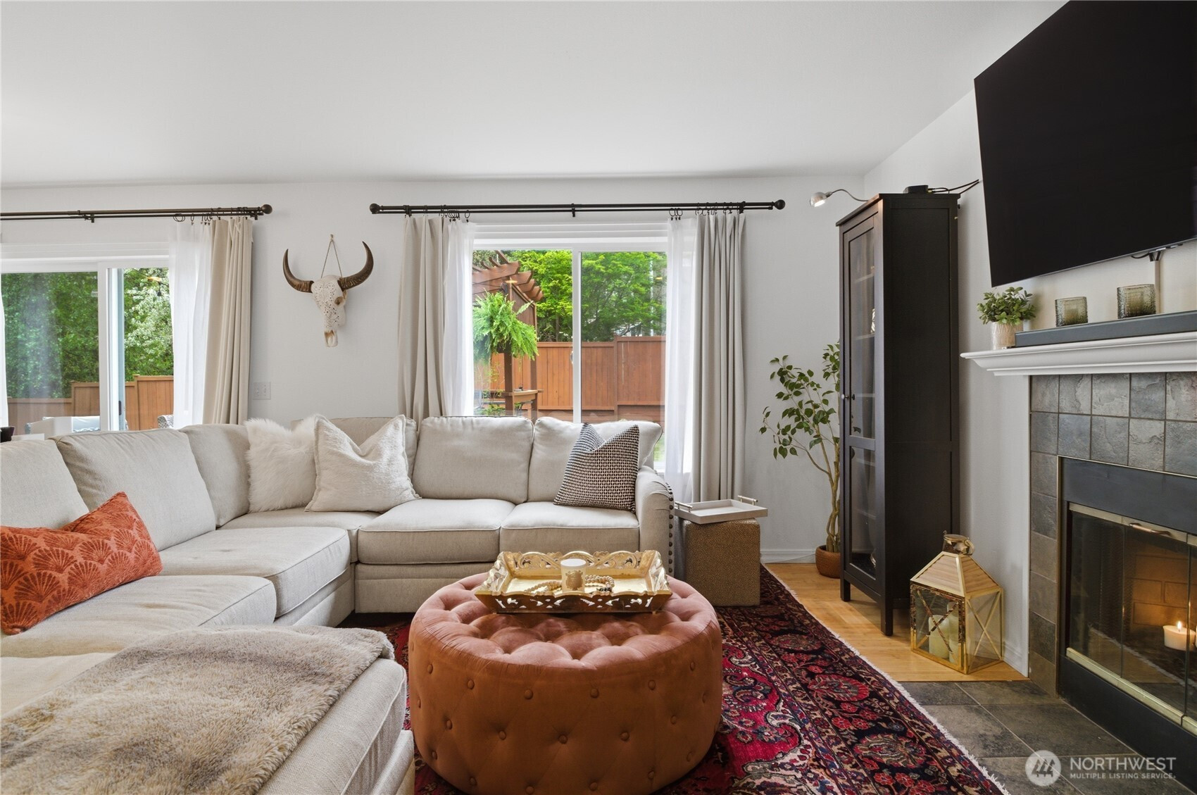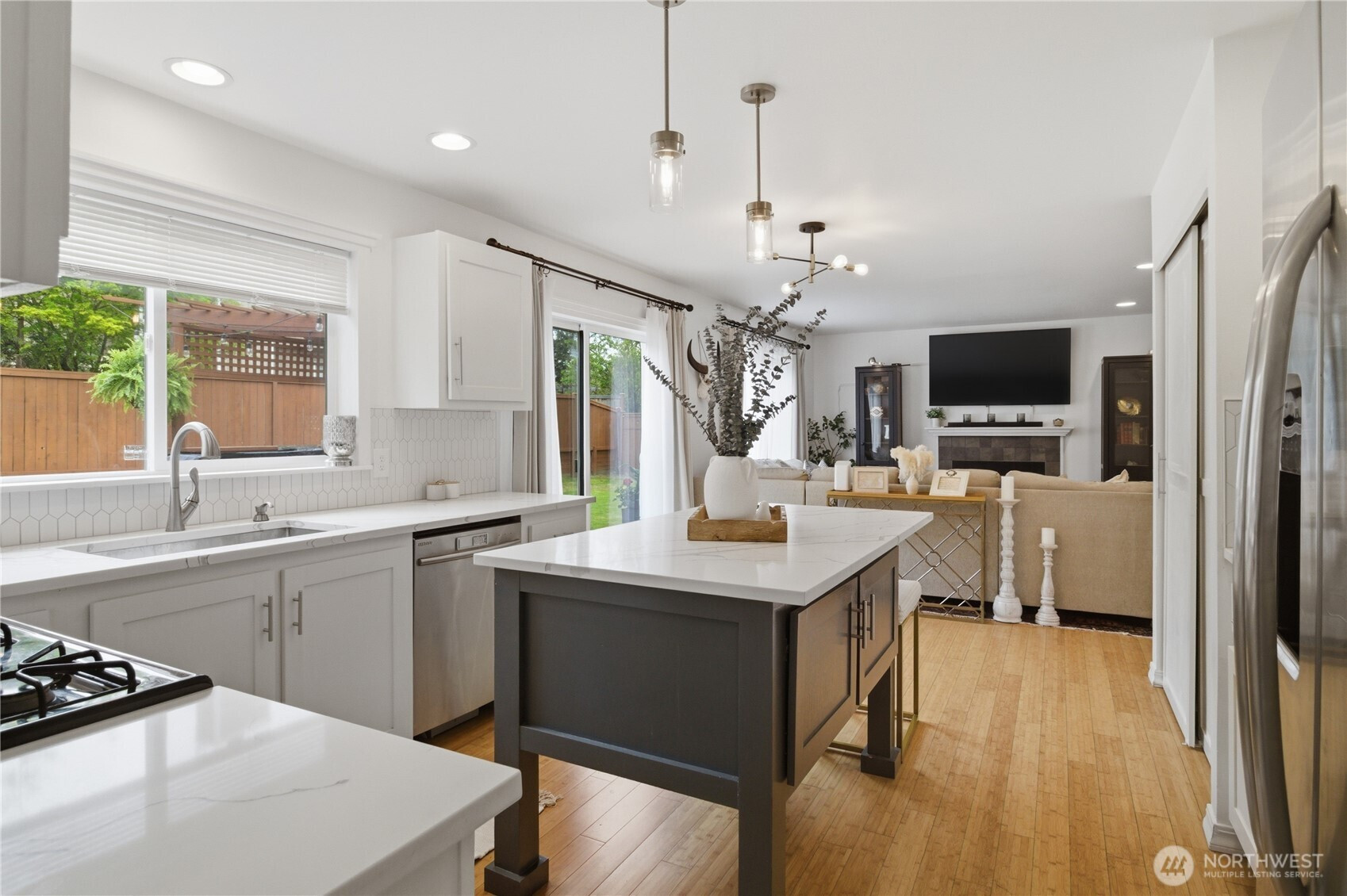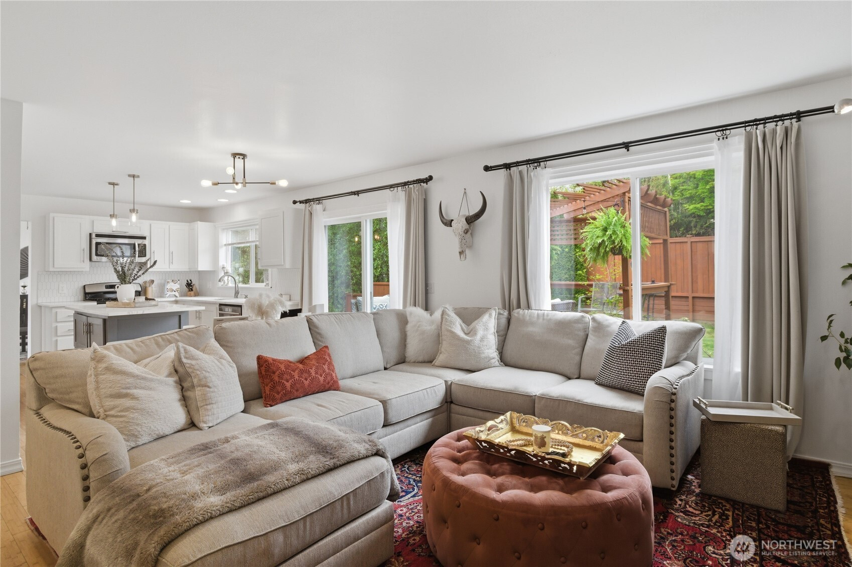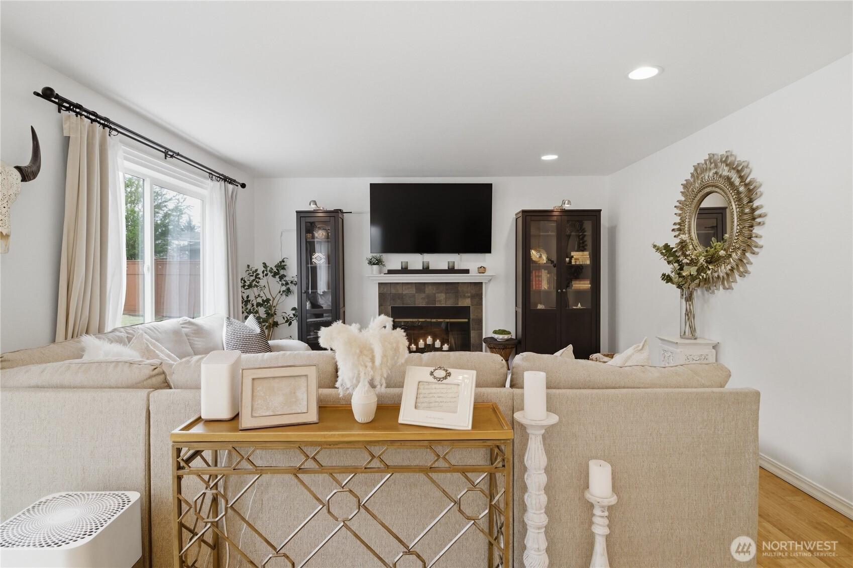 Perched above it all in sought-after Crystal Ridge, this 4-bedroom home offers an elevated lifestyle in every sense. Just shy of 2,000 sq ft, the design lives far beyond its size, defined by light, privacy, and beautifully curated finishes. Set on a quarter-acre cul-de-sac lot with lush greenbelt views, every inch has been thoughtfully updated. Soaring ceilings and dramatic windows fill the home with natural light, highlighting bamboo floors, statement lighting, and high-end details throughout. The kitchen stuns with quartz counters, custom backsplash, gas range, and pendant lighting. Cozy family room with wood-burning fireplace, statement powder bath, main floor laundry, and garage with storage. Upstairs, a true primary retreat features an accent wall, hidden access to a large walk-in closet, second closet, and dual vanity ensuite. Three additional bedrooms, full bath, and a spacious landing complete the upper level. Expansive deck with pergola overlooks a lush backyard with new fencing, ideal for entertaining. New A/C in 2024. Minutes to Puyallup, Sumner, Sounder station, and JBLM- this is where lifestyle and design truly come together.