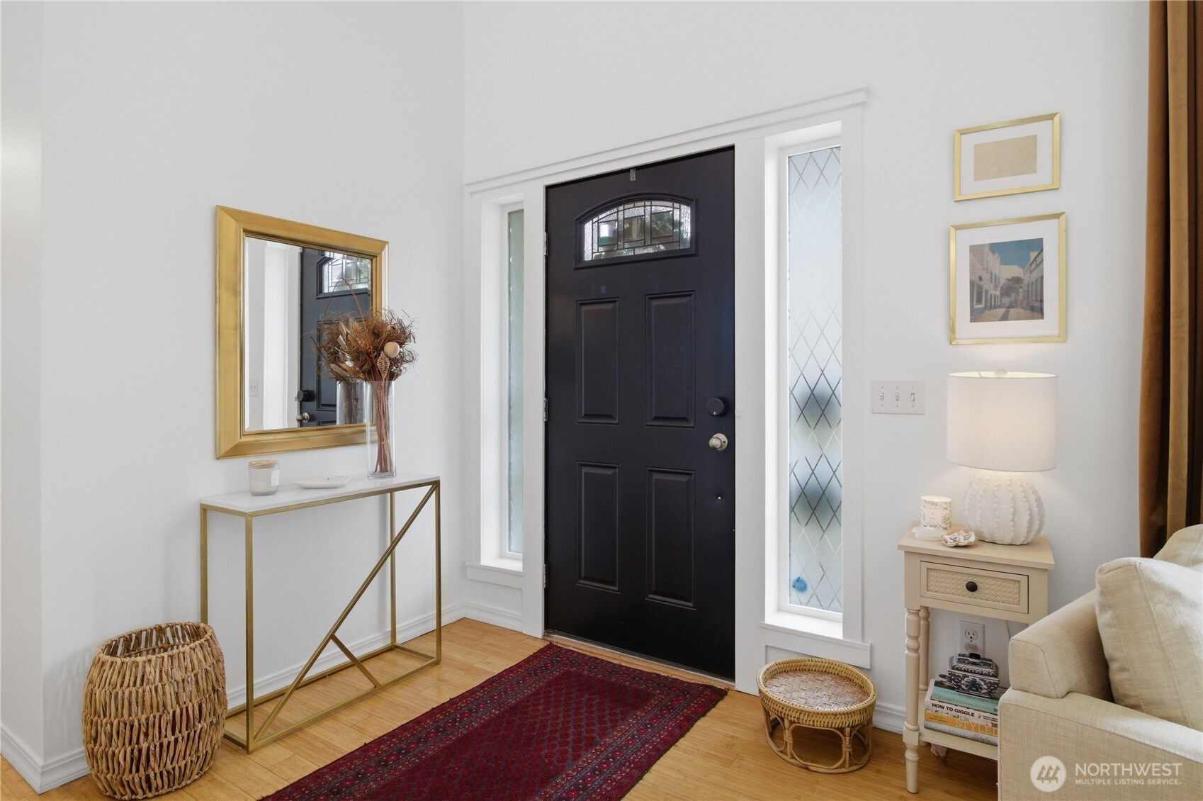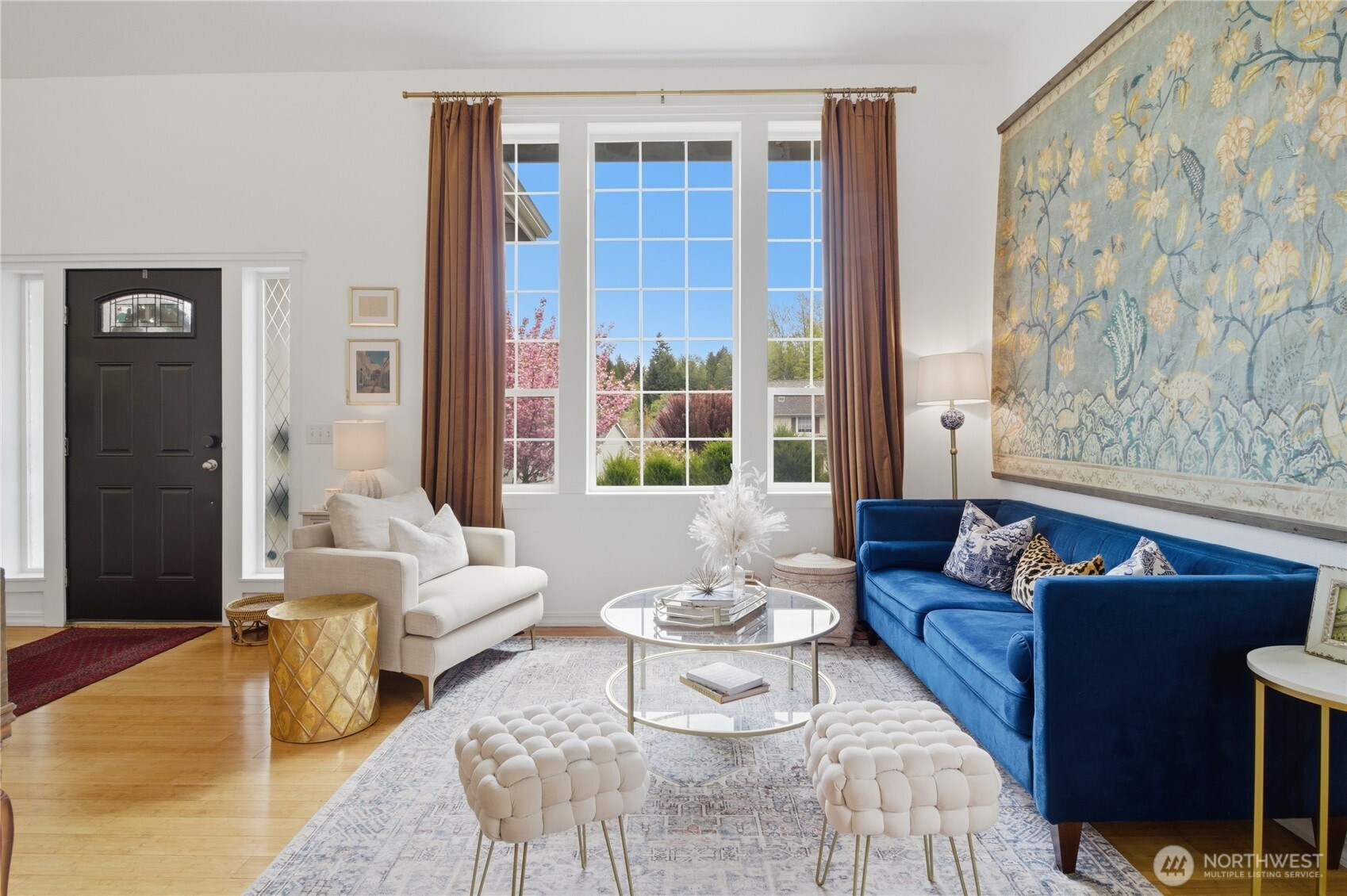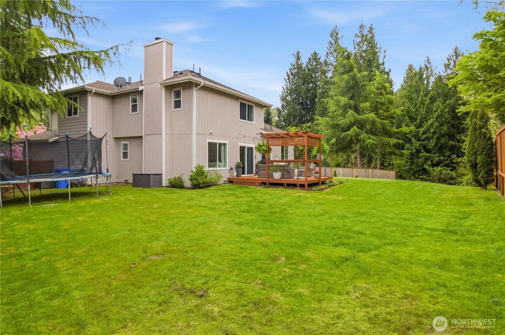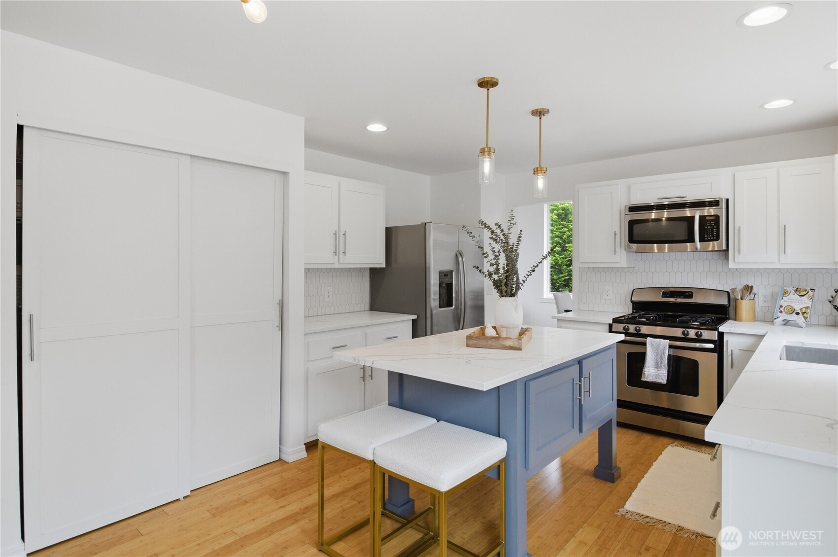Perched above it all in sought-after Crystal Ridge, this 4-bedroom home offers an elevated lifestyle in every sense. Just shy of 2,000 sq ft, the design lives far beyond its size, defined by light, privacy, and beautifully curated finishes. Set on a quarter-acre cul-de-sac lot with lush greenbelt views, every inch has been thoughtfully updated. Soaring ceilings and dramatic windows fill the home with natural light, highlighting bamboo floors, statement lighting, and high-end details throughout. The kitchen stuns with quartz counters, custom backsplash, gas range, and pendant lighting. Cozy family room with wood-burning fireplace, statement powder bath, main floor laundry, and garage with storage. Upstairs, a true primary retreat features an accent wall, hidden access to a large walk-in closet, second closet, and dual vanity ensuite. Three additional bedrooms, full bath, and a spacious landing complete the upper level. Expansive deck with pergola overlooks a lush backyard with new fencing, ideal for entertaining. New A/C in 2024. Minutes to Puyallup, Sumner, Sounder station, and JBLM- this is where lifestyle and design truly come together.