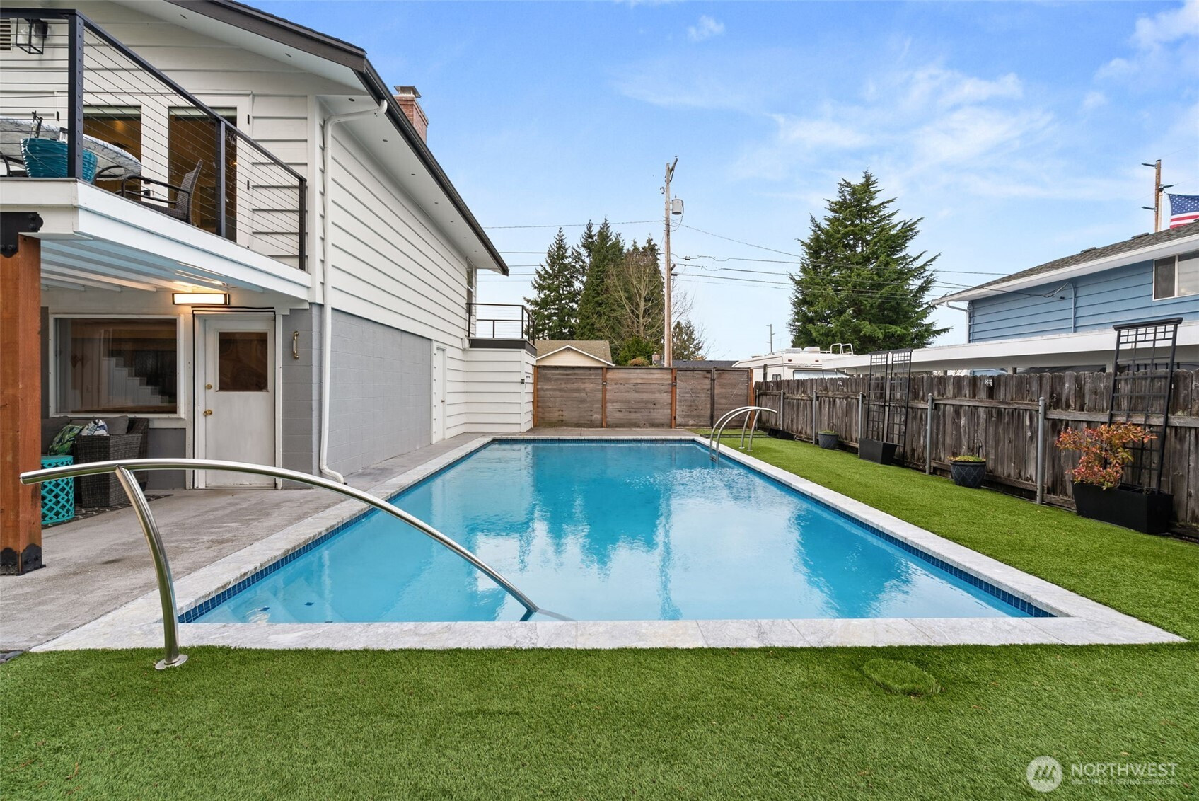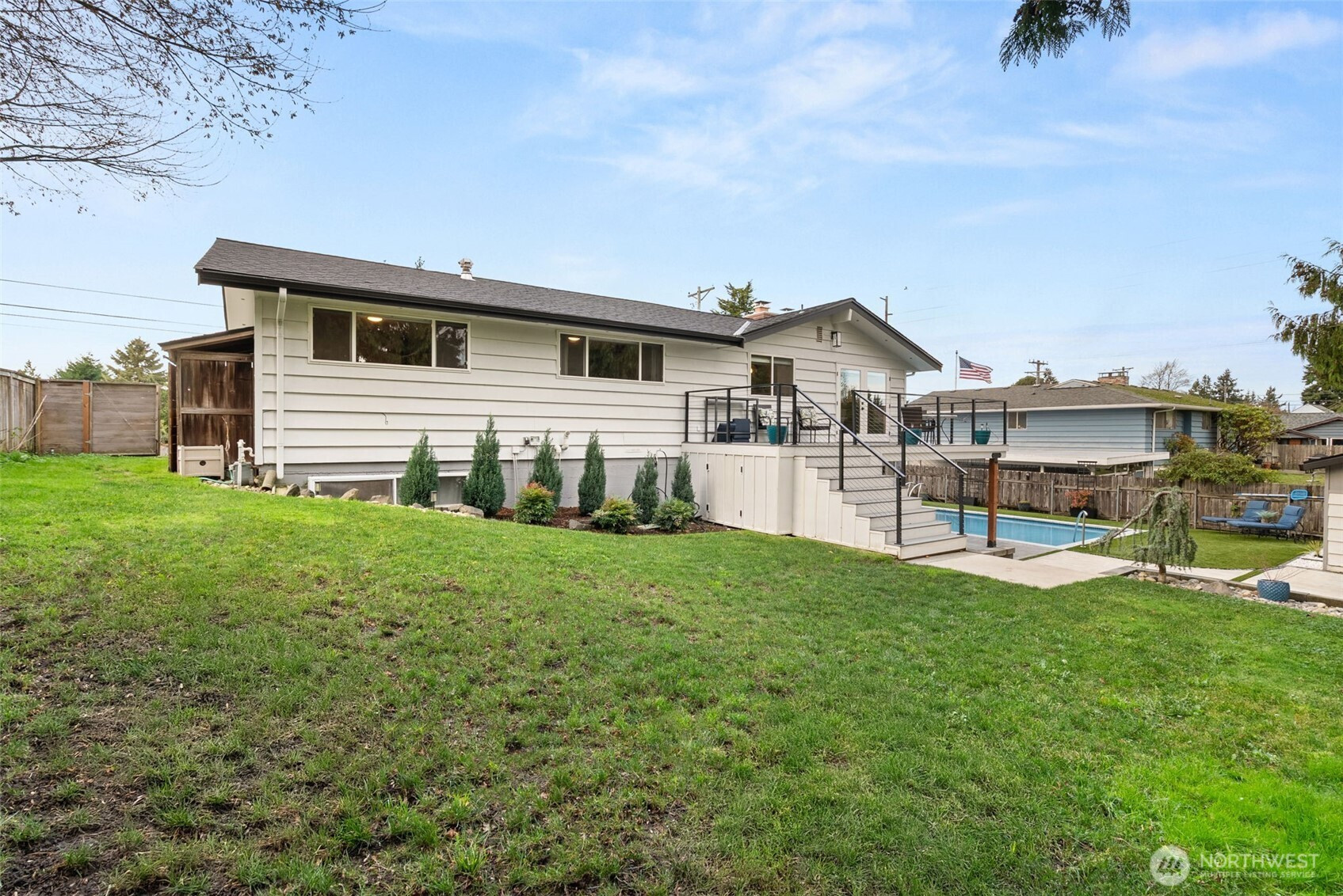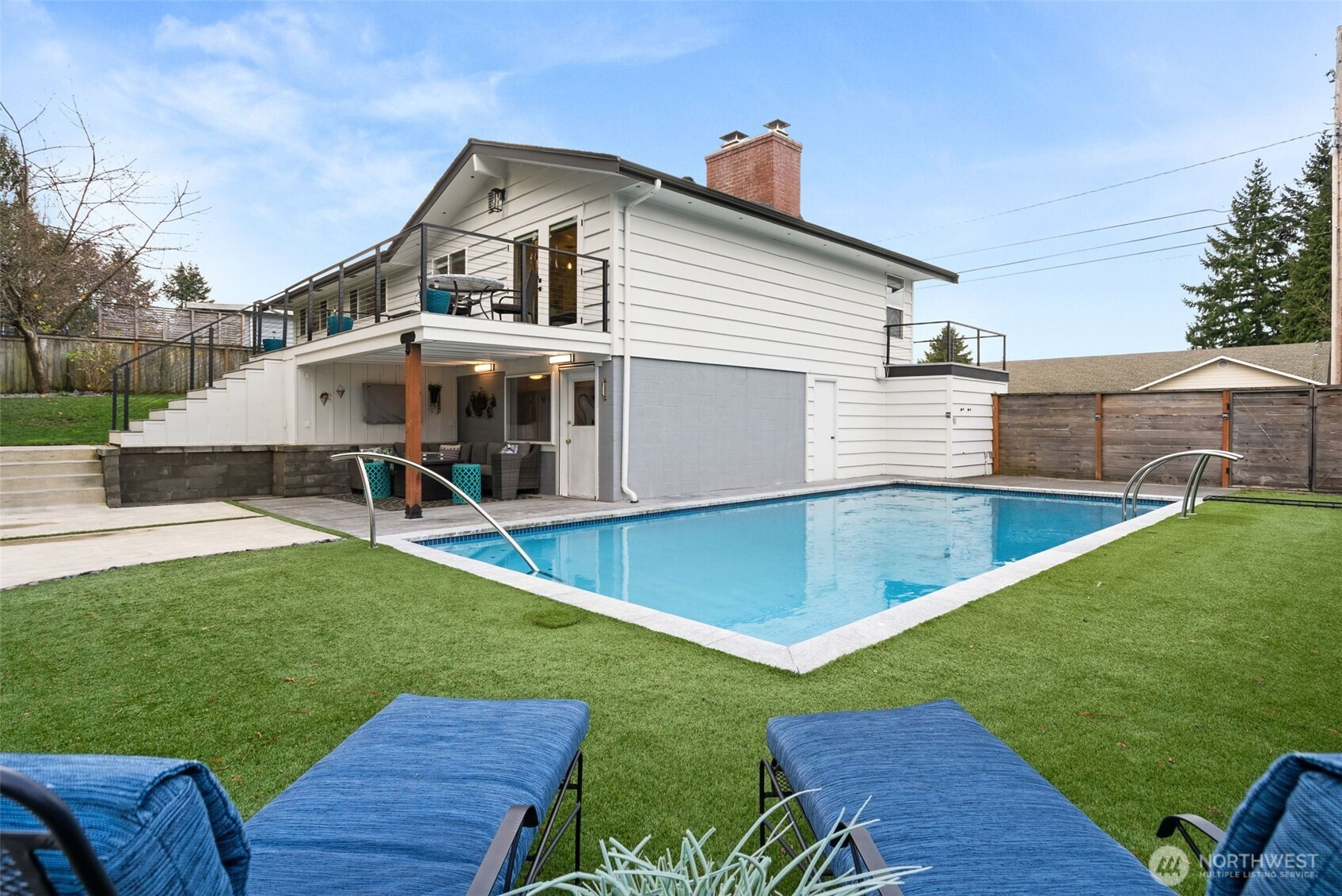 Here it is! Reimagined mid-century gem where classic character meets modern updates. Step into gleaming orig hardwoods & bright, airy spaces. High vaults, open beams & 3-sided FP highlight iconic architectural lines. Entertainer's dream: stunning designer kitchen has gas range, stainless appliances, sleek surfaces, smart storage. Dining rm w/French door access to huge deck. Main floor primary offers chic 3/4 bath; +2 add’l BRs & luxe full bath. Downstairs, expansive lounge/game rm has fabulous built-in bar w/bev fridge—your new fave spot for hosting! A 4th BR + 3/4 bath flex for guests or hobbies. Resort-like yard – covered/uncovered gathering areas, dazzling pool w/tiled outdoor shower! You truly can have it all here – make it yours today!