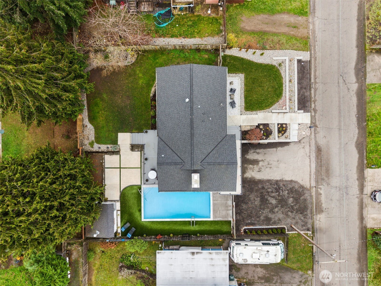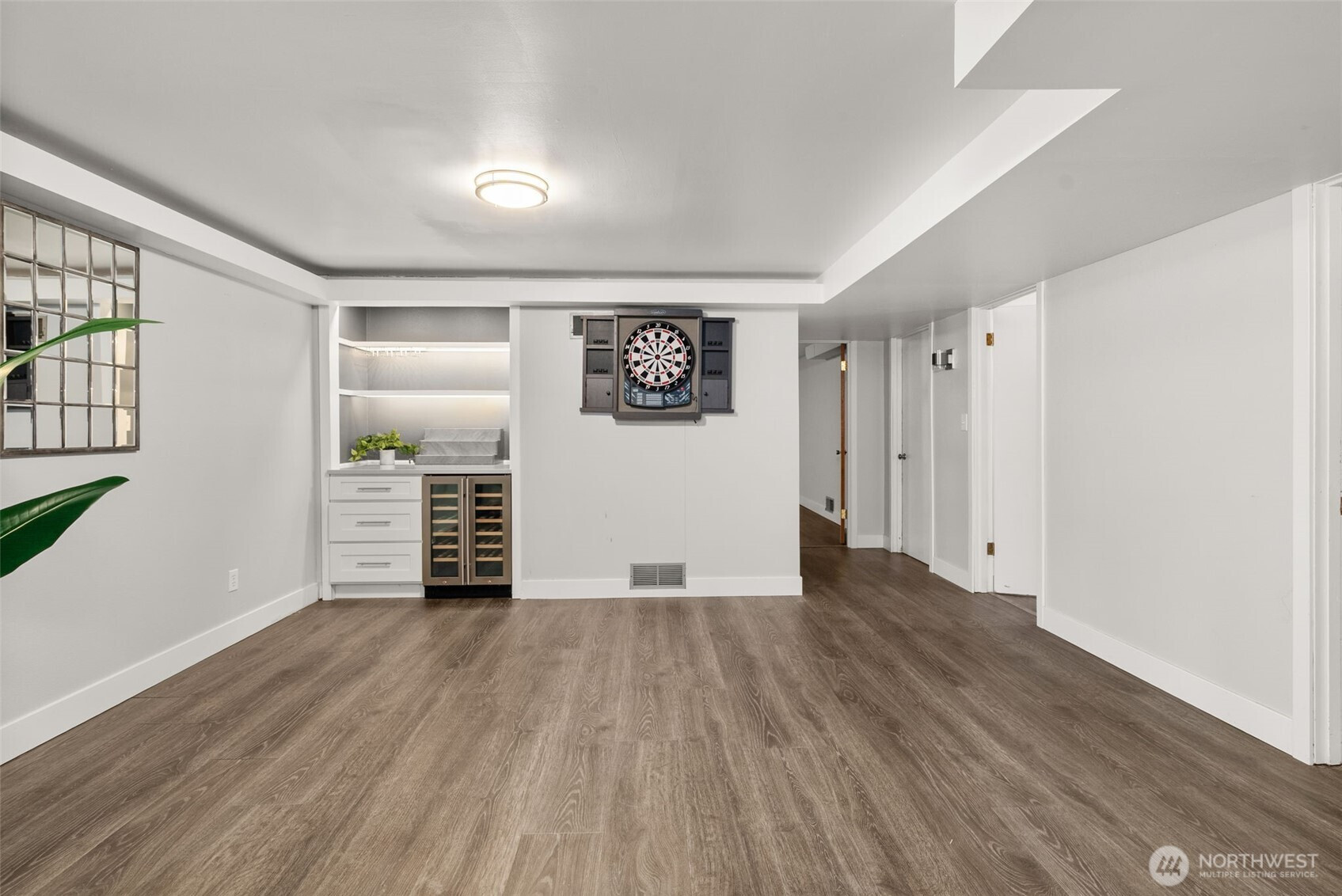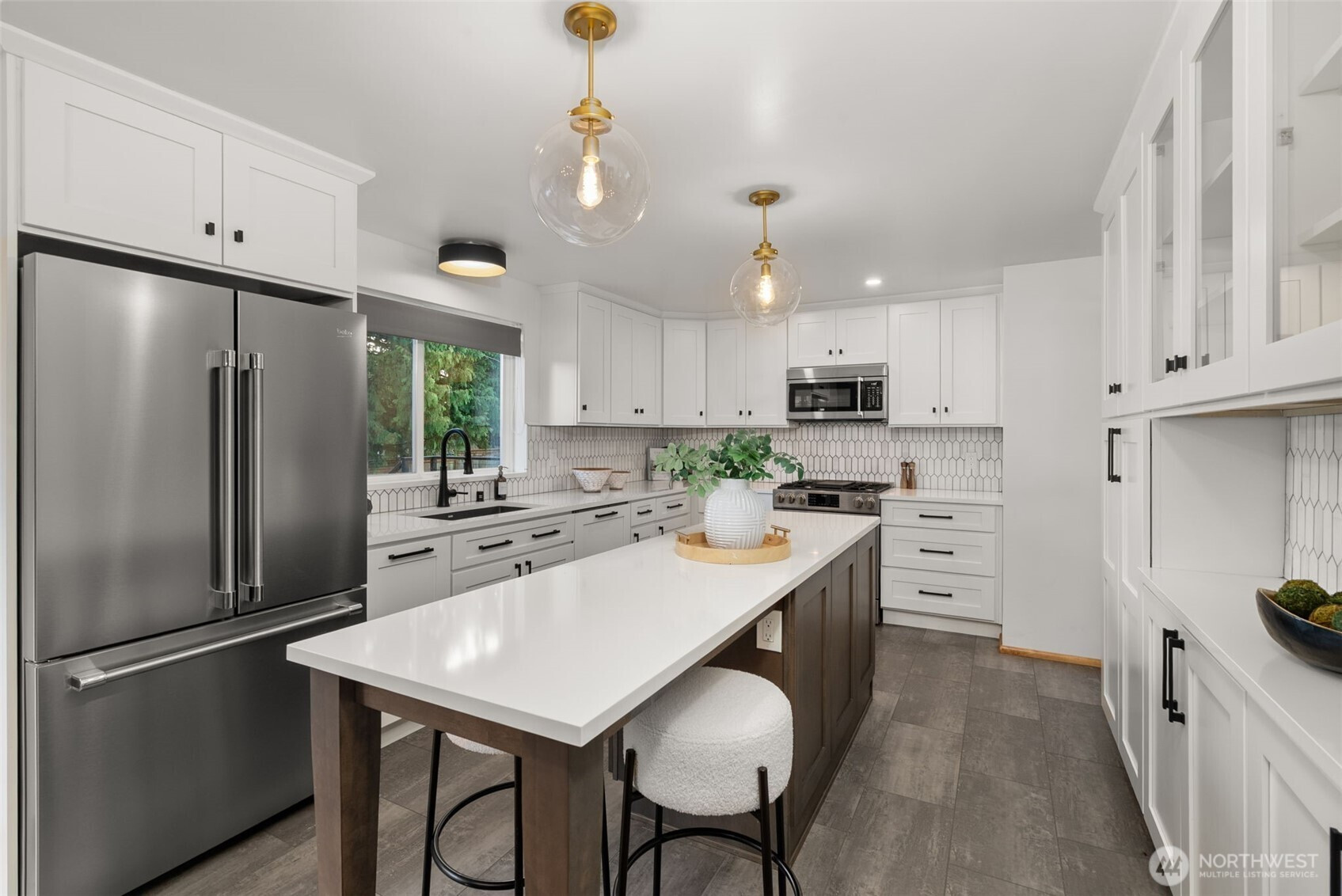 Here it is! Reimagined mid-century gem where classic character meets modern updates. Step into gleaming orig hardwoods & bright, airy spaces. High vaults, open beams & 3-sided FP highlight iconic architectural lines. Entertainer's dream: stunning designer kitchen has gas range, stainless appliances, sleek surfaces, smart storage. Dining rm w/French door access to huge deck. Main floor primary offers chic 3/4 bath; +2 add’l BRs & luxe full bath. Downstairs, expansive lounge/game rm has fabulous built-in bar w/bev fridge—your new fave spot for hosting! A 4th BR + 3/4 bath flex for guests or hobbies. Resort-like yard – covered/uncovered gathering areas, dazzling pool w/tiled outdoor shower! You truly can have it all here – make it yours today!