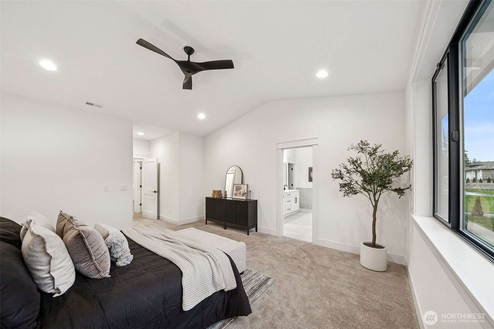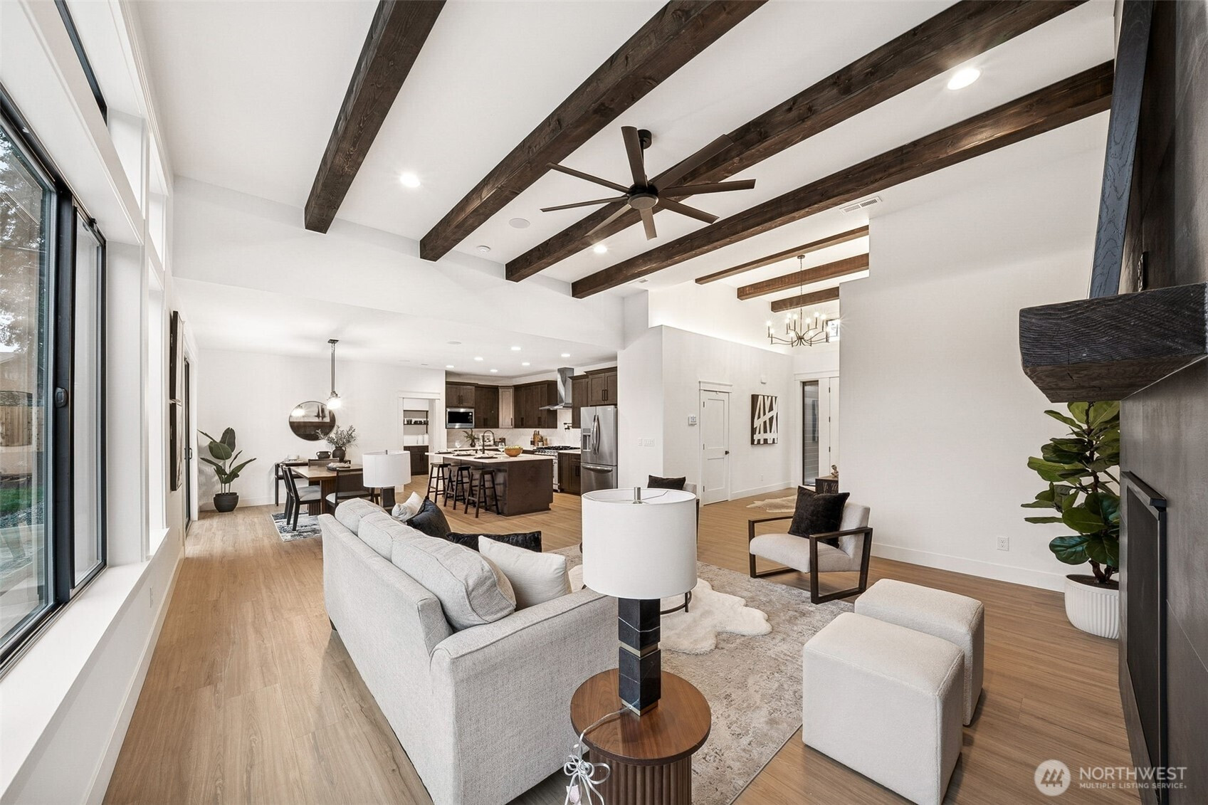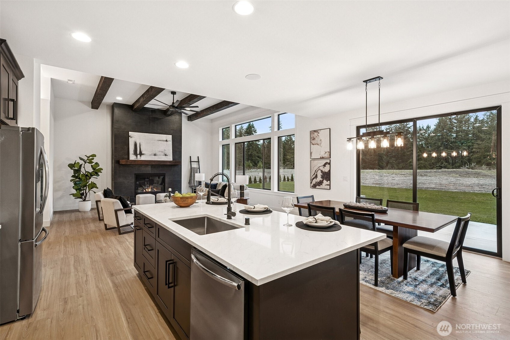 Exceptional new construction home featuring high-end finishes throughout. Step into a bright living room W/vaulted ceilings & stunning custom fireplace wrapped in floor-to-ceiling tile. The gourmet kitchen boasts quartz countertops, a solid full quartz backsplash, 36" Forno range, Frigidaire appliance package, & convenient pot filler. Interior wood-wrapped windows add warmth & craftsmanship, while the luxurious primary suite offers a relaxing spa-inspired bath W/quartz counters, a soaking tub, & beautifully tiled shower. 3 additional bedrooms & full guest bath. RV garage W/14' ceilings, Electric Car charger, & workspace/storage. Fully landscaped front/back + extended back patio complete W/a BBQ stub—ideal for entertaining year-round.