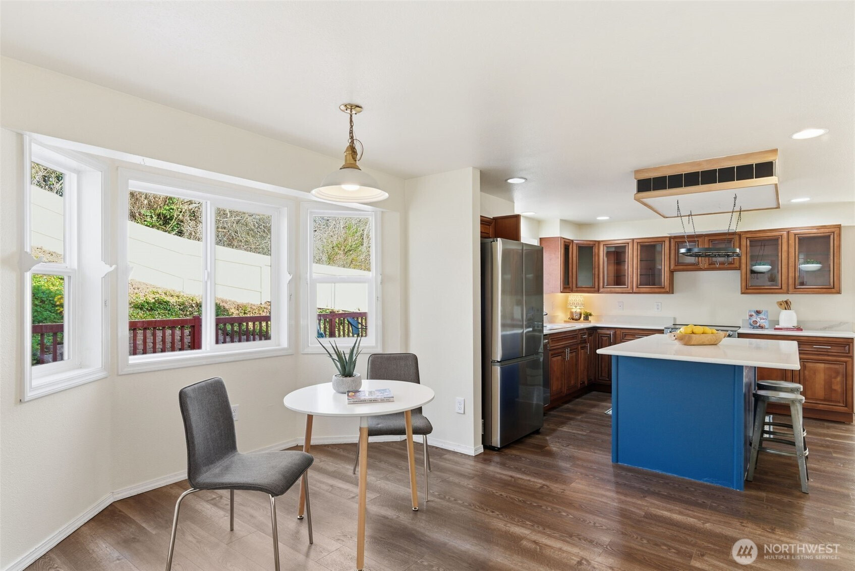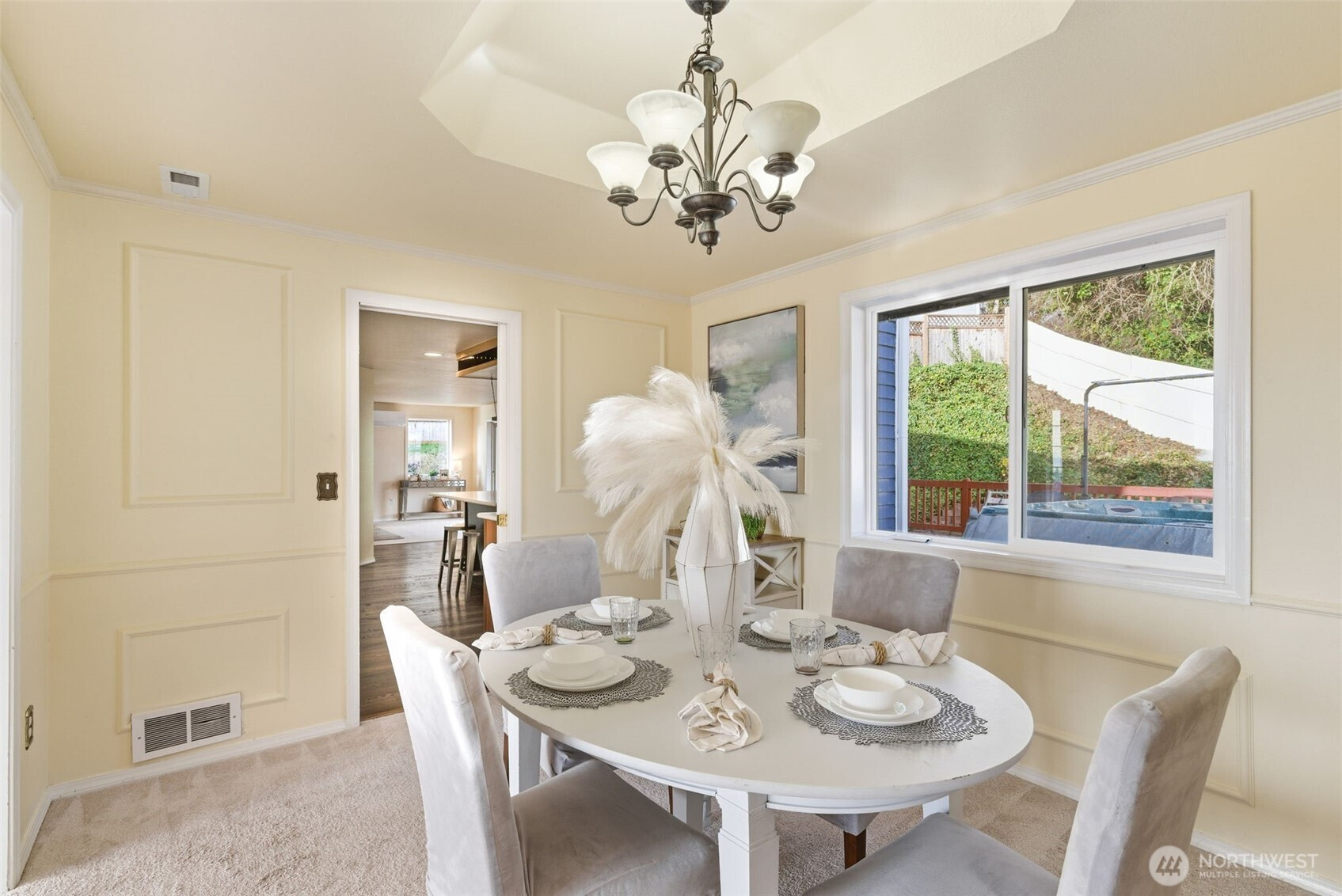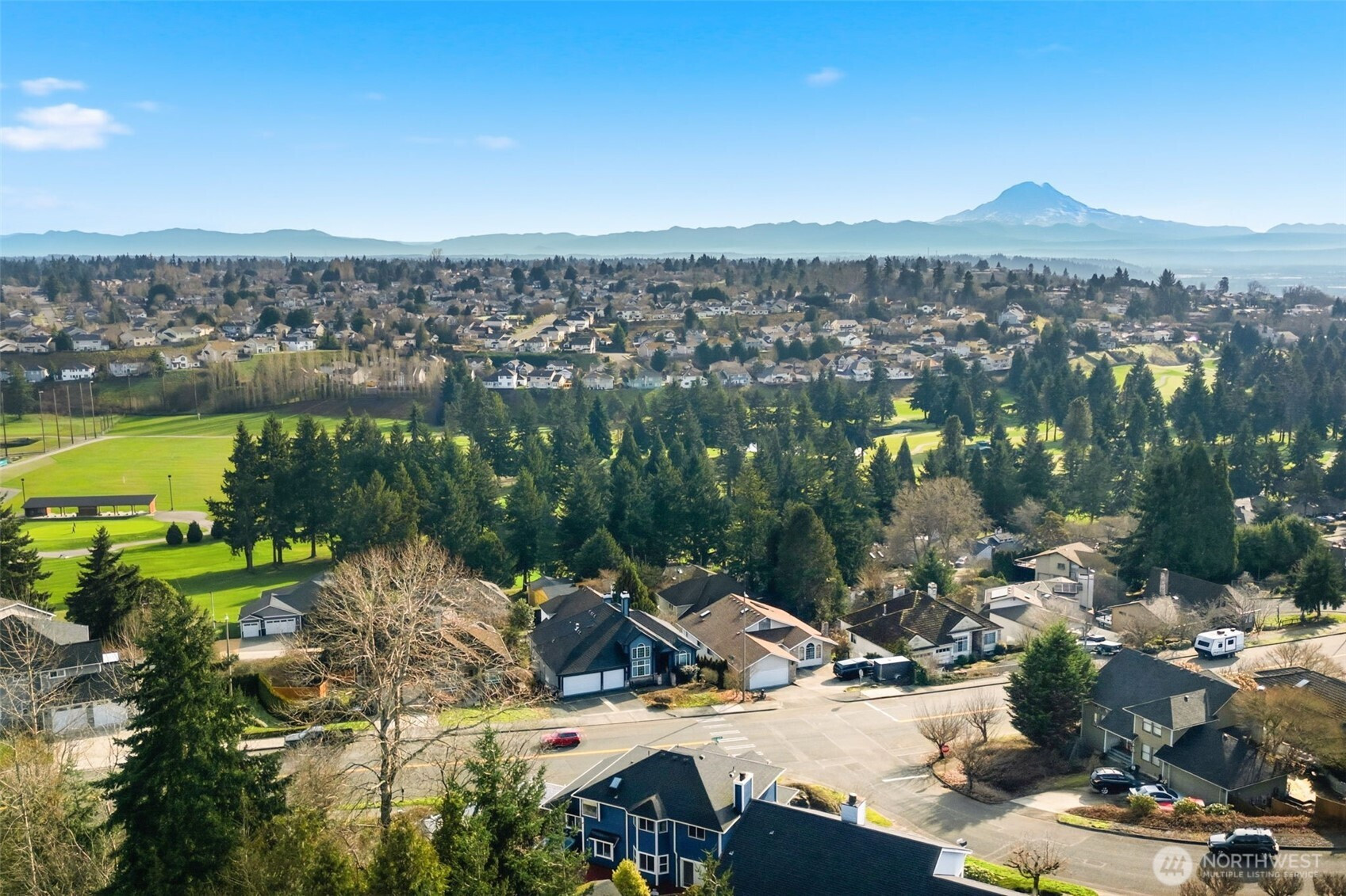 Location truly shines with a large corner lot, and views of the beautiful Mt. Rainier scenery in this spacious 4-bedroom, 2.5-bath NW Contemporary home. Thoughtfully designed at 2,200+ sq ft, the layout offers both comfort and flexibility with formal living and dining spaces, plus an open kitchen and family room with cozy fireplace that's ideal for everyday living and entertaining. Kitchen complete with dining nook, a large useful island with bar seating, walk-in pantry, beautiful cabinetry, stainless appliances, and charming pot rack. Large windows fill the home with natural light, while the expansive deck extends your living space outdoors—perfect for gatherings, relaxing, or enjoying the surrounding scenery. Upstairs, the generous primary suite features a 5-piece bath and ample closet space, accompanied by three additional bedrooms and a full bath. Great sized bedrooms with ample closet space + mini-splits for year round comfort. The attached 2-car garage provides excellent storage, and the corner lot offers added privacy with a fenced yard. Located near Crescent Heights Elementary, Meeker Middle School, North Shore Golf Course, parks, nearby community center, and convenient commuter routes—this is a rare opportunity to own in a sought-after Browns Point area with space, views, and the chance to make it your own.
