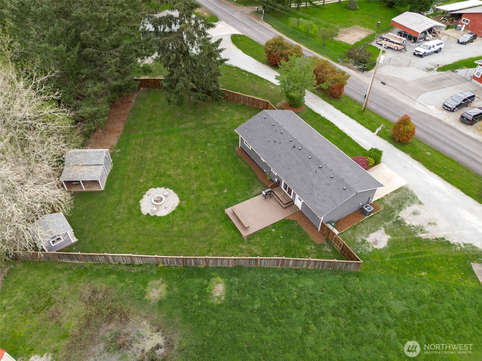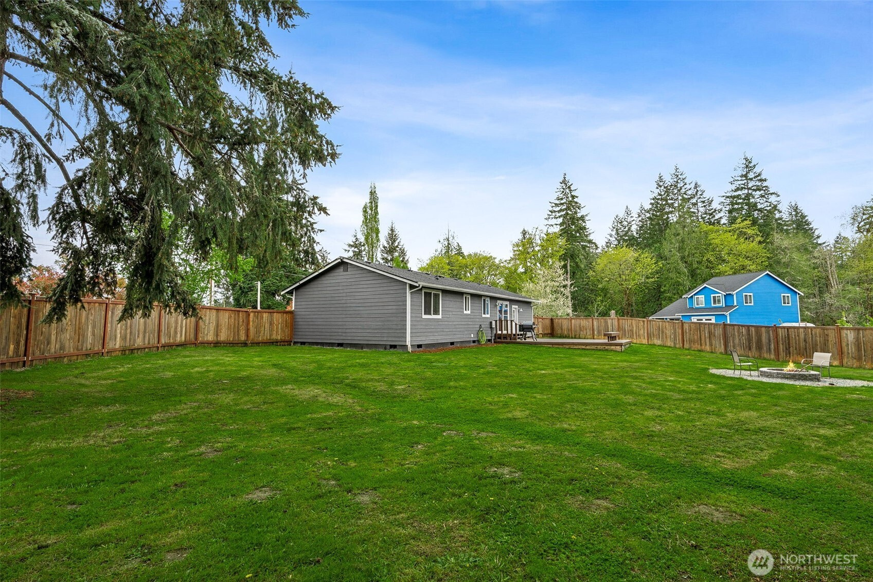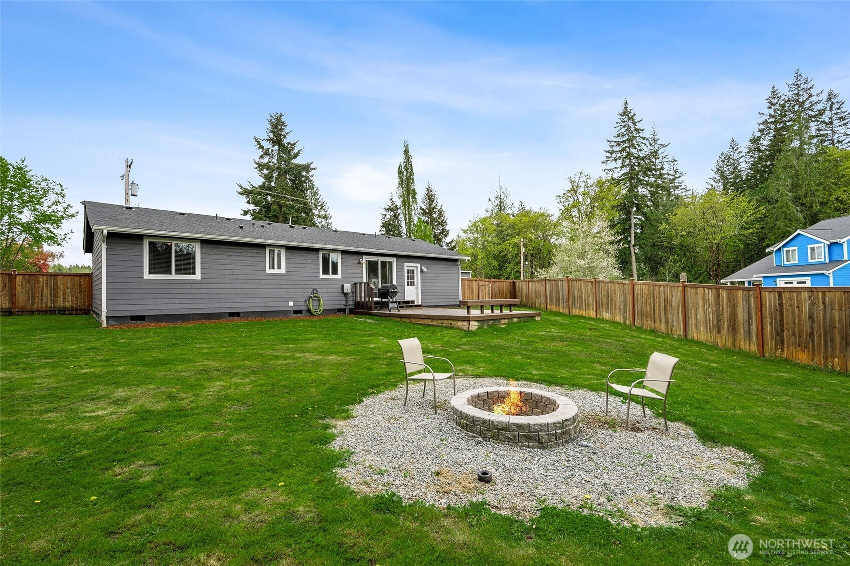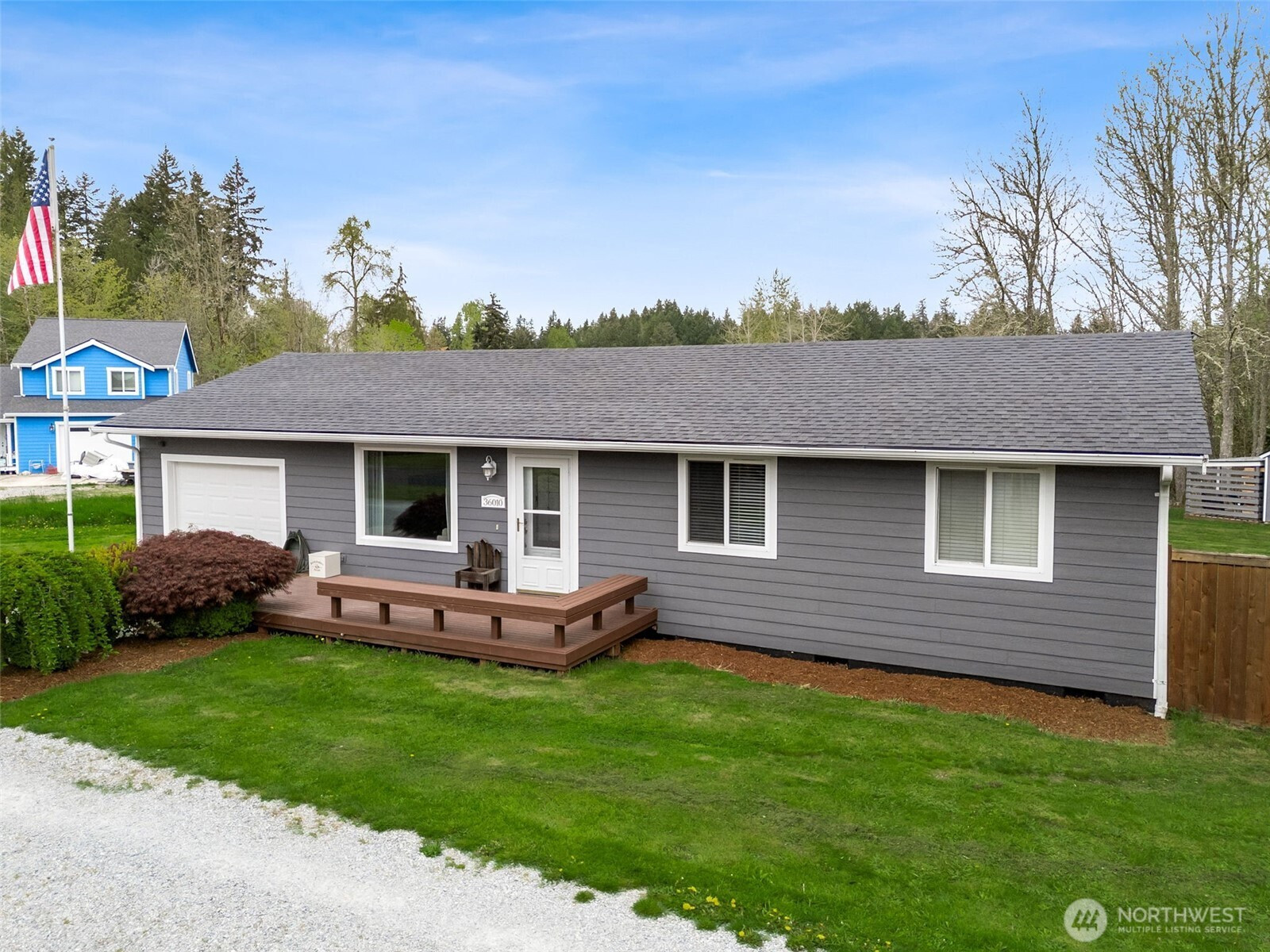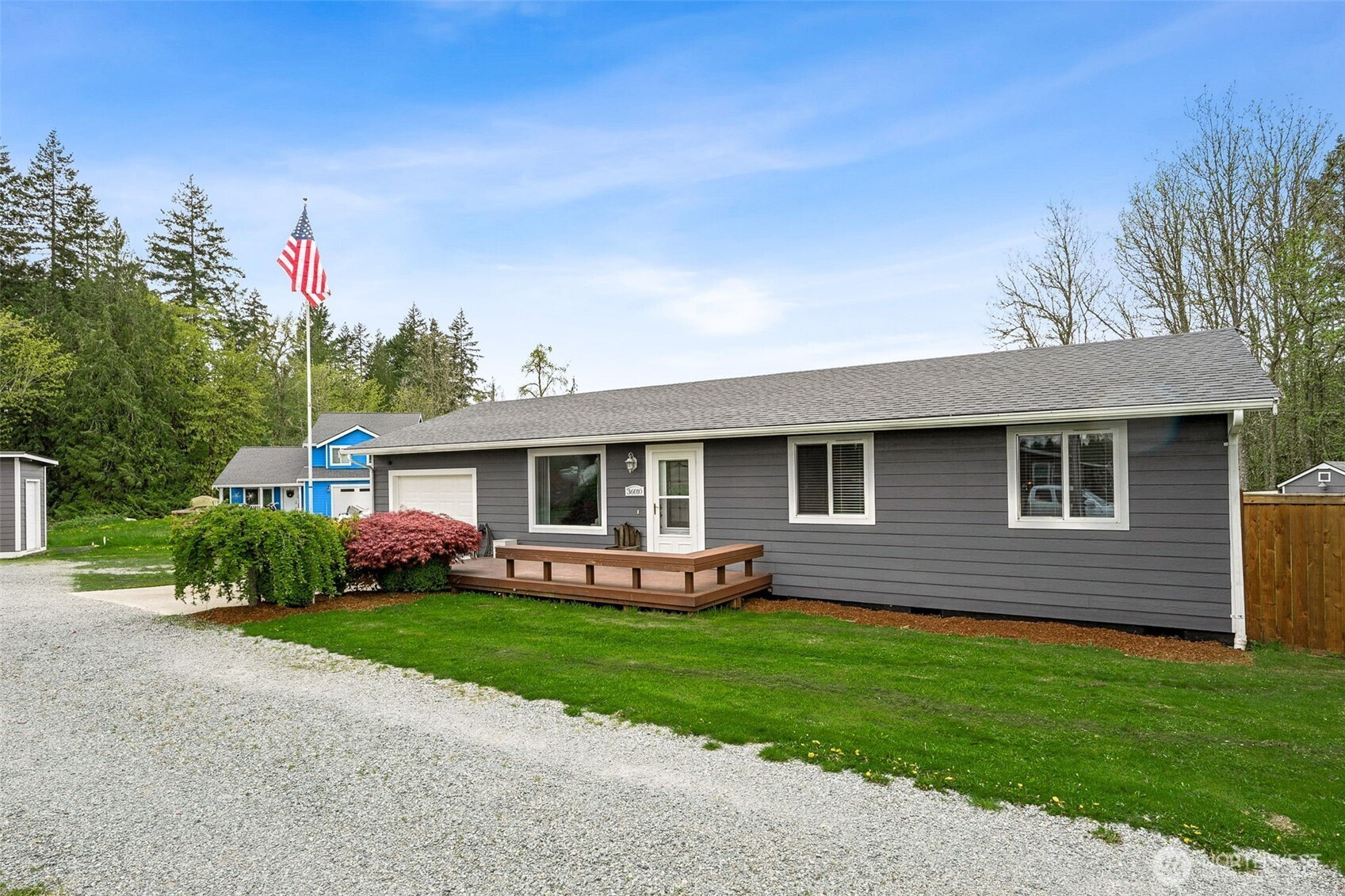Beautifully updated rambler offering an open floorplan with thoughtfully designed living space. All new for peace of mind: exterior paint, roof, deck, garage door/motor and pressure tank in well house! The bright and inviting living room flows seamlessly into the dining area just off the updated kitchen, complete with quartz countertops, stainless steel appliances, full-height tile backsplash, and a window overlooking the property. The home features 3 generously sized bedrooms and 1.75 updated bathrooms with modern vanities, tile accents, and a beautifully tiled shower in the full bath. Step outside to the huge fenced, park-like backyard featuring a bonfire pit and an entertainment-sized deck with built-in seating—perfect for gatherings. Detached garage/shop 25x25, 625 sq feet, 12 ft tall W/10-foot doors and 100-amp service providing added storage, workspace, or hobby potential and space for RV parking! Centrally located just minutes to shopping, dining and entertainment! Eatonville School District!