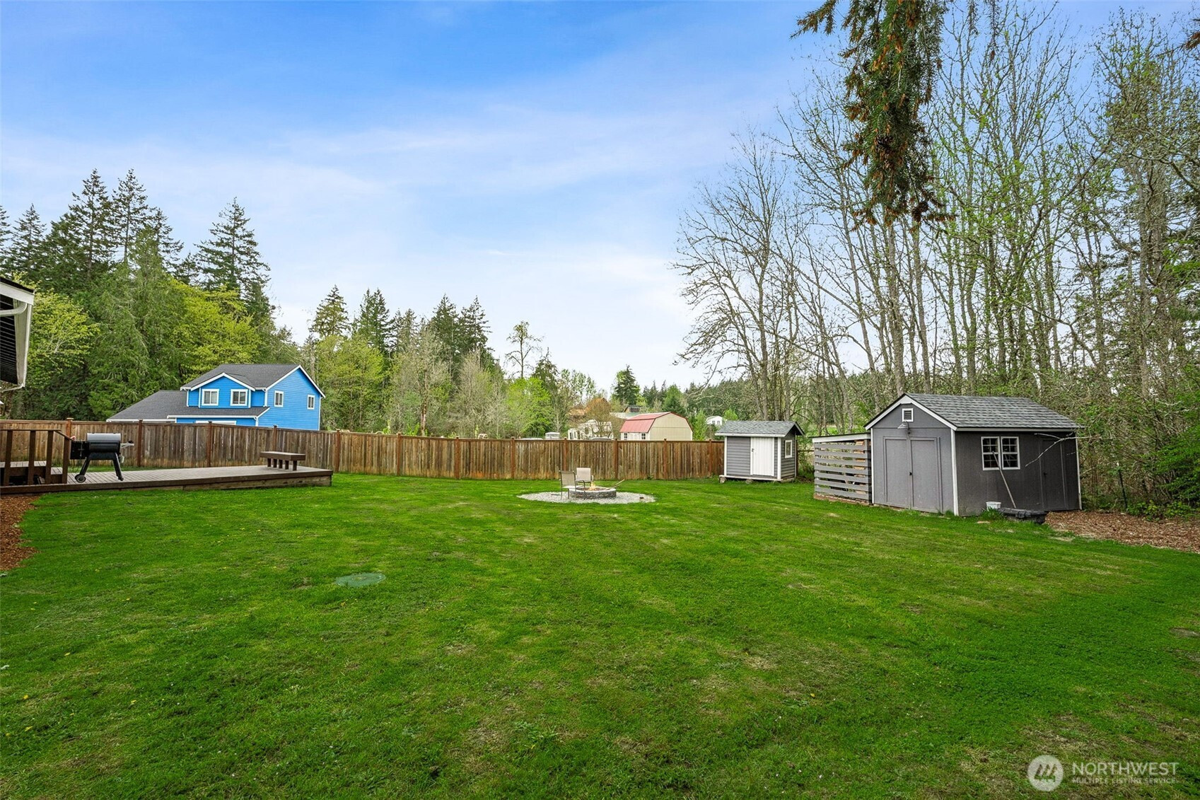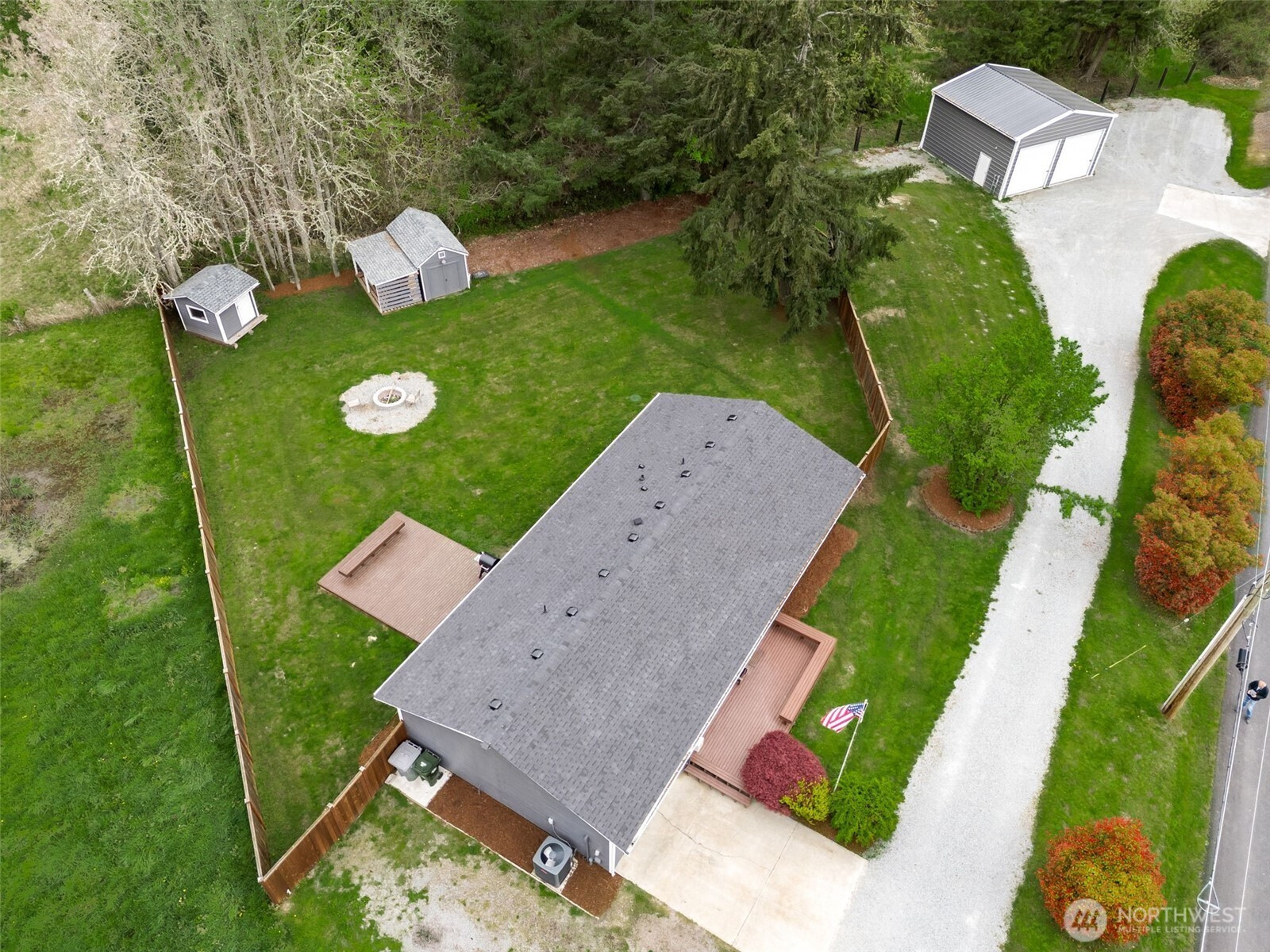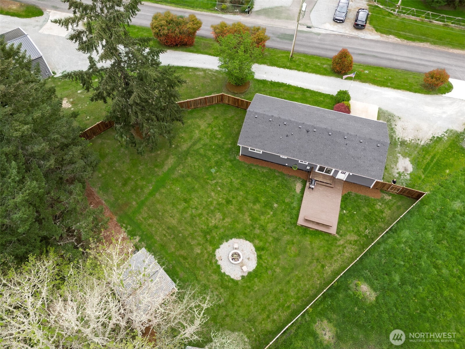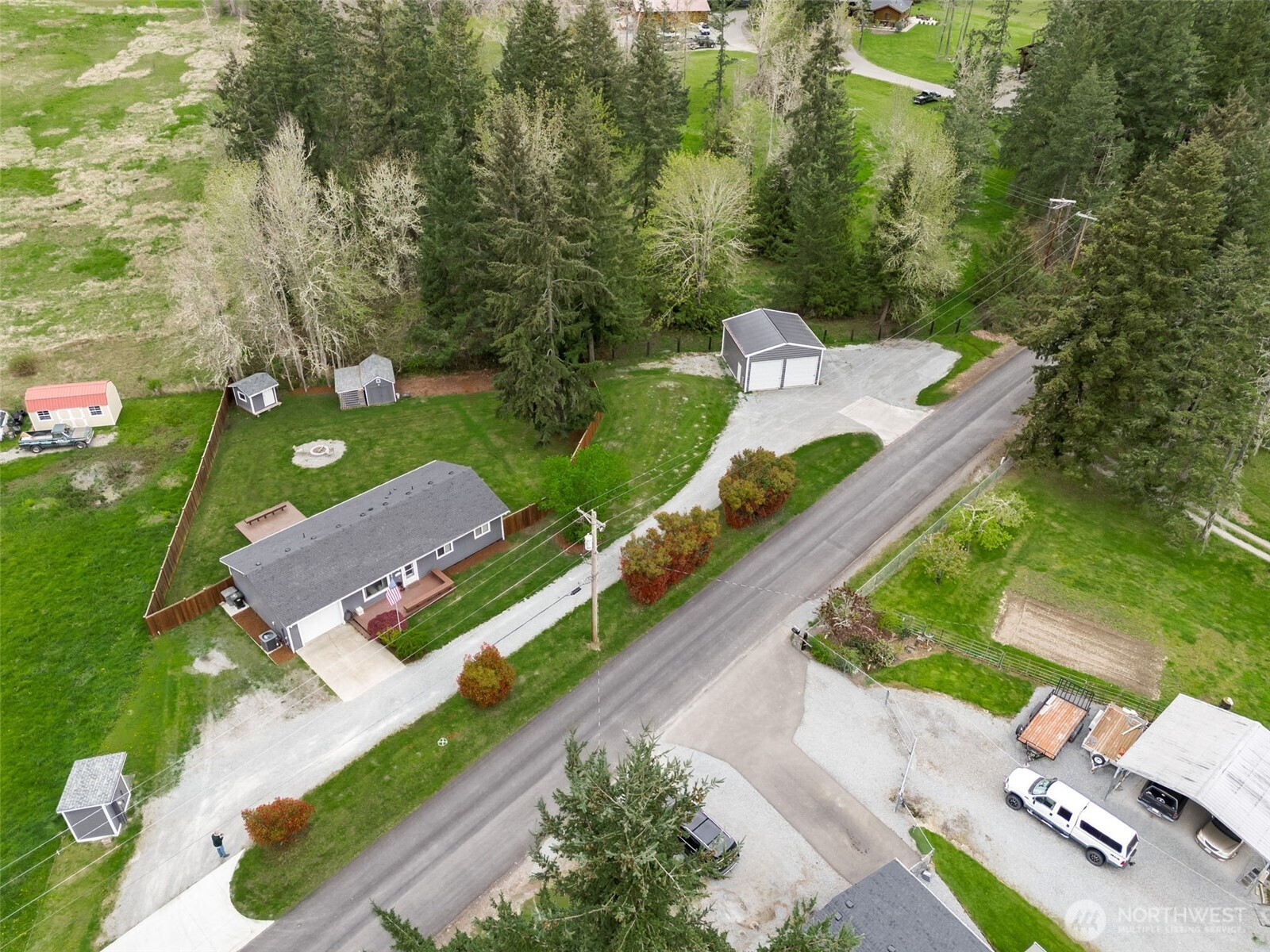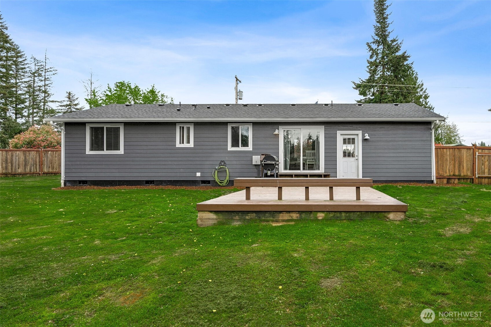 Beautifully updated rambler offering an open floorplan with thoughtfully designed living space. All new for peace of mind: exterior paint, roof, deck, garage door/motor and pressure tank in well house! The bright and inviting living room flows seamlessly into the dining area just off the updated kitchen, complete with quartz countertops, stainless steel appliances, full-height tile backsplash, and a window overlooking the property. The home features 3 generously sized bedrooms and 1.75 updated bathrooms with modern vanities, tile accents, and a beautifully tiled shower in the full bath. Step outside to the huge fenced, park-like backyard featuring a bonfire pit and an entertainment-sized deck with built-in seating—perfect for gatherings. Detached garage/shop 25x25, 625 sq feet, 12 ft tall W/10-foot doors and 100-amp service providing added storage, workspace, or hobby potential and space for RV parking! Centrally located just minutes to shopping, dining and entertainment! Eatonville School District!