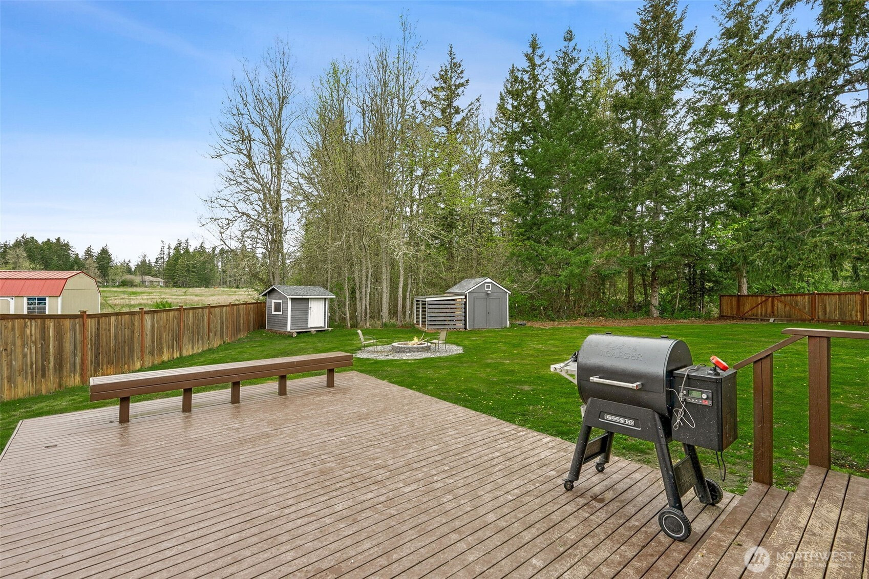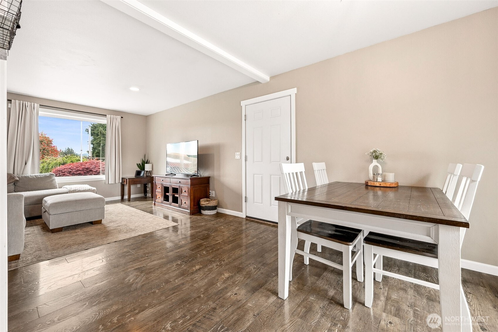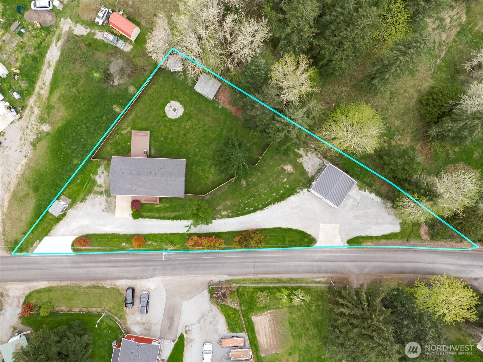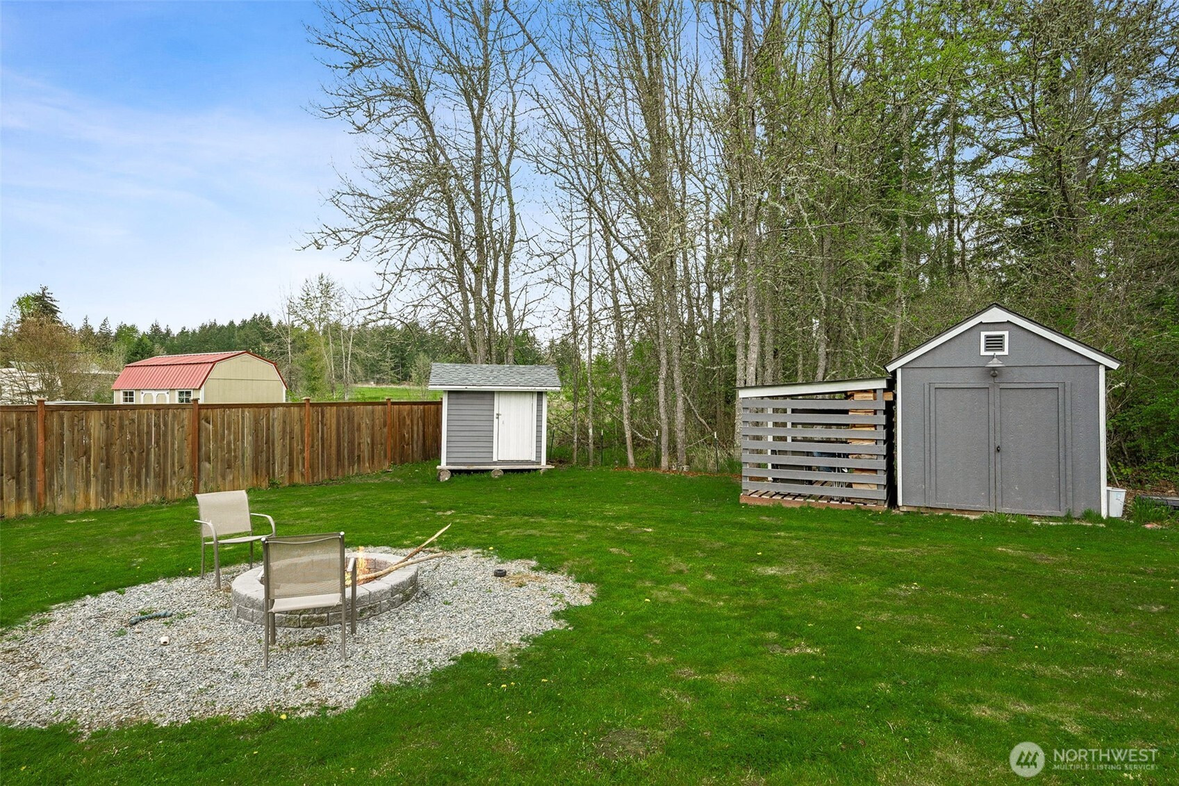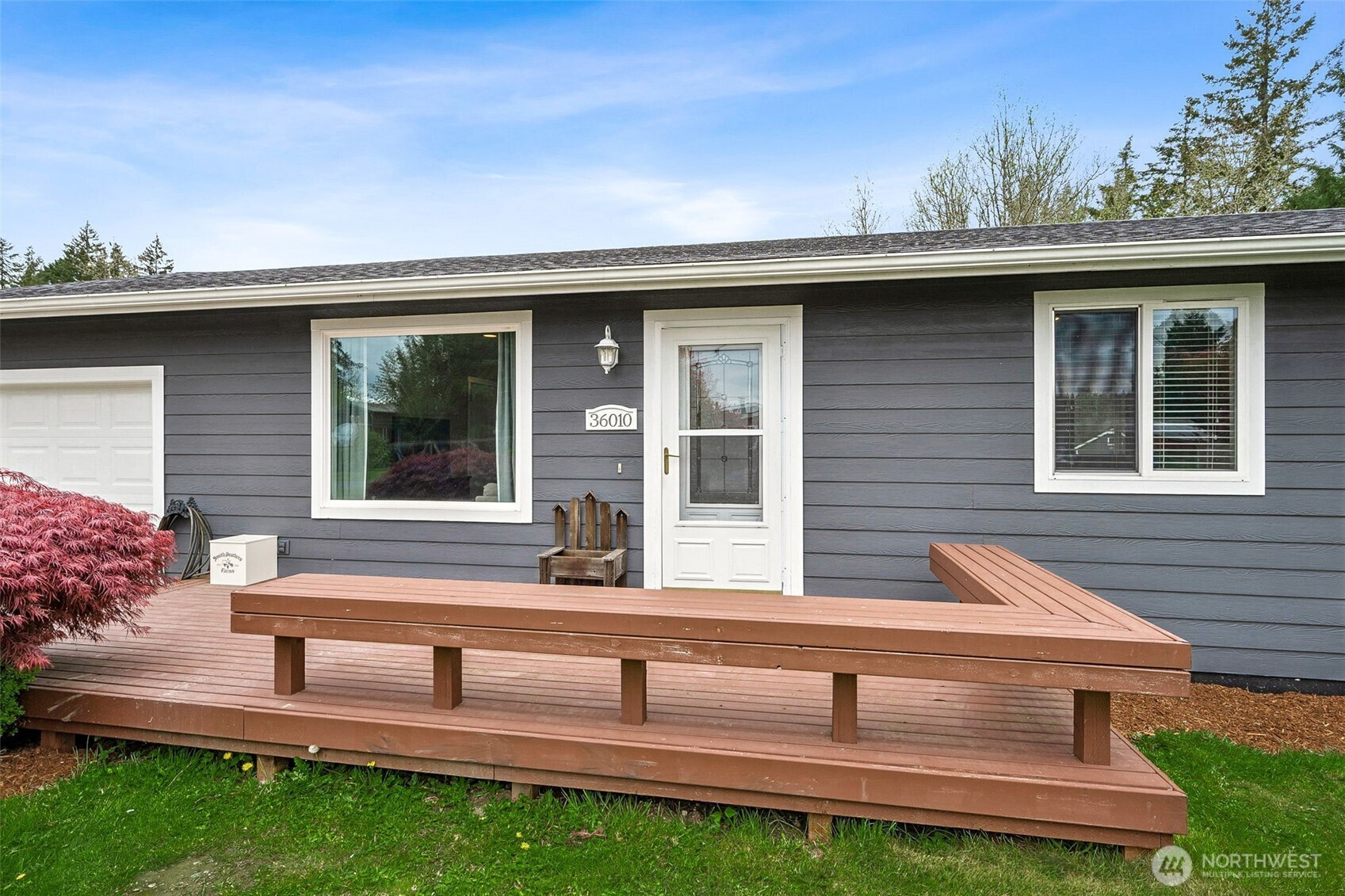 Beautifully updated rambler offering an open floorplan with thoughtfully designed living space. All new for peace of mind: exterior paint, roof, deck, garage door/motor and pressure tank in well house! The bright and inviting living room flows seamlessly into the dining area just off the updated kitchen, complete with quartz countertops, stainless steel appliances, full-height tile backsplash, and a window overlooking the property. The home features 3 generously sized bedrooms and 1.75 updated bathrooms with modern vanities, tile accents, and a beautifully tiled shower in the full bath. Step outside to the huge fenced, park-like backyard featuring a bonfire pit and an entertainment-sized deck with built-in seating—perfect for gatherings. Detached garage/shop 25x25, 625 sq feet, 12 ft tall W/10-foot doors and 100-amp service providing added storage, workspace, or hobby potential and space for RV parking! Centrally located just minutes to shopping, dining and entertainment! Eatonville School District!