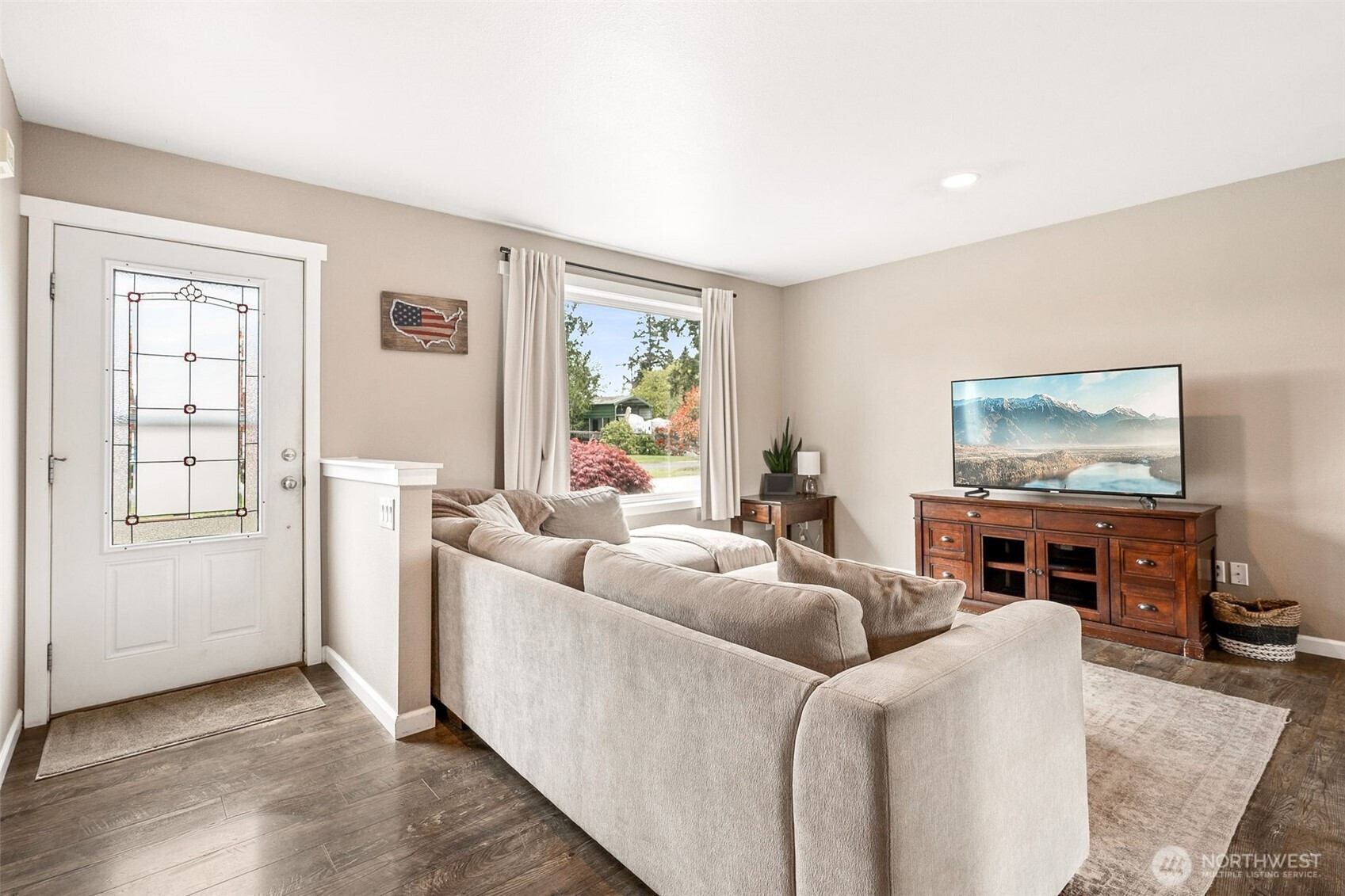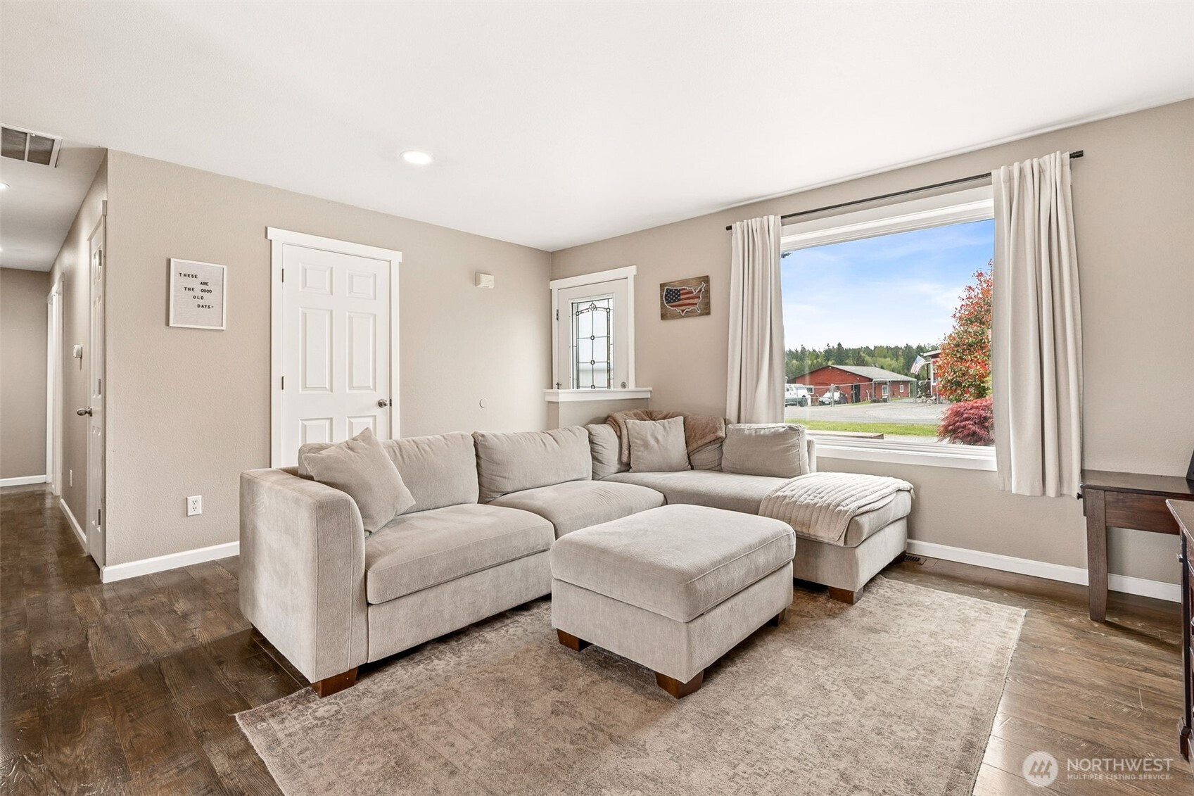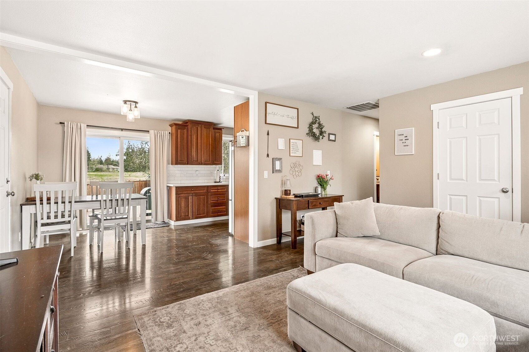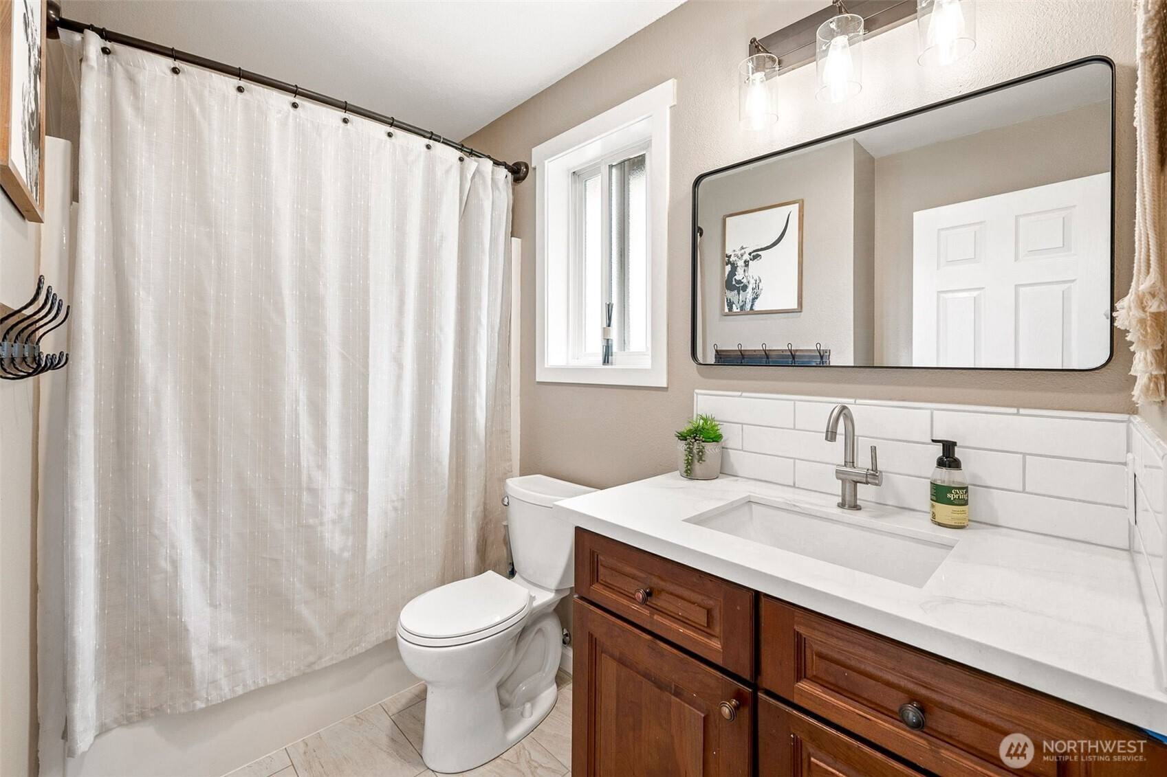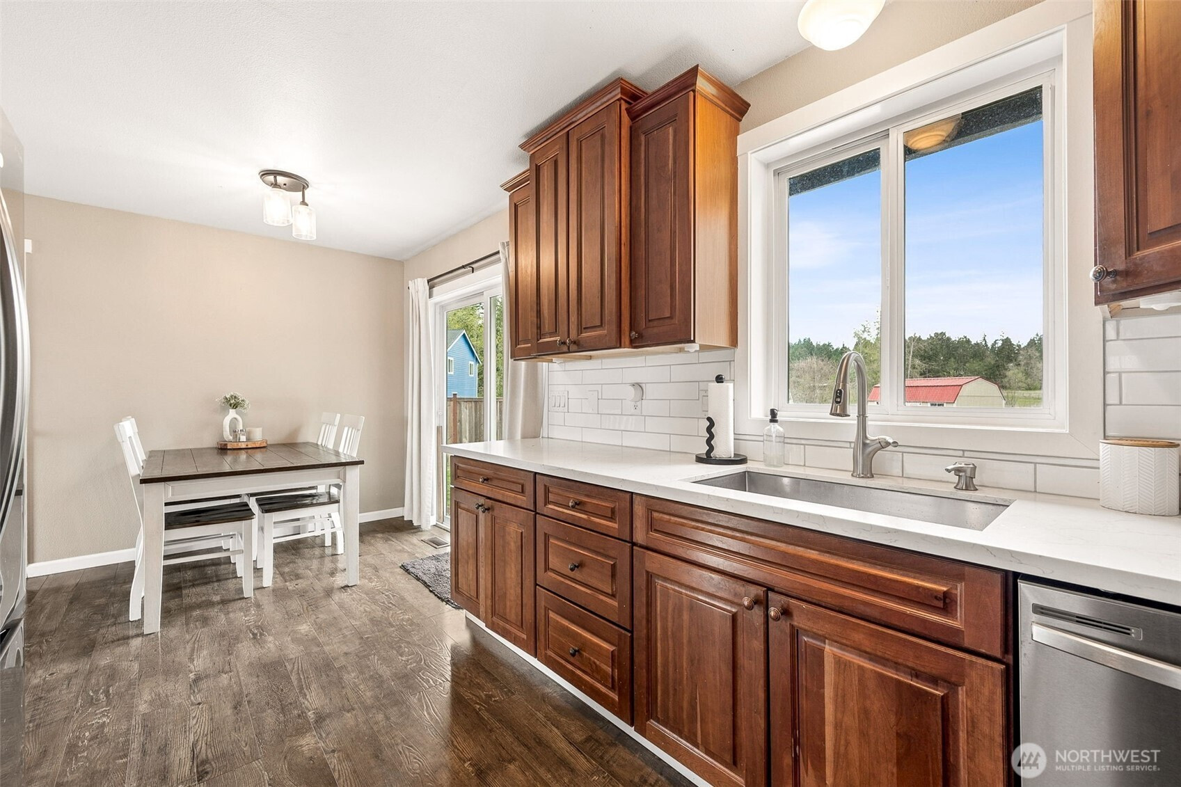 Beautifully updated rambler offering an open floorplan with thoughtfully designed living space. All new for peace of mind: exterior paint, roof, deck, garage door/motor and pressure tank in well house! The bright and inviting living room flows seamlessly into the dining area just off the updated kitchen, complete with quartz countertops, stainless steel appliances, full-height tile backsplash, and a window overlooking the property. The home features 3 generously sized bedrooms and 1.75 updated bathrooms with modern vanities, tile accents, and a beautifully tiled shower in the full bath. Step outside to the huge fenced, park-like backyard featuring a bonfire pit and an entertainment-sized deck with built-in seating—perfect for gatherings. Detached garage/shop 25x25, 625 sq feet, 12 ft tall W/10-foot doors and 100-amp service providing added storage, workspace, or hobby potential and space for RV parking! Centrally located just minutes to shopping, dining and entertainment! Eatonville School District!