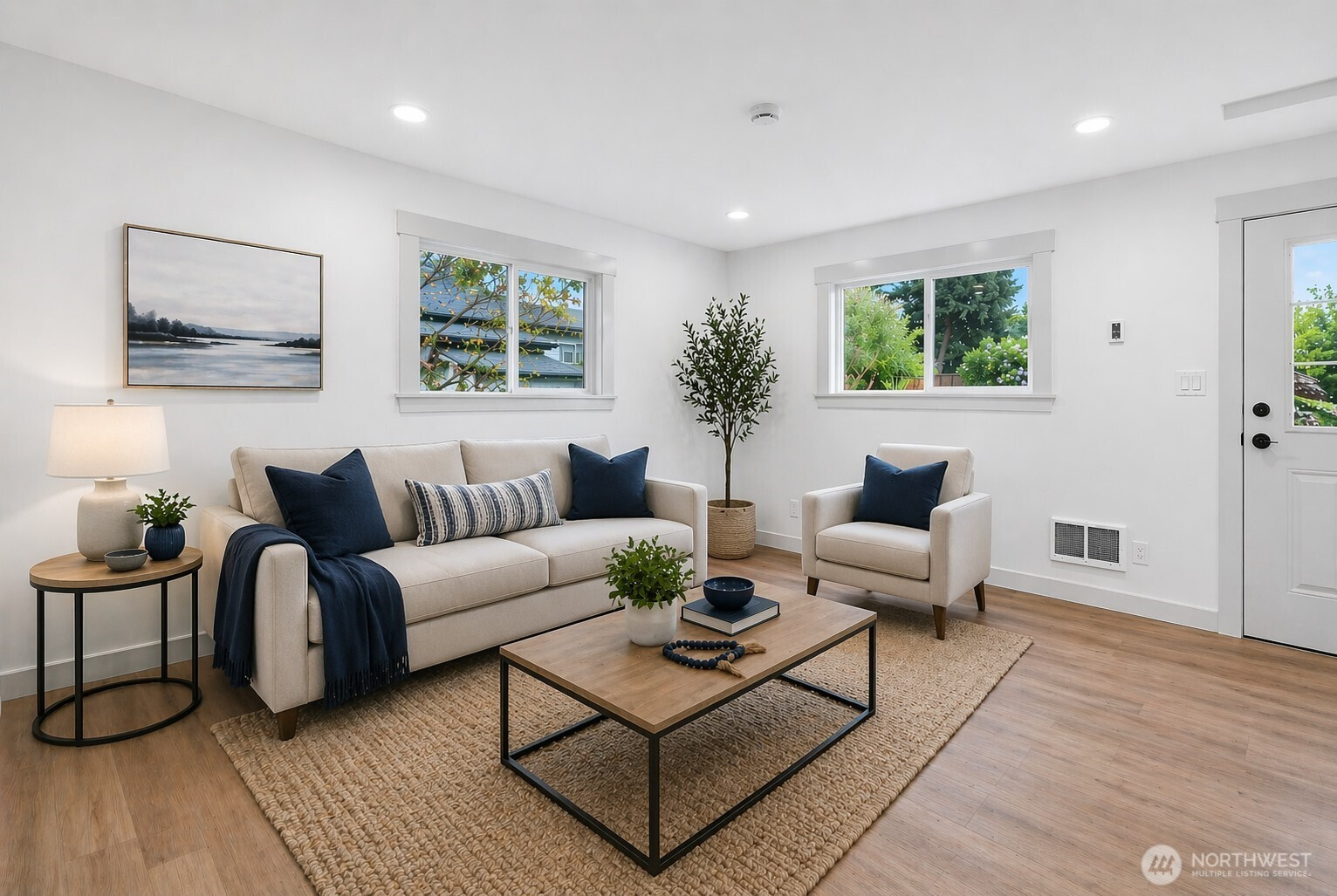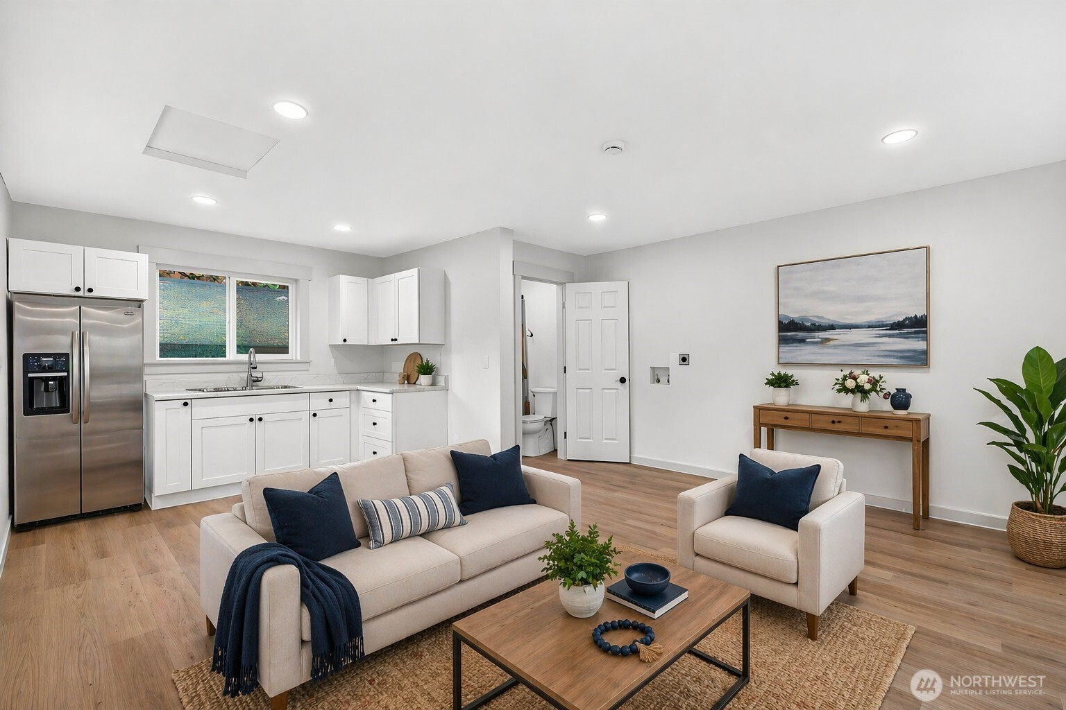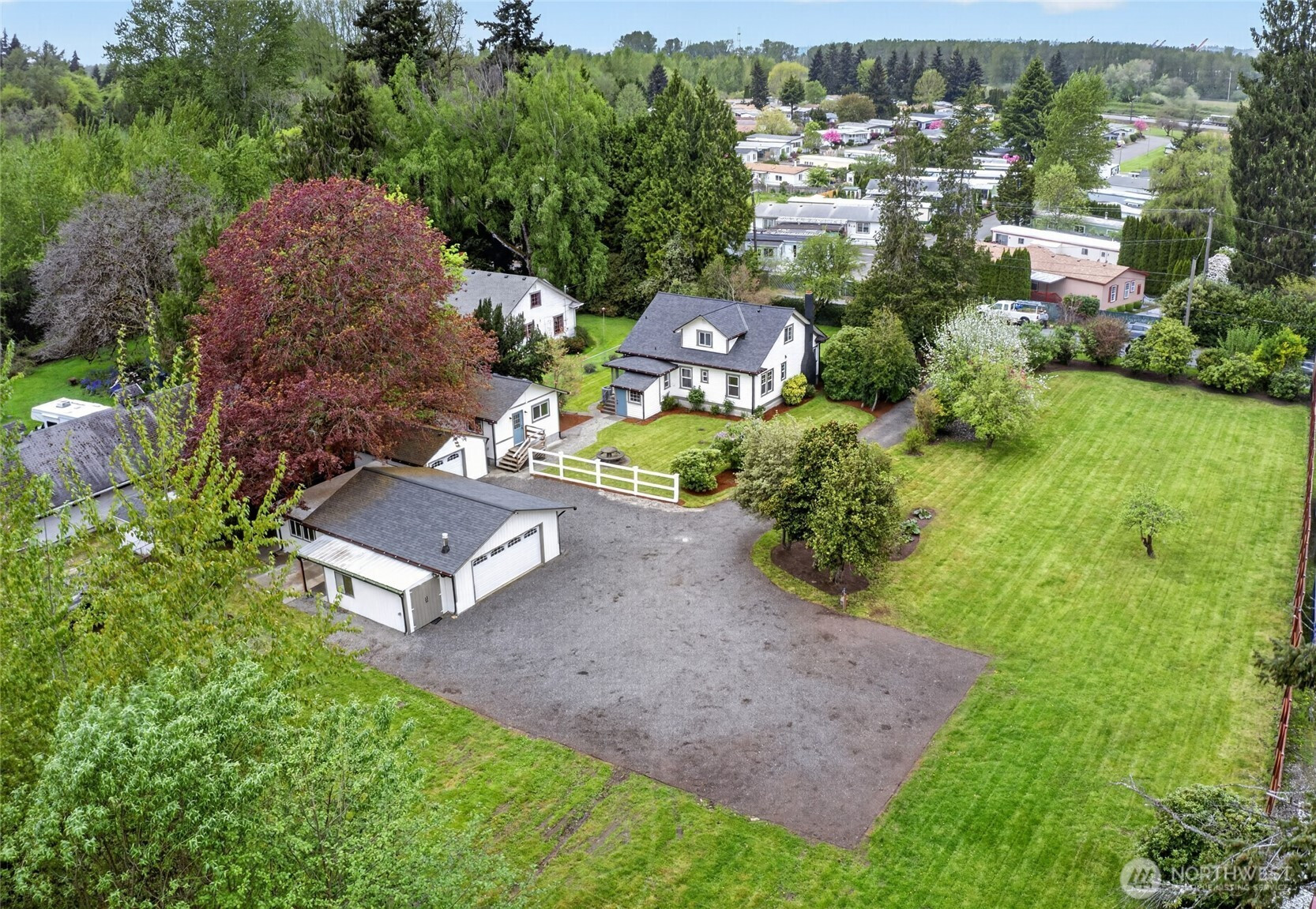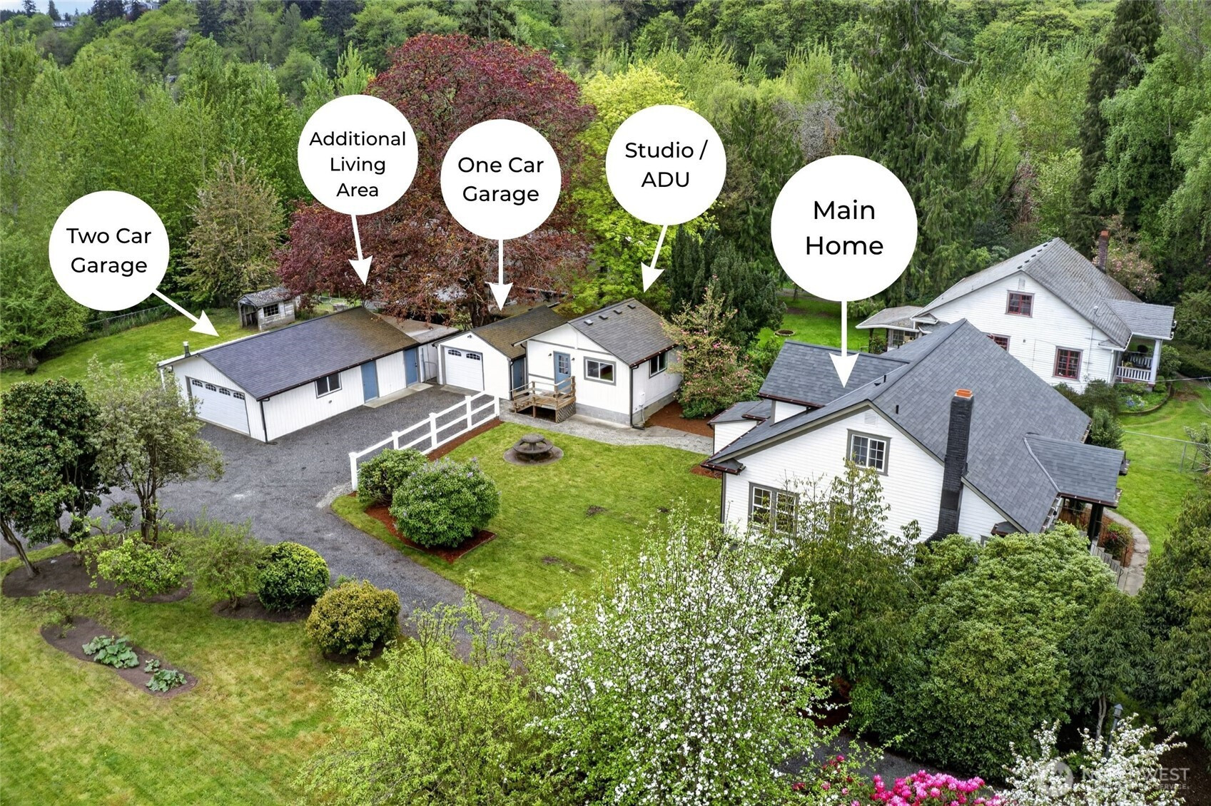 Tucked away on a shy acre, this thoughtfully updated farmhouse offers a peaceful setting with room to live, work, and grow. A long gravel drive leads to a welcoming property framed by mature greenery, classic architecture, and multiple flexible living spaces.Inside, the main home blends charm with modern updates, featuring bright living areas, refinished flooring, and a formal dining space ideal for everyday living or entertaining. The main level includes one bedroom plus an additional room that may function as a second bedroom with shared closet access, along with a full bath. Upstairs offers two bedrooms, a loft, and a ¾ bath, creating separation and privacy.The property extends beyond the main home with a detached studio complete with a kitchenette and bathroom, ideal for guests, extended living, or workspace. An additional finished living space behind the two-car garage provides even more flexibility, while a separate one-car garage and outbuildings add storage and utility.Recent updates enhance comfort and reliability, including a new roof, all-new electrical system, an updated panel, a high-efficiency furnace, and refreshed HVAC ductwork. Additional improvements include new gutters, a well pressure tank, and fresh interior paint. Refinished wood floors and LVP complete the interior. The fully fenced property also includes a finished storage shed, a two-car garage, and a separate single-car garage.