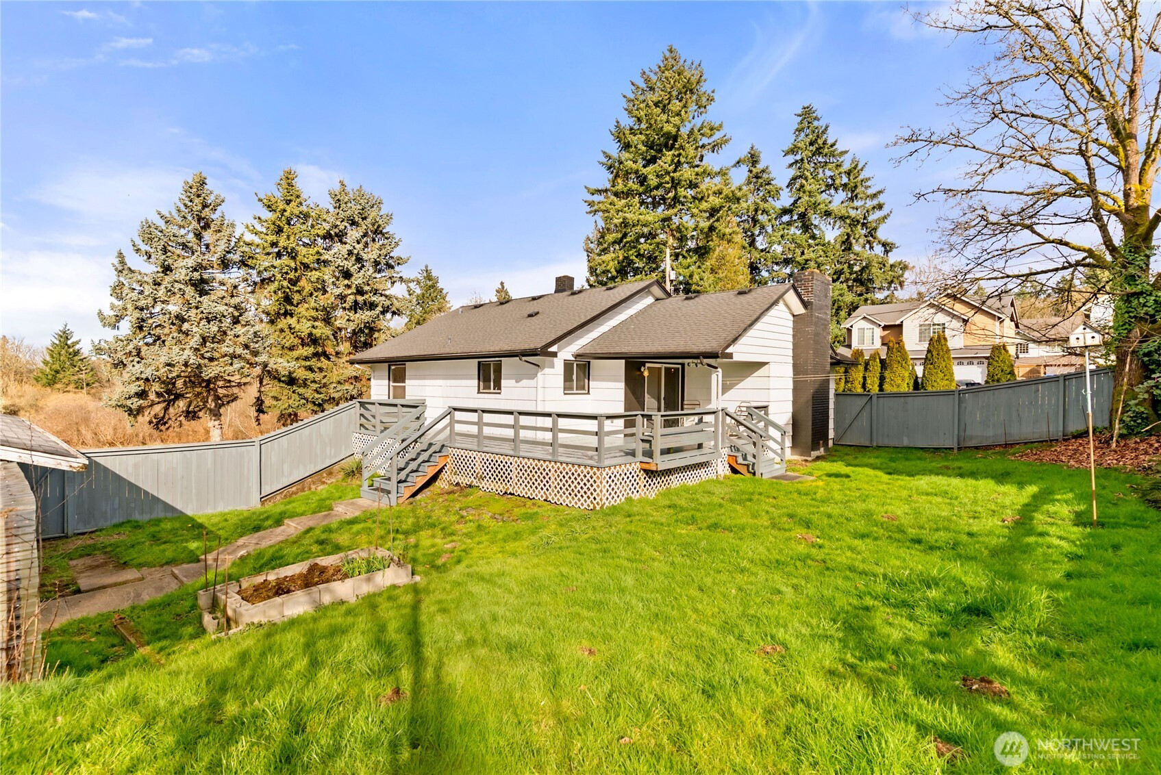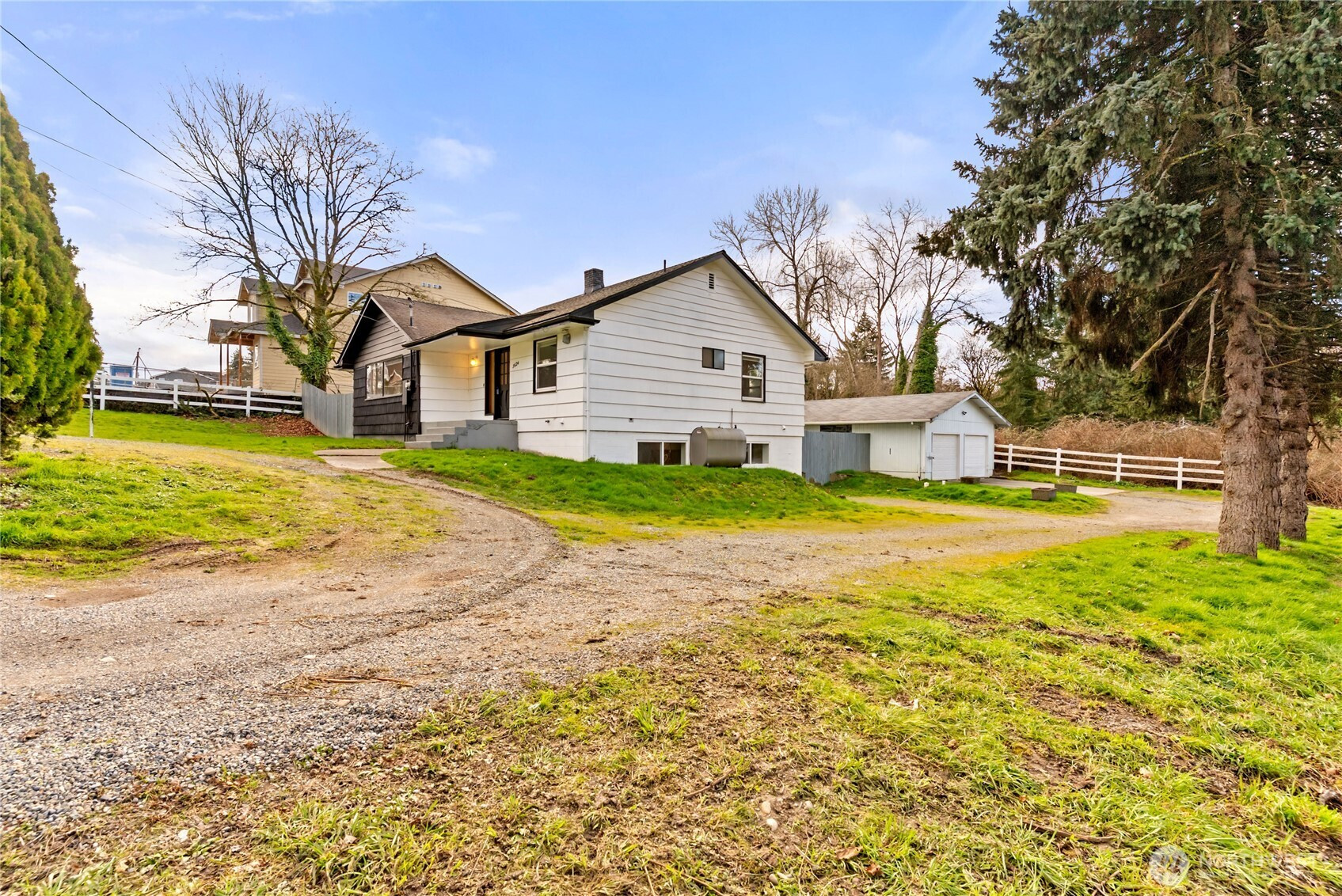 Rare find in Tacoma on 1.4 acre lot. Tucked away on a quiet dead-end street, this property offers privacy, space, with an expansive front and back yard allowing plenty of room for gardening or entertaining.This charming 2-bedroom, 1-bath home features a spacious living room with a cozy wood-burning fireplace and beautiful stone surround, perfect for relaxing evenings. The bright kitchen offers great natural light and functional layout, while laminate flooring flows throughout the main living areas.Enjoy outdoor living year-round with both covered front and back decks, ideal for gatherings or peaceful mornings. A detached 2-car garage/shop provides ample parking and storage.The basement includes separate exterior access, a large rec room, bonus room/storage area, and large utility room. With its generous layout, it offers strong potential for additional living space. The water heater is like new, and the home also features a newer roof for added peace of mind.Large acreage, privacy, and versatility within Tacoma, properties like this are a rare find!
