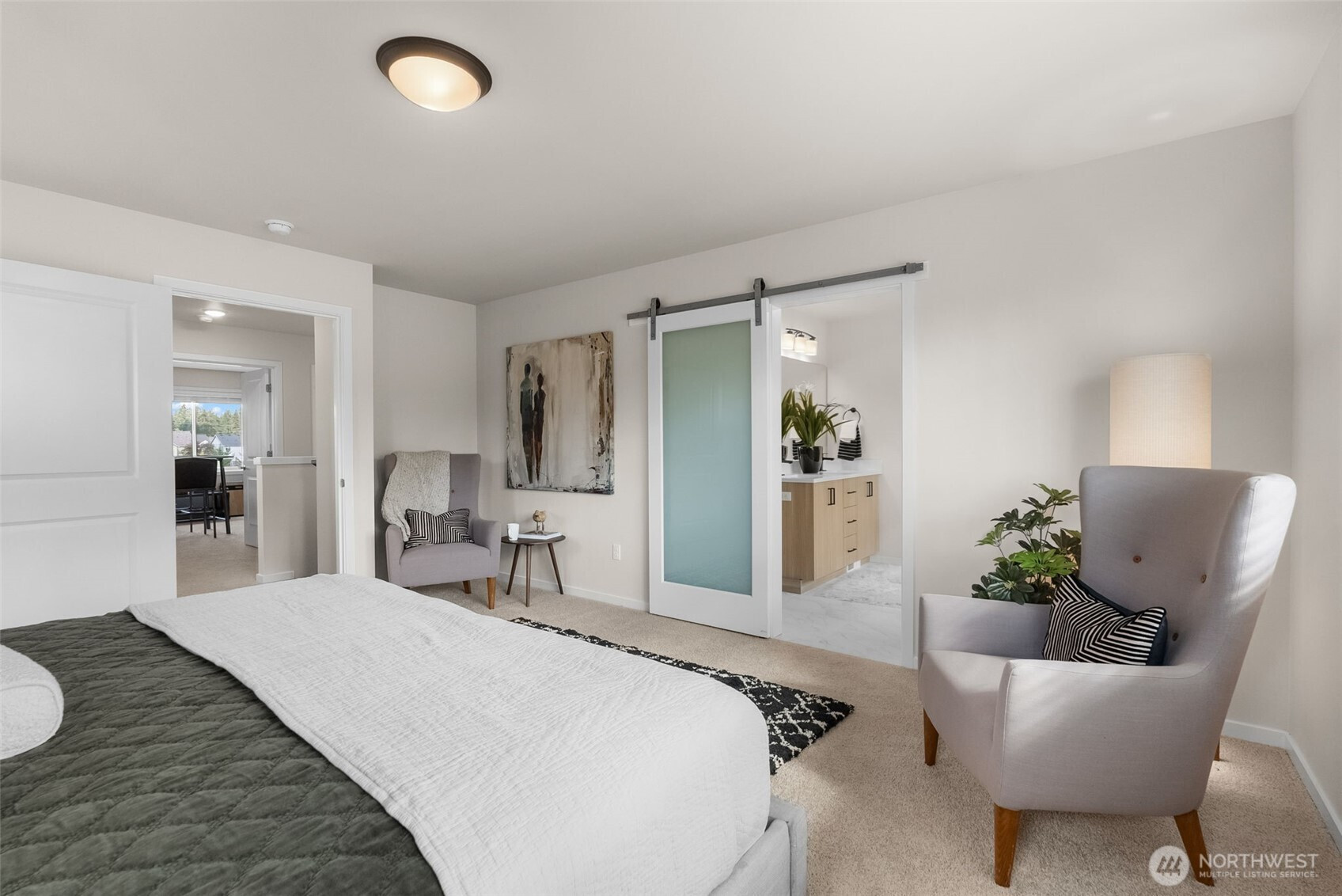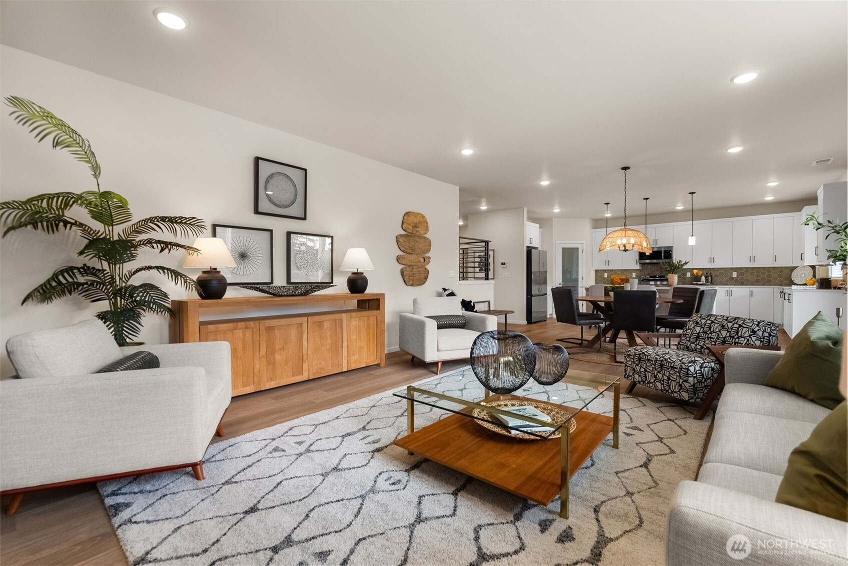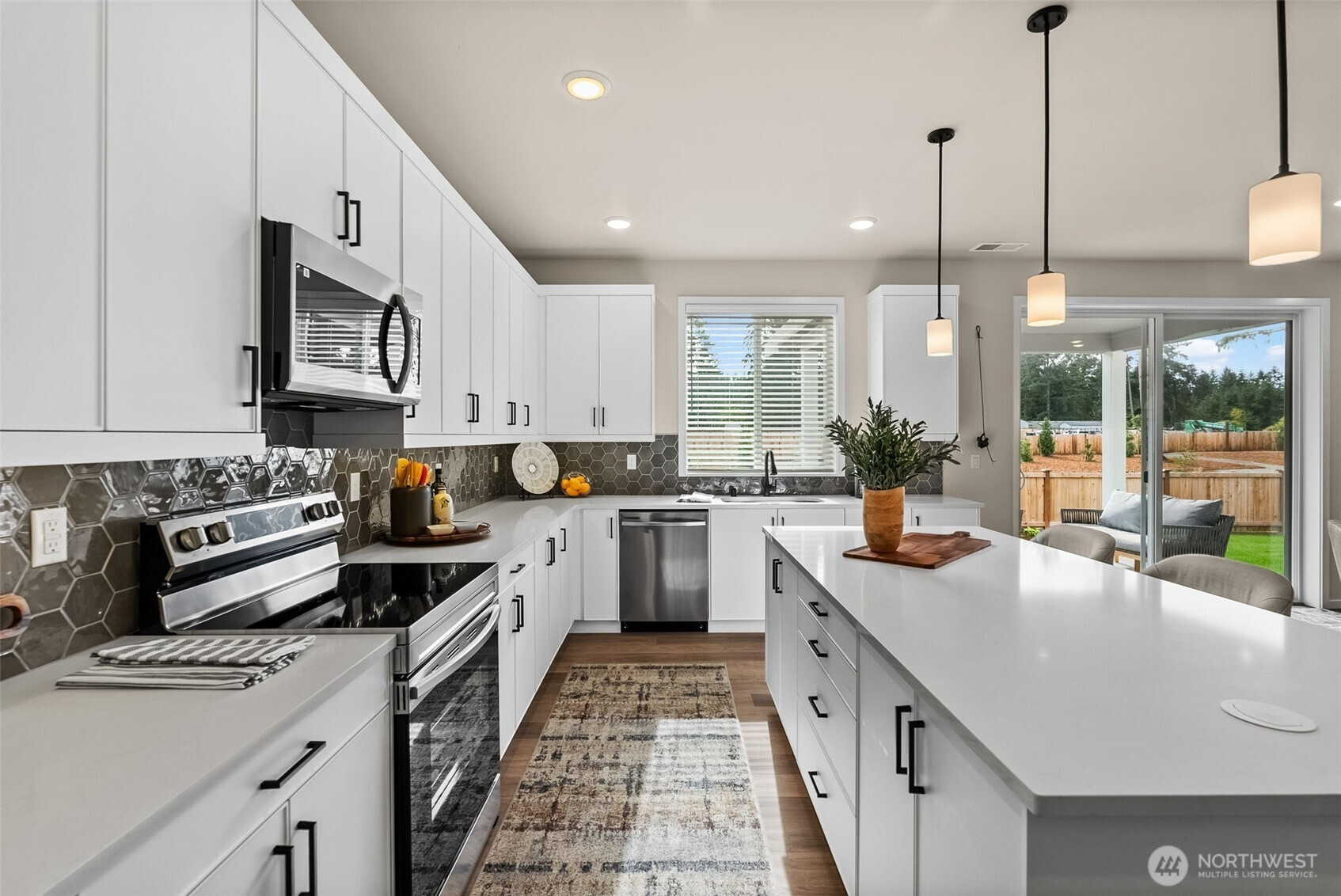 Welcome to Lot 8 at The Preserve, showcasing the spacious Cedar plan with 5 bedrooms and 3.5 baths. A standout feature is the main-floor mini suite with its own private bath, offering ideal flexibility for guests, multi-generational living, or a dedicated workspace. The gourmet kitchen impresses with quartz countertops, full-height subway tile backsplash, stainless steel appliances, and custom soft-close cabinetry. Engineered plank flooring spans the main level, complemented by site-painted millwork and an inviting upstairs primary suite. Outdoor living shines with a covered rear patio designed for year-round entertaining, overlooking a fully landscaped, fenced yard complete with irrigation for easy lawn maintenance. Practical conveniences include blinds, washer, dryer, refrigerator, and A/C, with the HOA maintaining the front yard for a low-maintenance lifestyle.