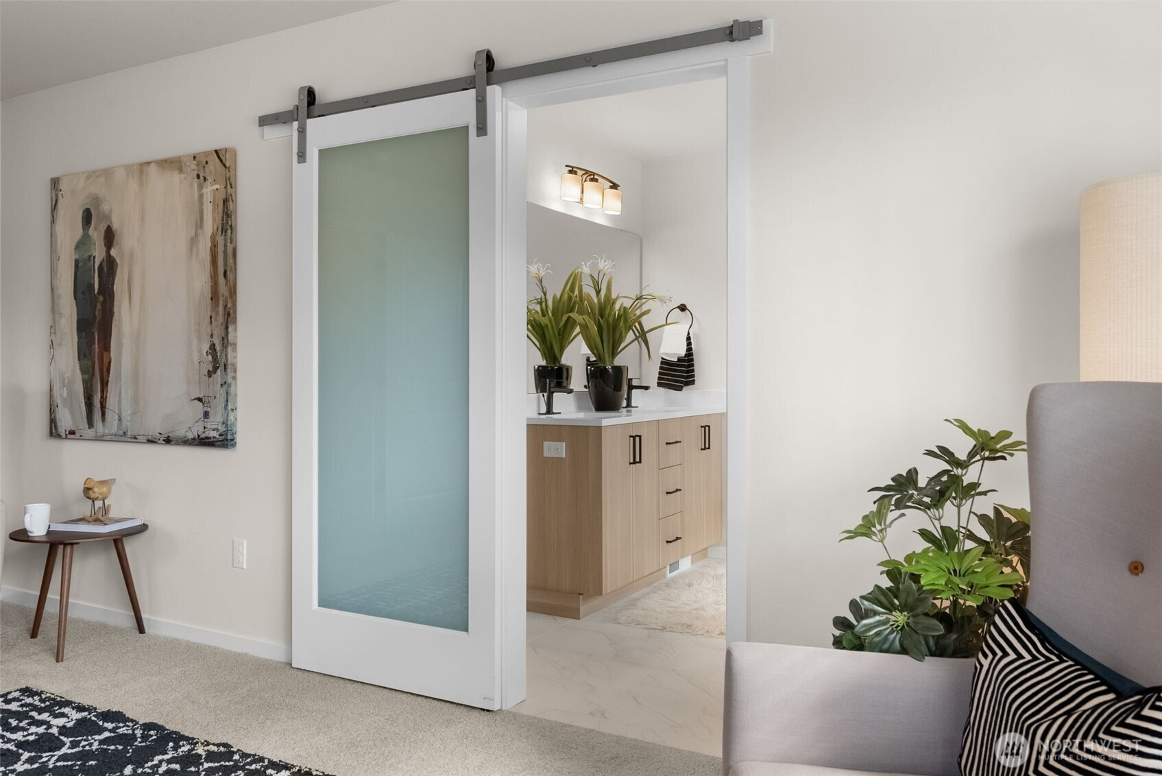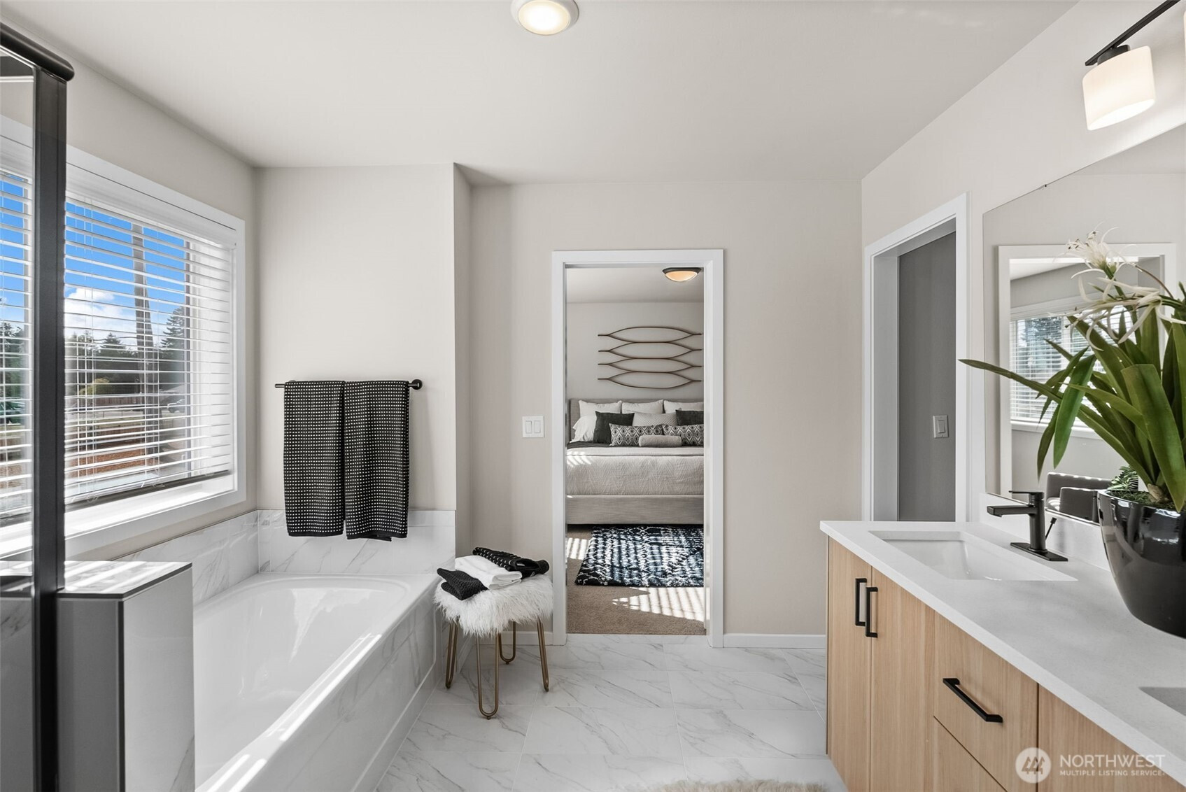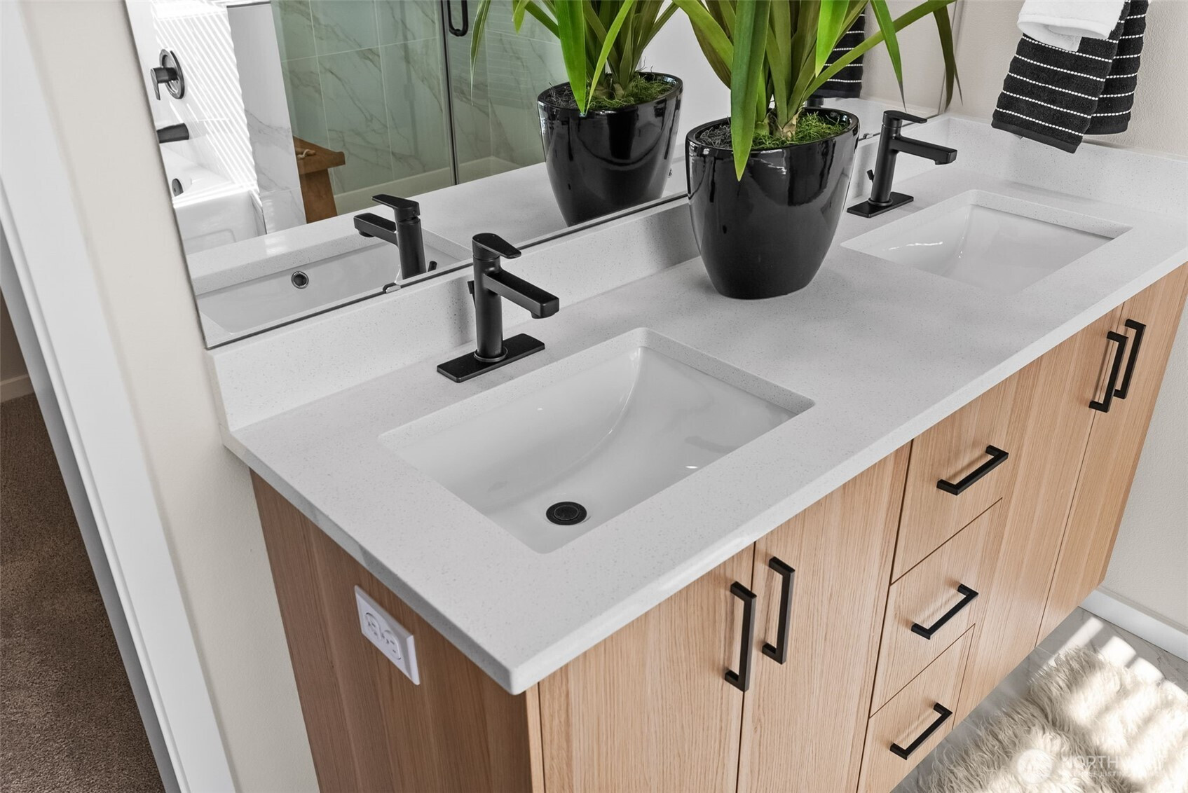 Welcome to Lot 8 at The Preserve, showcasing the spacious Cedar plan with 5 bedrooms and 3.5 baths. A standout feature is the main-floor mini suite with its own private bath, offering ideal flexibility for guests, multi-generational living, or a dedicated workspace. The gourmet kitchen impresses with quartz countertops, full-height subway tile backsplash, stainless steel appliances, and custom soft-close cabinetry. Engineered plank flooring spans the main level, complemented by site-painted millwork and an inviting upstairs primary suite. Outdoor living shines with a covered rear patio designed for year-round entertaining, overlooking a fully landscaped, fenced yard complete with irrigation for easy lawn maintenance. Practical conveniences include blinds, washer, dryer, refrigerator, and A/C, with the HOA maintaining the front yard for a low-maintenance lifestyle.