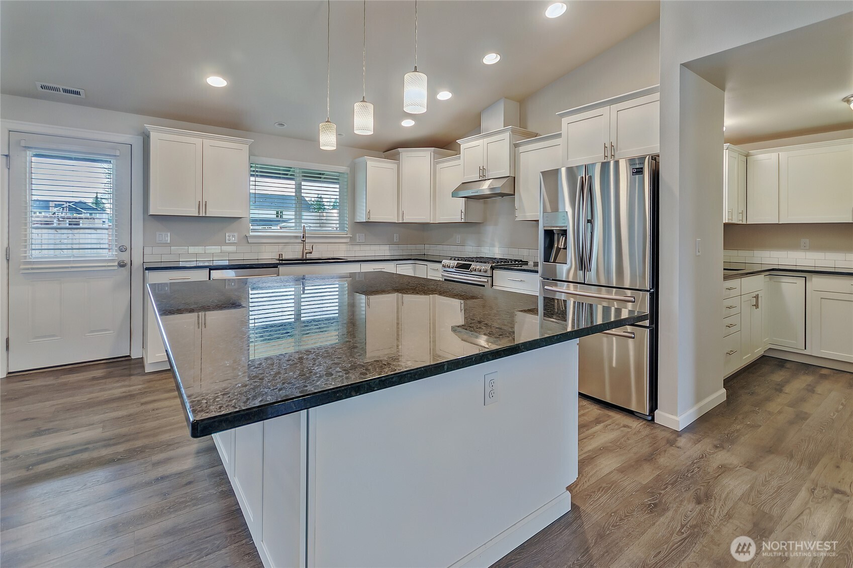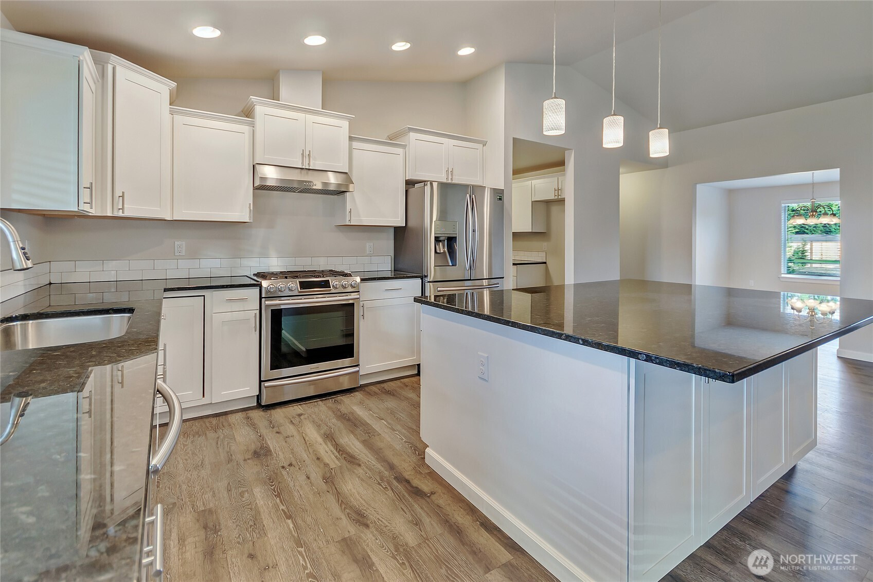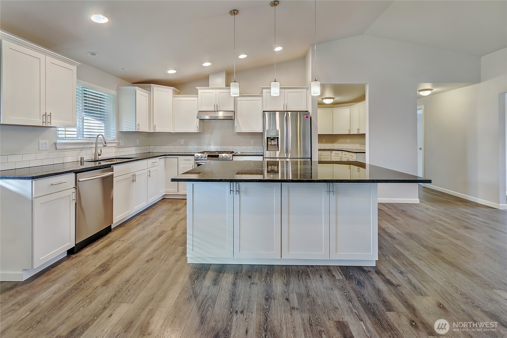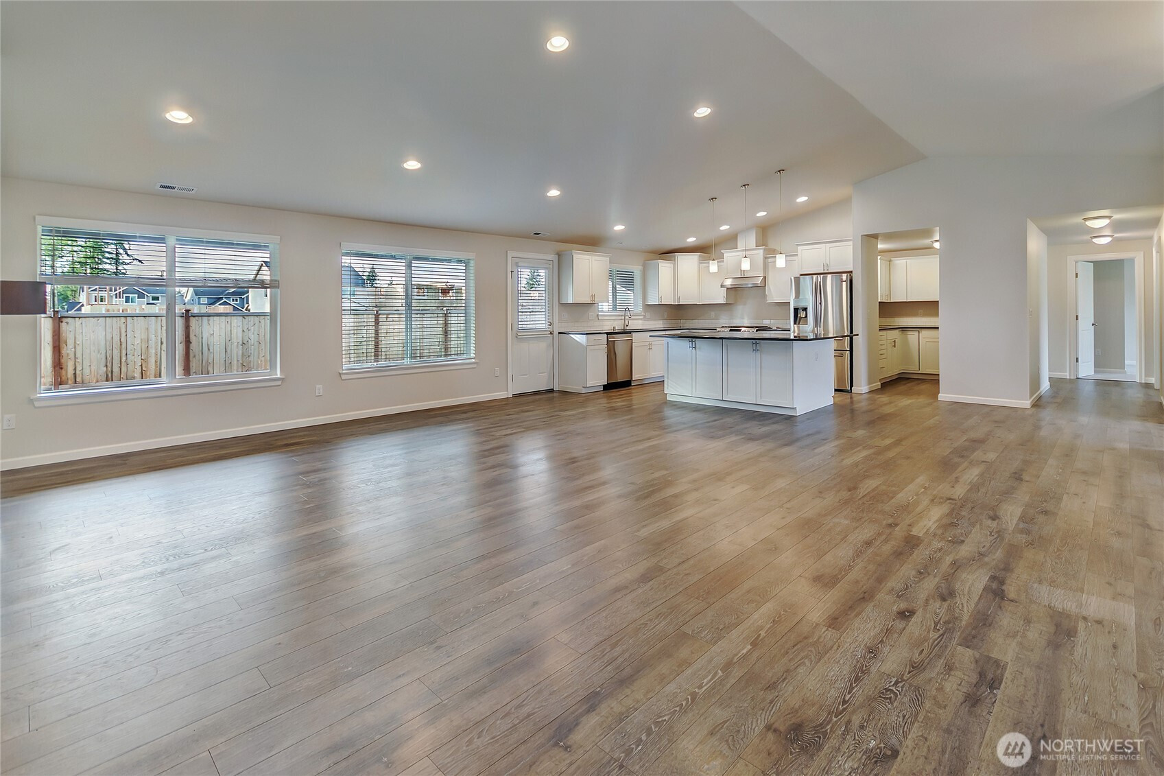 Welcome to this rare rambler set on a private 12,547 sq. ft. lot, offering both space and privacy. Built in 2017, the home spans 2,734 sq. ft. and showcases an oversized three-car garage—perfect for storage, hobbies, or extra vehicles. Inside, you’ll find four spacious bedrooms, two full baths, a large kitchen with eating space, dining room, great room, and a fully equipped wet bar/second kitchen. The primary suite features a closet the size of a bedroom with extensive built-ins. Interior finishes include white millwork, granite countertops, white cabinetry, and engineered laminate flooring. All appliances stay. Outdoors, enjoy a fully fenced backyard with a covered patio and a newly landscaped front yard.