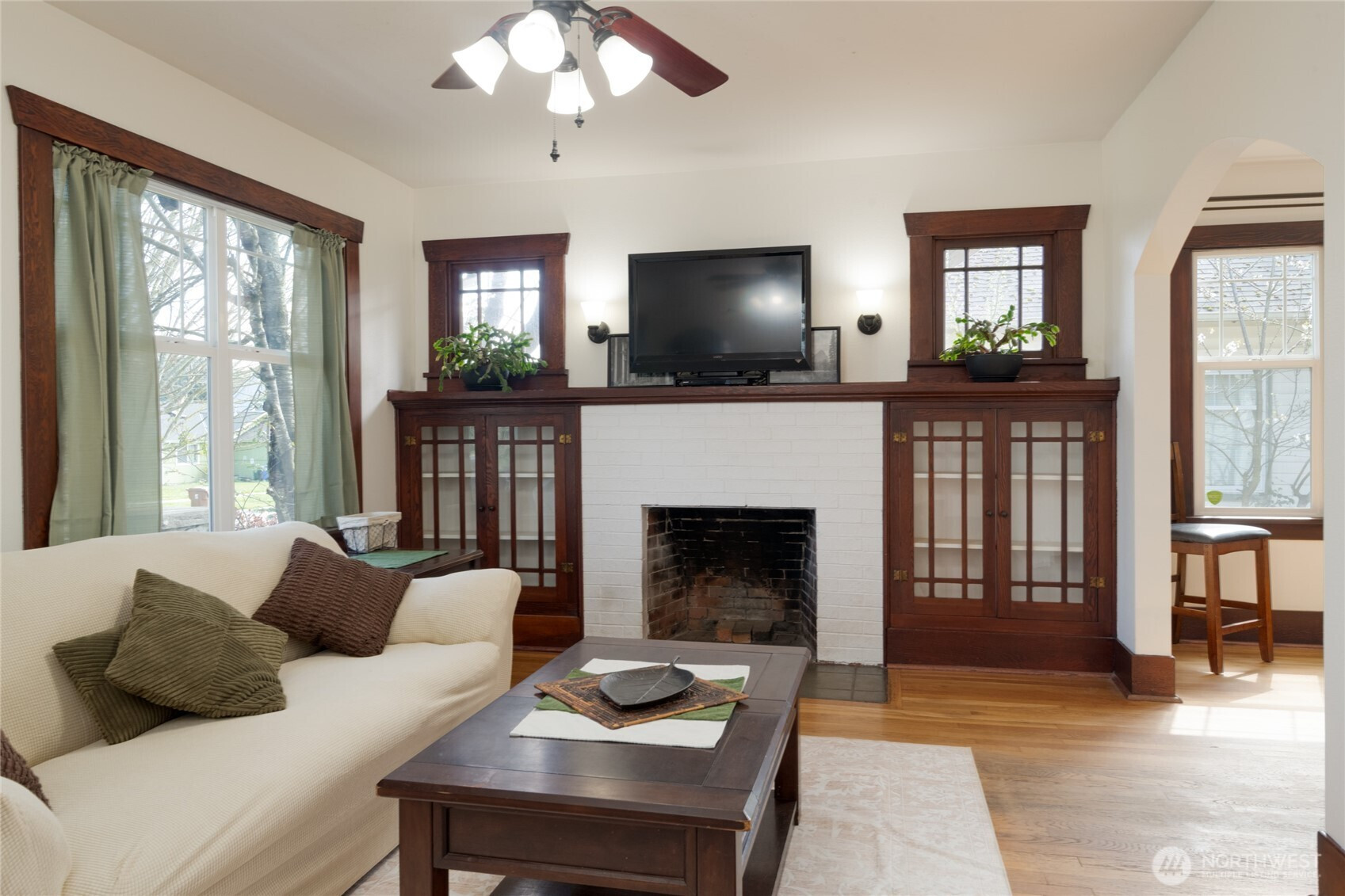 You’ll fall in love with this beautifully remodeled home, thoughtfully updated in 2010 while maintaining its original charm. Rich stained mahogany woodwork adds warmth and character throughout. The spacious living room features a cozy fireplace flanked by built-in cabinetry, creating an ideal gathering space. A generously sized dining room showcases an oversized window that fills the space with natural light. The kitchen is both stylish and functional, offering wood cabinetry, granite countertops, and stainless steel appliances. Hardwood floors run throughout the living room kitchen, and dining rooms, complemented by slate flooring in the bathrooms and utility room. Additional updates include vinyl windows, roof, gutters, doors, carpet, and bath vanities - all completed in 2010. Enjoy relaxing on the covered front porch and back patio. Take advantage of the oversized detached garage with its own separate electrical panel. A new sewer line was just installed for added peace of mind. Don’t miss this fantastic home in a commuter's dream location—your buyers are going to love it!