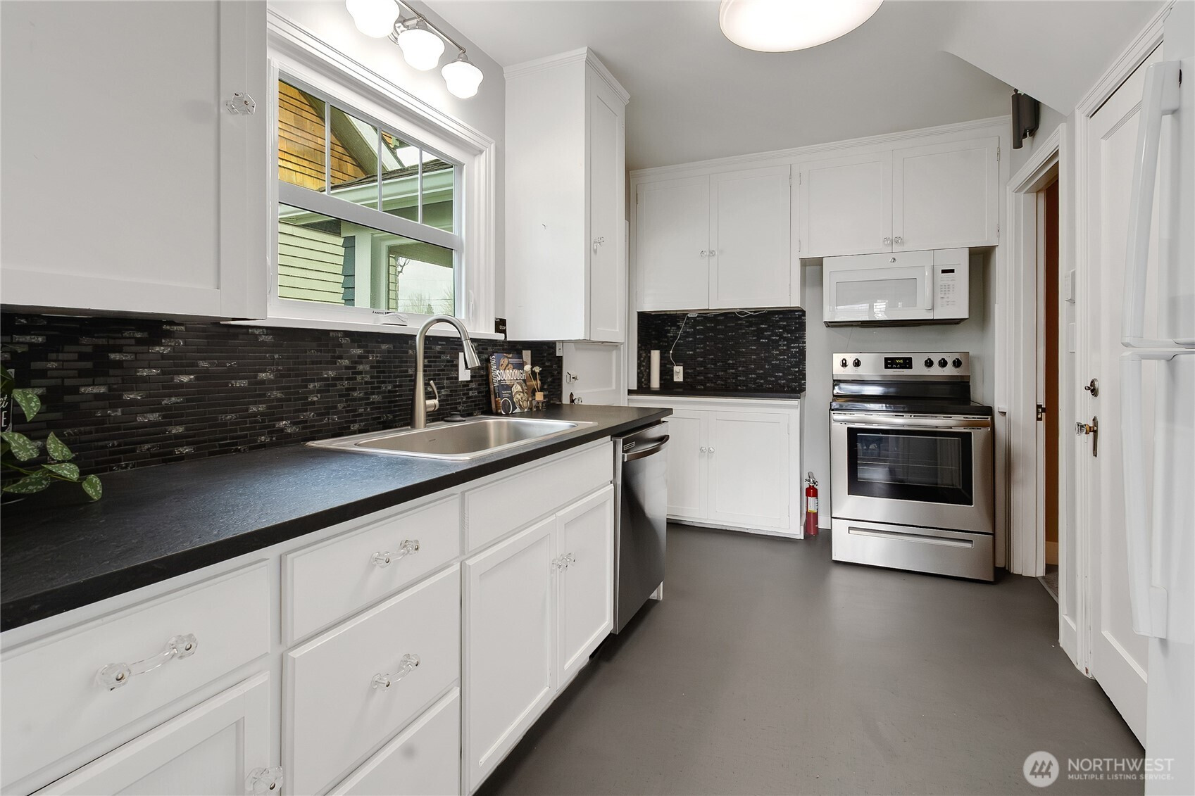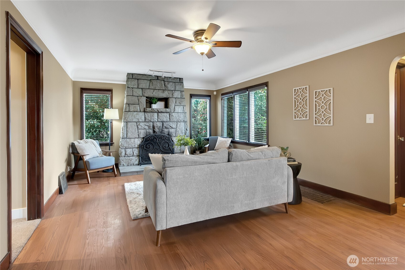 Charming vintage Tudor blending timeless character with modern comfort in a prime Tacoma location. This property features a detached one-car garage with additional off-street parking, a spacious basement offering endless potential, and a large fully fenced backyard perfect for entertaining, pets, or gardening. Inside, you’ll find stunning architectural details that set this home apart, including a rounded front door, coved ceilings, graceful archways, rich hardwood floors, built-in cabinetry, and a spectacular stone fireplace that serves as a true focal point. Generous windows fill the home with abundant natural light, complemented by custom wooden blinds throughout. Major updates provide peace of mind, including a new 30-year roof and central A/C installed in 2019, along with fresh exterior paint. All major appliances are included, making this home move-in ready. Ideally located with quick freeway access to Downtown Tacoma, Tacoma Mall, Tacoma Dome Station, and nearby military bases. Enjoy the convenience of being within walking distance to the vibrant Lincoln District with its shops, dining, and cultural attractions. A rare opportunity to own a character-filled home with modern updates in a highly accessible location.