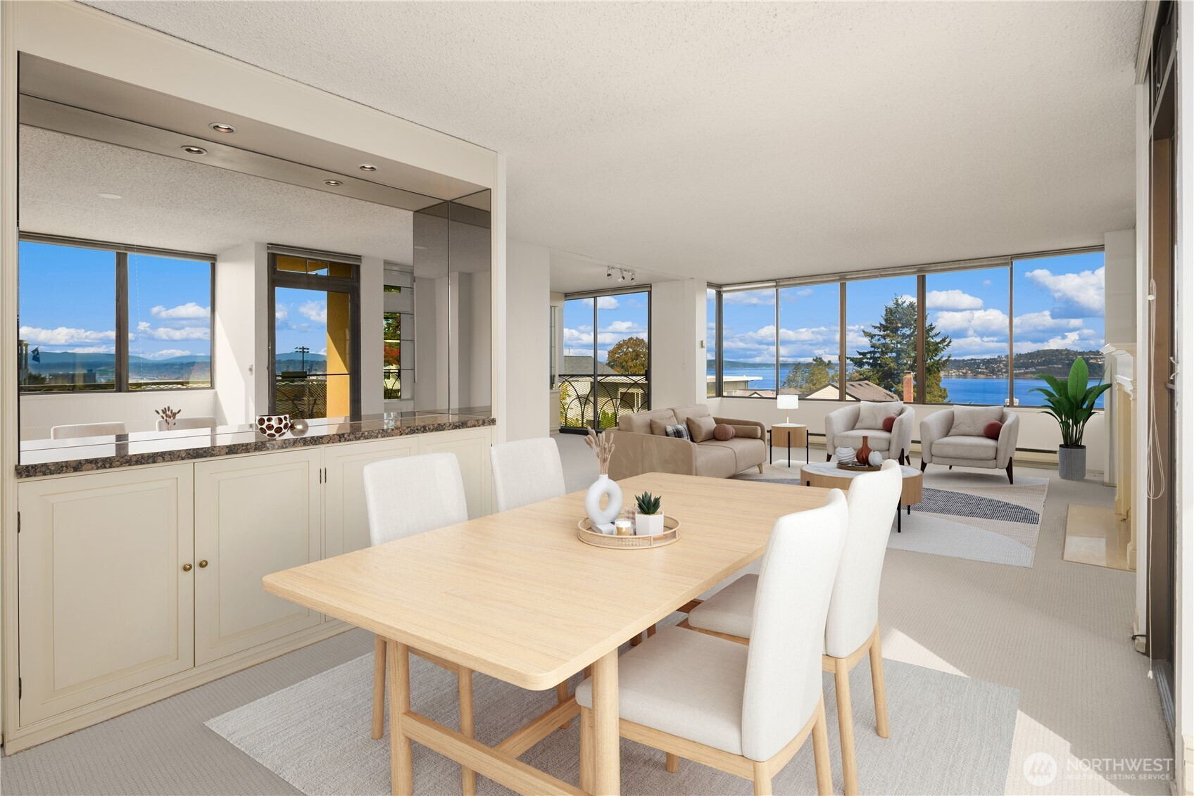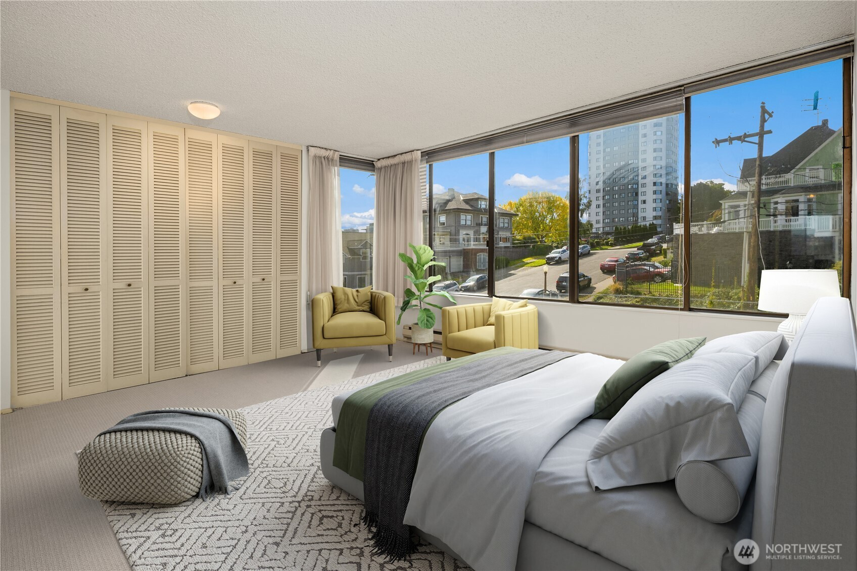 First time on the market! This rare Plaza Four residence spans the entire S side of the building, offering privacy w/only one other unit on the floor. Featuring 2BD+DEN /2BA showcasing sweeping 180° views from Vashon to Mt Rainier through walls of windows & 3 private balconies. The flexible layout includes a spacious living/dining w/fireplace, primary w/walk-in closet, & large 2nd BD/versatile den. Freshly painted w/new carpet, it’s move-in ready yet primed for a remodel to reflect your style. Amenities incl secure access w/onsite manager, clubroom, exercise, sauna, common patio, guest parking, plus a convenient pull-through drive. Ideally located in the walkable Stadium District near shops, dining, hospitals, transit, & light rail.
