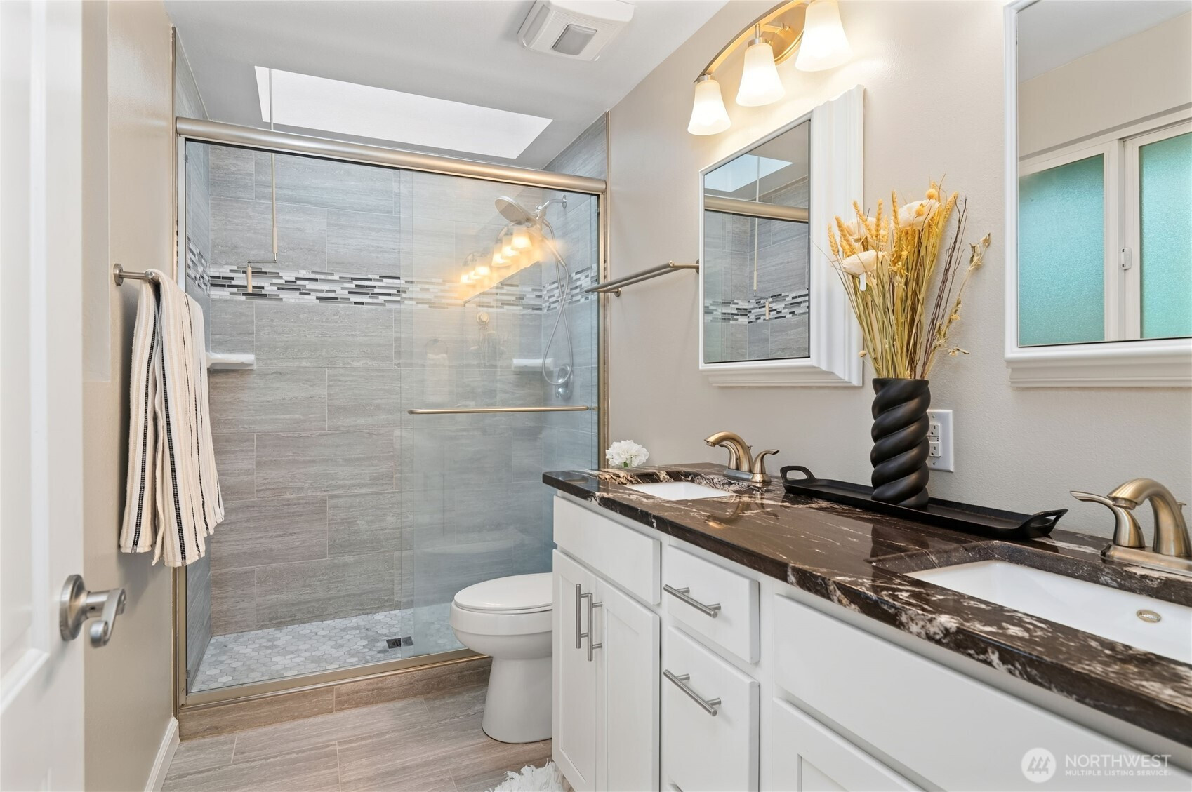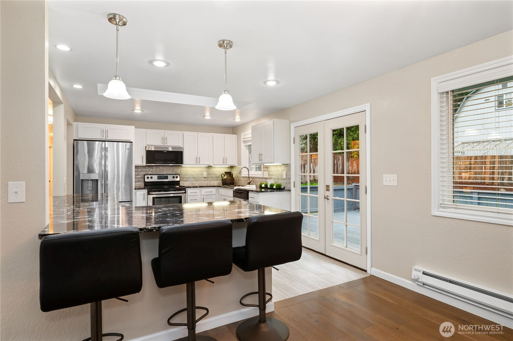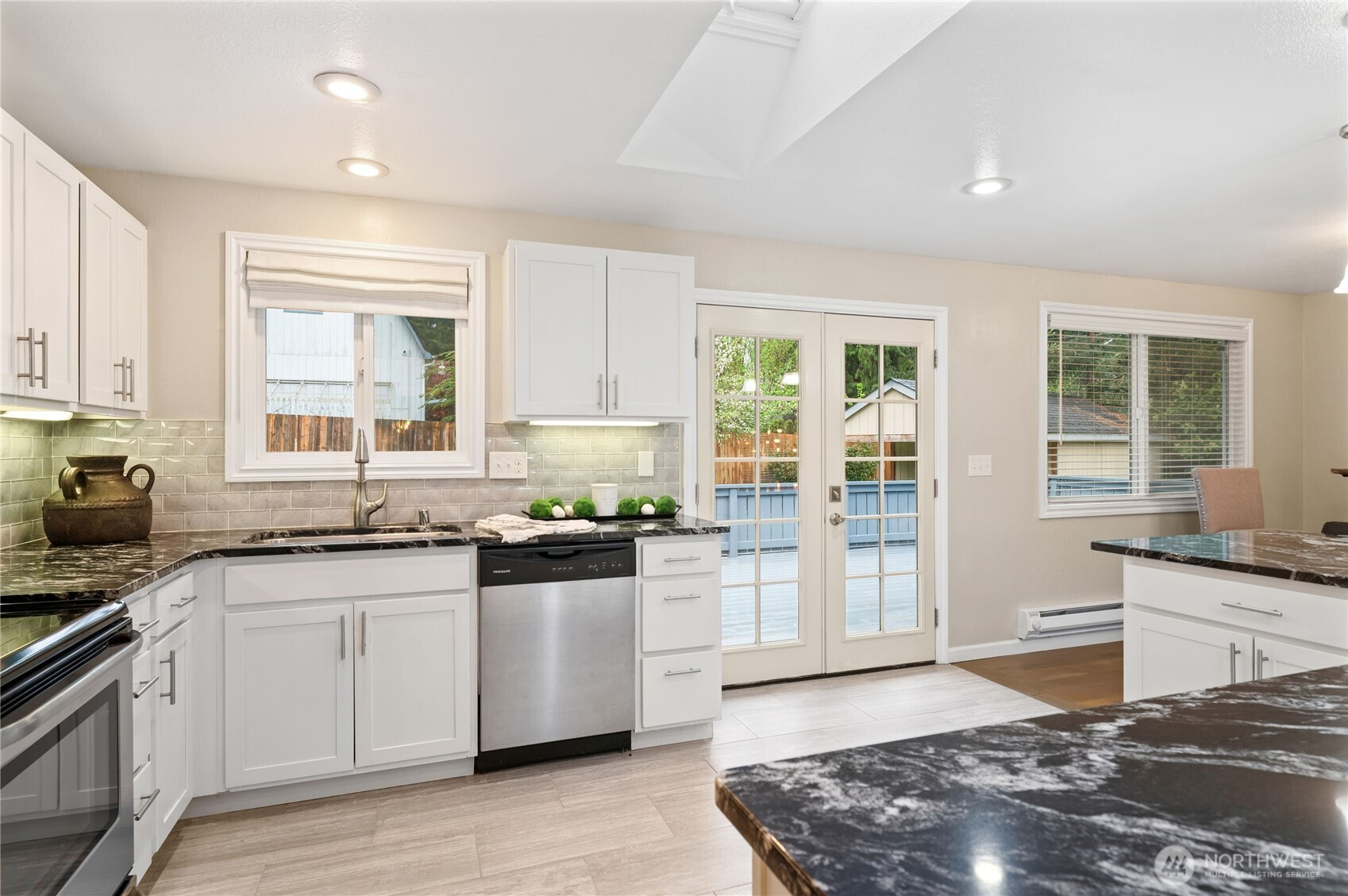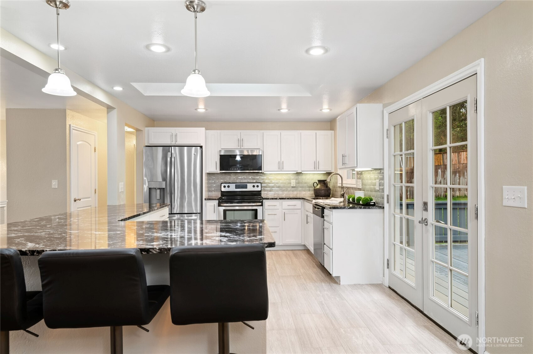 Modern split entry 3-bedroom, 3 full bath home is truly one of a kind located in desirable city of Edgewood. This home offers 1,950 square feet of living space and sits on a fenced lot larger than a quarter acre, providing ample room for gardening. The upper level boasts a stunningly renovated open-concept kitchen equipped with stainless steel appliances and striking granite countertops. This kitchen seamlessly connects both the living and dining areas. French doors in the kitchen lead out to an expansive wraparound deck, perfect for hosting barbeques and entertaining friends. The primary bedroom includes a private ensuite bathroom with a granite double vanity. The downstairs features a large family room, bonus room/den, laundry and a full bath. Upgrades include garage flooring, primary bath skylight, 30-year roof (’20) water heater and mini splits upstairs and down. This property's location offers convenient access to schools, Edgewood's shopping amenities, and is ideally situated near major highways I-5 and 167.