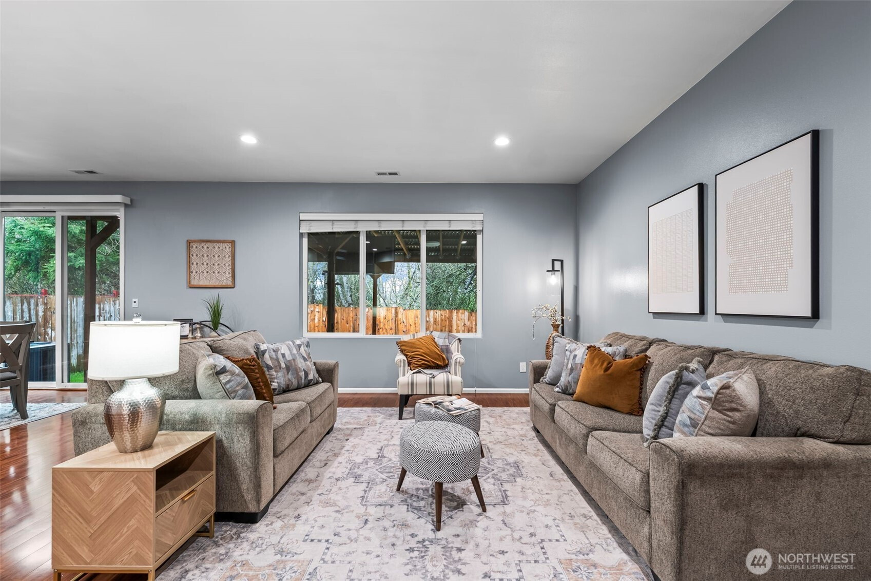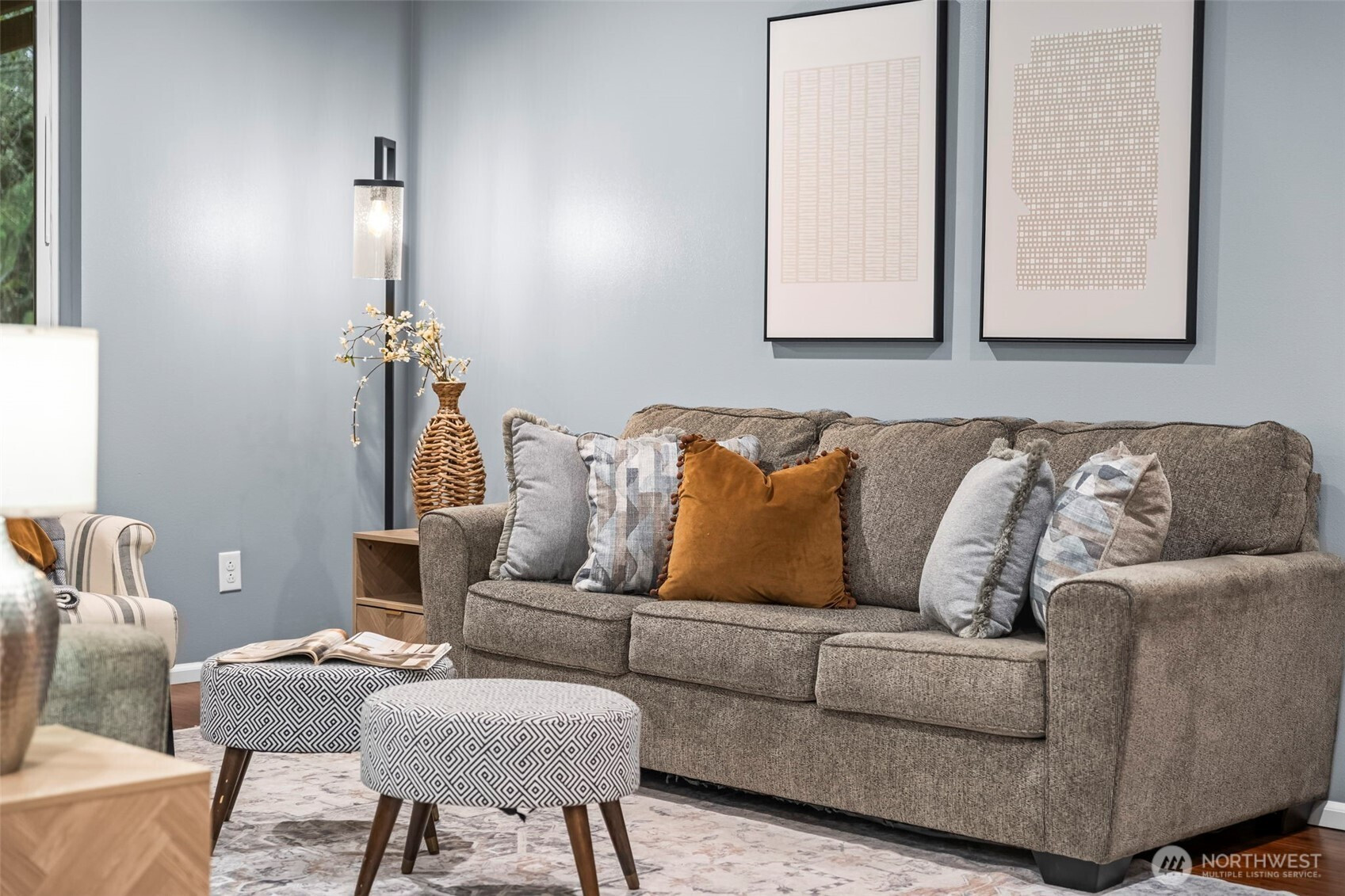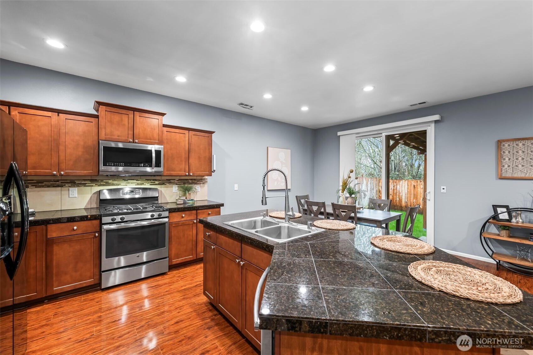 Set on a well maintained lot that backs up to a greenbelt. This home offers charming curb appeal with its classic Craftsman inspired exterior. Inside you’re greeted by a warm and inviting main living space featuring hardwood flooring, high ceilings and a cozy gas fireplace. The open concept layout is ideal for both everyday living, with natural light pouring in to create a bright and airy feel throughout. The kitchen flows seamlessly into the living and dining areas, allowing you to stay connected whether you're cooking, entertaining, or simply enjoying a quiet night at home. Upstairs you’ll find spacious bedrooms, including a large primary suite complete with dual sinks and a relaxing soaking tub. Additional bedrooms offer flexibility for guests, a home office, or evolving lifestyle needs. Outside the attached two-car garage and driveway provide ample parking and storage. Enjoy the ennery efficiency of the tankless water heater. The surrounding greenery adds to the home’s sense of privacy and tranquility--enjoy quiet evenings on your covered back porch. Conveniently located, this home offers easy access to everyday amenities, just minutes to Tacoma Mall, nearby expansive paved trail systems perfect for walking, running or biking, and a short drive to the charm of downtown Puyallup. Perfect for those who value a welcoming atmosphere, low-maintenance living and a place that truly feels like home.
