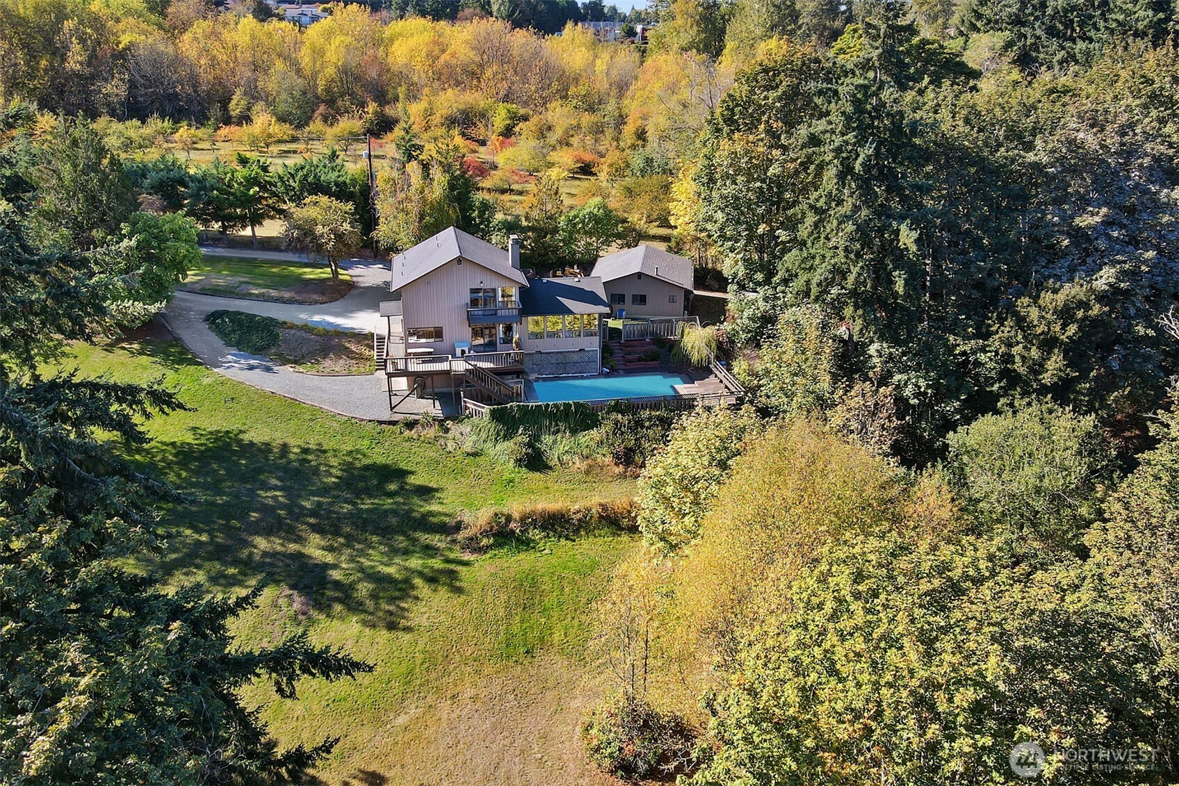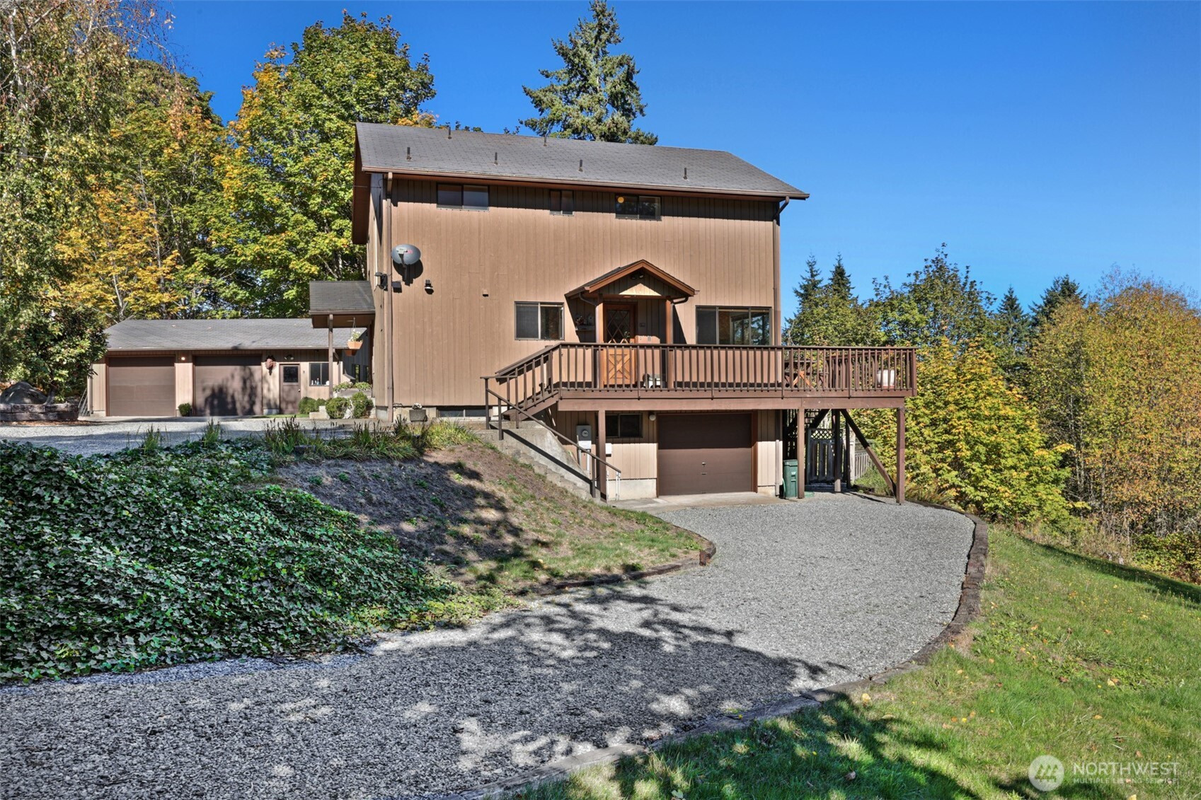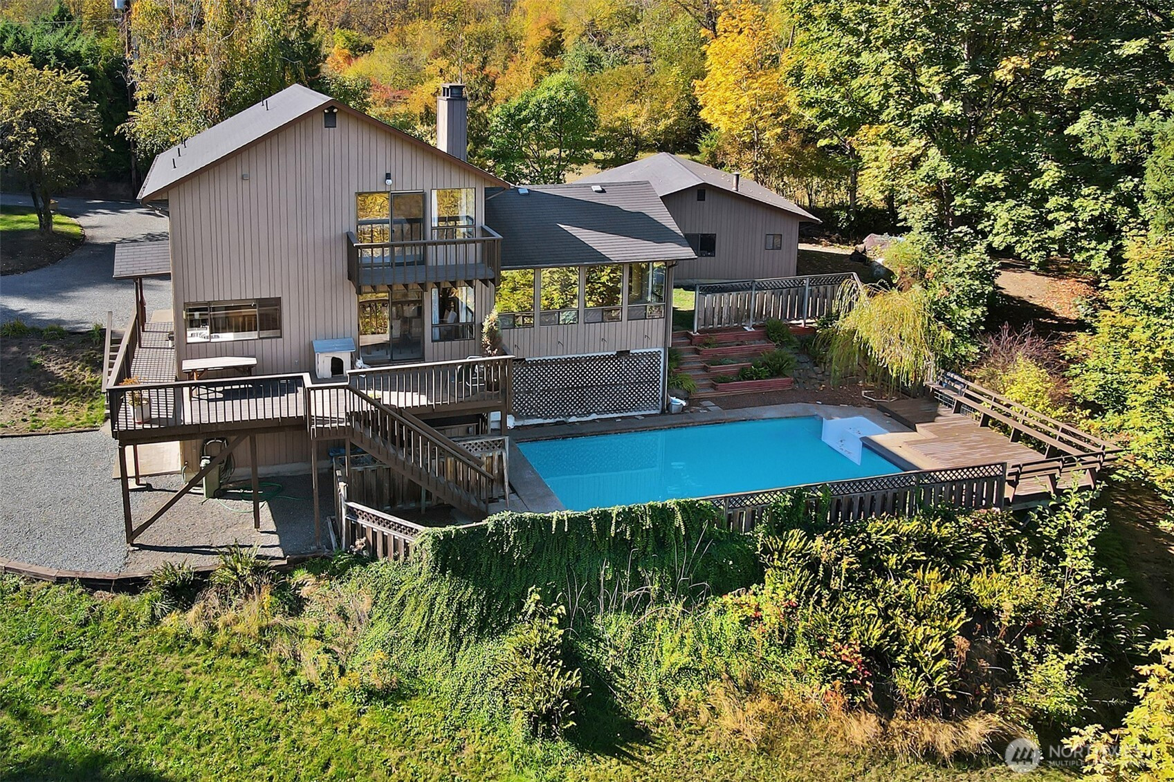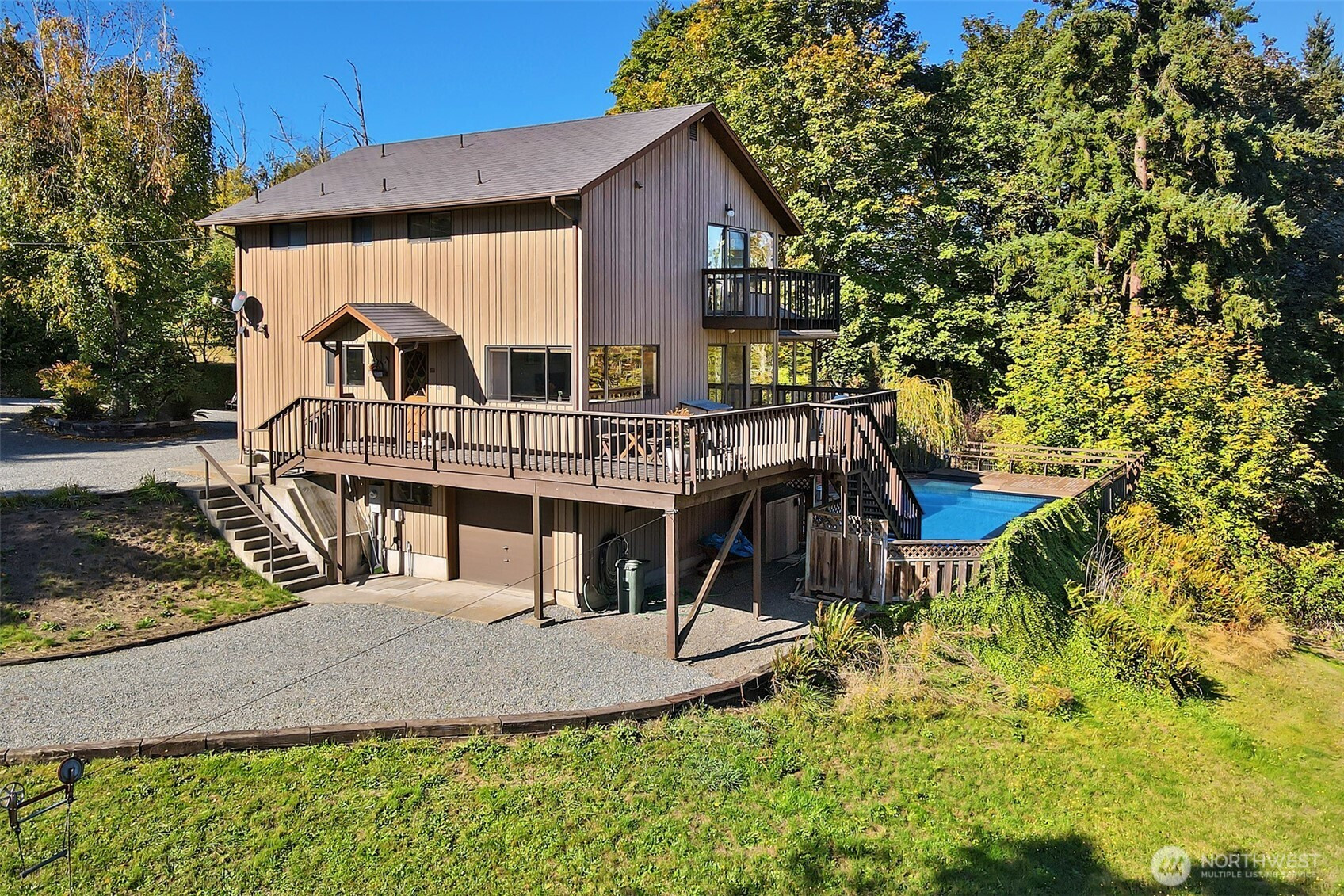 This meticulously cared for custom home was built on 5+ acres of lush landscape, offering privacy & the opportunity to create a dream estate. Natural light spills into the living spaces through large windows along the east side of the home, looking over the seasonally changing trees & valley view. Sliding glass doors lead to a deck just off the dining rm & open concept kitchen w/unique rounded island. Plenty of counter/cabinet space, counter to ceiling windows, large pantry, laundry w/ bthrm on main flr. Upstairs has the spacious primary bdrm w/ a closet, bthrm & deck w/ sunrise views, along w/ a 2nd bdrm & bthrm. 3rd bdrm on lower level. Attached lower garage & detached 2-car garage. Enjoy the pool & pool-deck for those hot summer days!