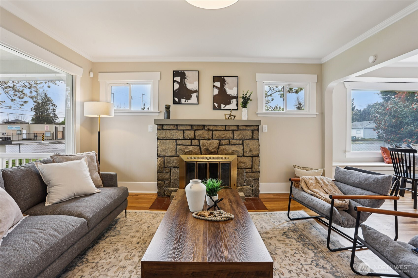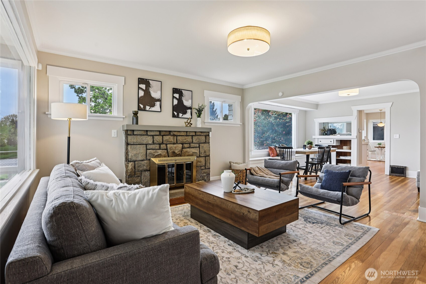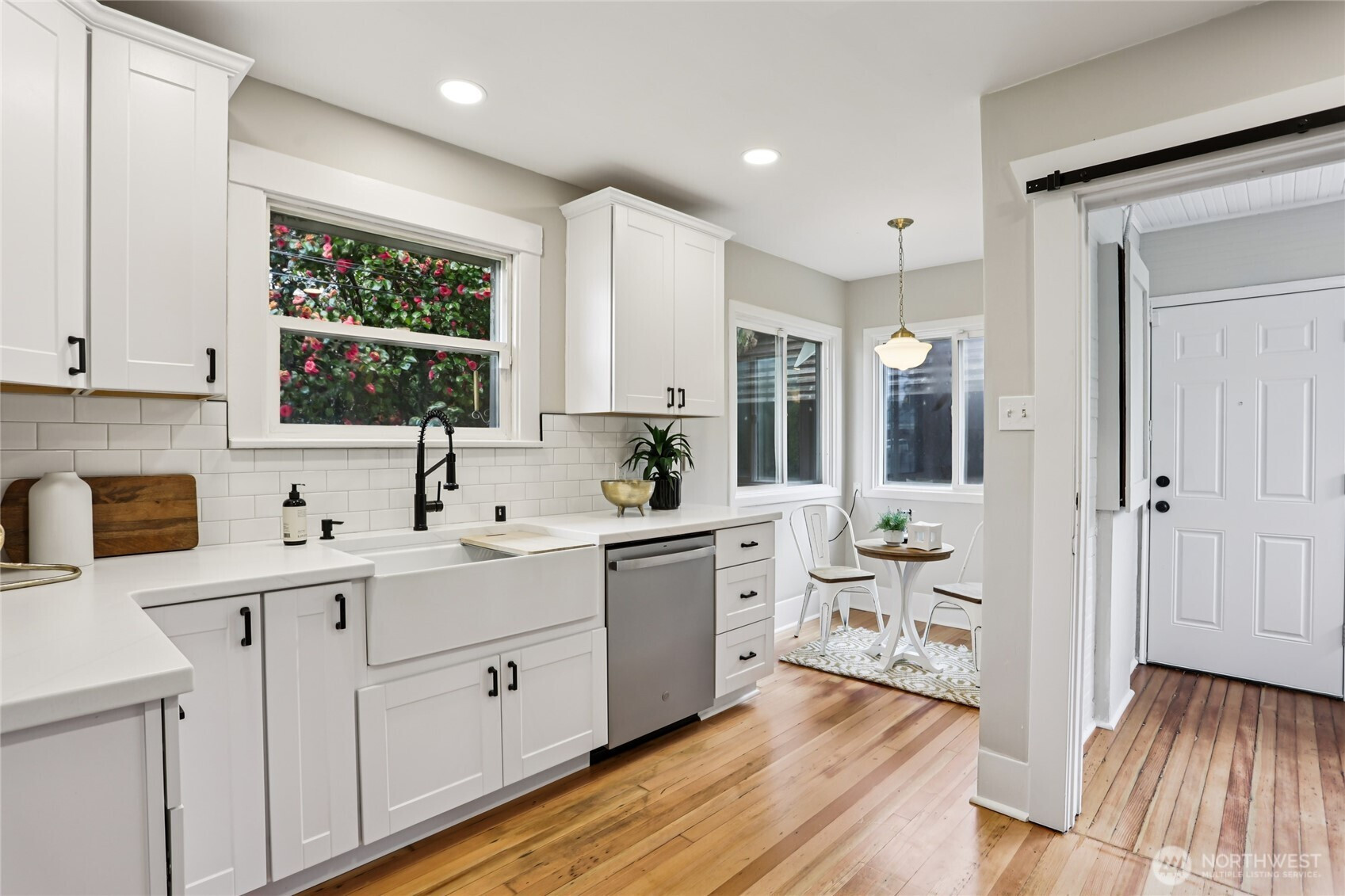 Fall in love the moment you arrive — this beautifully restored 1922 Craftsman blends timeless charm with thoughtful modern updates. Positioned on a desirable corner lot, a spacious covered front porch sets the tone: warmth, character, and everyday livability from the start. Inside, refinished original hardwood floors and natural millwork carry a century of character through a light-filled layout. The redesigned kitchen is the heart of the home — new cabinetry, counter tops, farmhouse sink, and a full suite of new appliances including a range with convection and air-fry capabilities. A sunlit kitchen nook is perfect for quiet mornings or evening conversation. A stylish barn door opens to a utility room with brand-new washer and dryer — both included. The updated bath features custom tile and curated finishes. A comprehensive alarm system adds peace of mind throughout. Upstairs, a charming attic retreat rich with original 1922 character awaits — warm wood-planked walls and ceilings create an inviting space ideal as a bedroom, art studio, lounge, or home office. Outside, a fully fenced yard and detached two-car garage offer exceptional flexibility: one enclosed bay and a second partially open bay perfect as a covered lounge, workspace, or entertaining area. A commuter's dream — just a hop from I-5 and minutes to JBLM. Convenient to parks, dining, and everything Tacoma has to offer. Move-in ready and a rare opportunity to own a beautifully restored piece of Tacoma history.