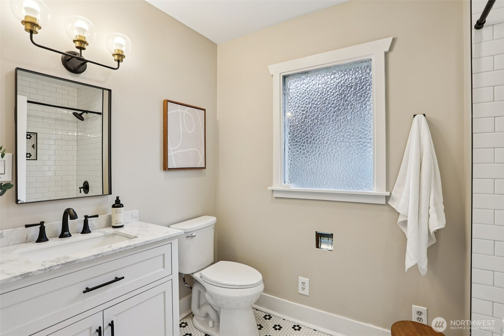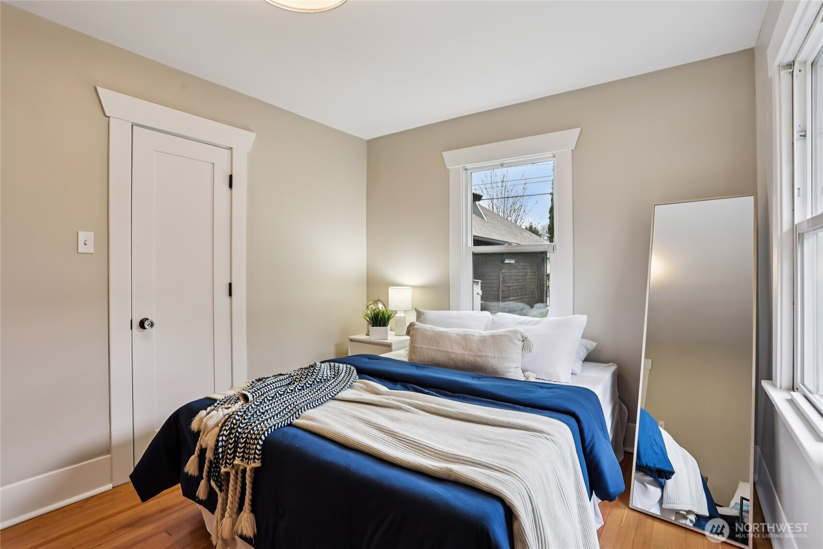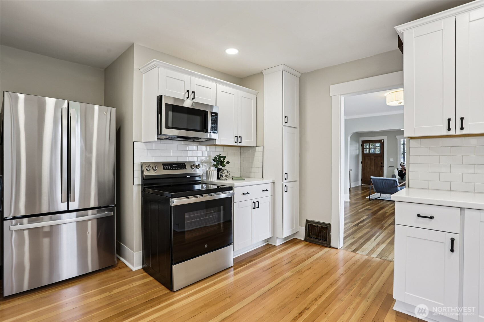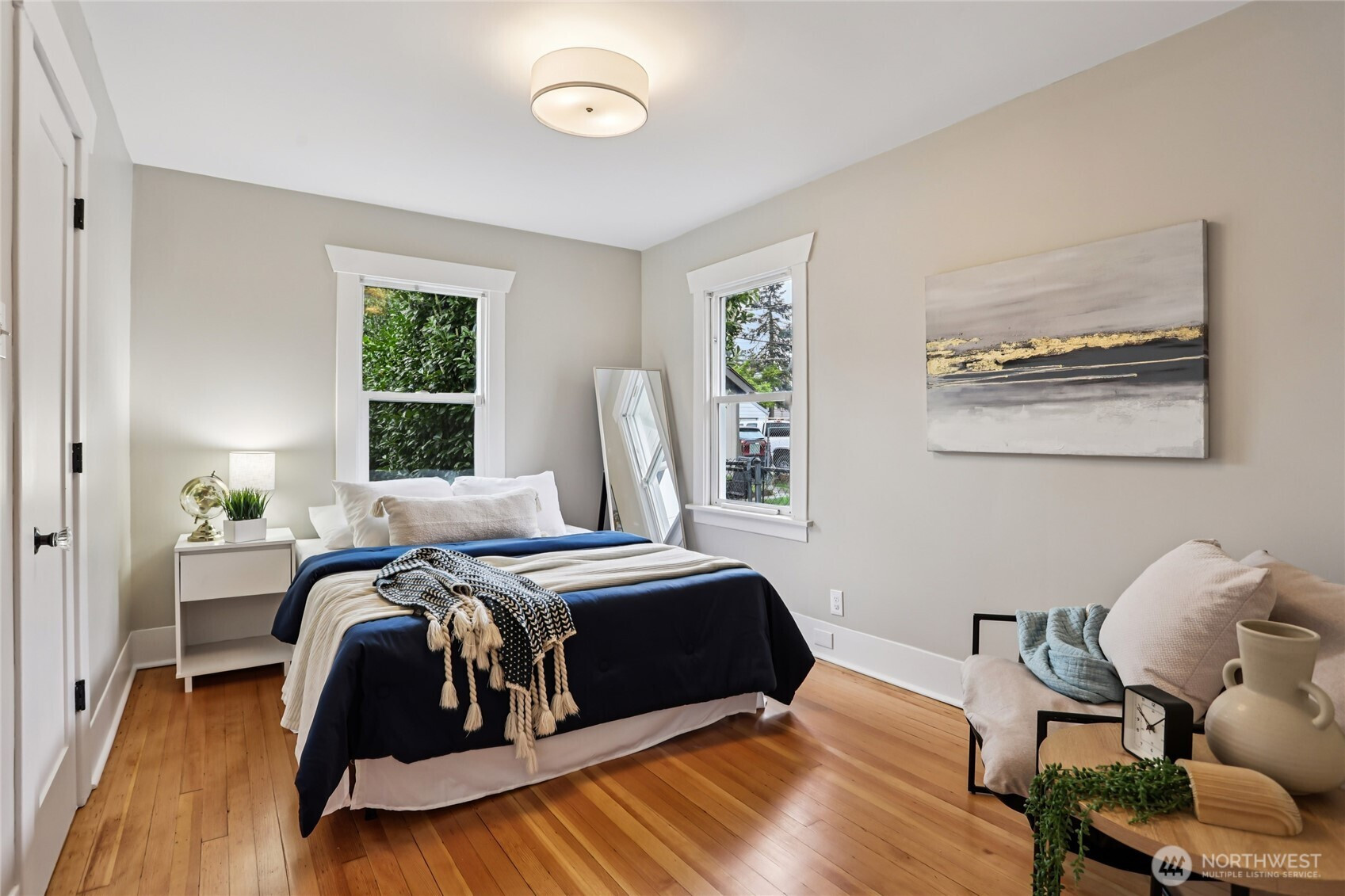 Fall in love the moment you arrive — this beautifully restored 1922 Craftsman blends timeless charm with thoughtful modern updates. Positioned on a desirable corner lot, a spacious covered front porch sets the tone: warmth, character, and everyday livability from the start. Inside, refinished original hardwood floors and natural millwork carry a century of character through a light-filled layout. The redesigned kitchen is the heart of the home — new cabinetry, counter tops, farmhouse sink, and a full suite of new appliances including a range with convection and air-fry capabilities. A sunlit kitchen nook is perfect for quiet mornings or evening conversation. A stylish barn door opens to a utility room with brand-new washer and dryer — both included. The updated bath features custom tile and curated finishes. A comprehensive alarm system adds peace of mind throughout. Upstairs, a charming attic retreat rich with original 1922 character awaits — warm wood-planked walls and ceilings create an inviting space ideal as a bedroom, art studio, lounge, or home office. Outside, a fully fenced yard and detached two-car garage offer exceptional flexibility: one enclosed bay and a second partially open bay perfect as a covered lounge, workspace, or entertaining area. A commuter's dream — just a hop from I-5 and minutes to JBLM. Convenient to parks, dining, and everything Tacoma has to offer. Move-in ready and a rare opportunity to own a beautifully restored piece of Tacoma history.