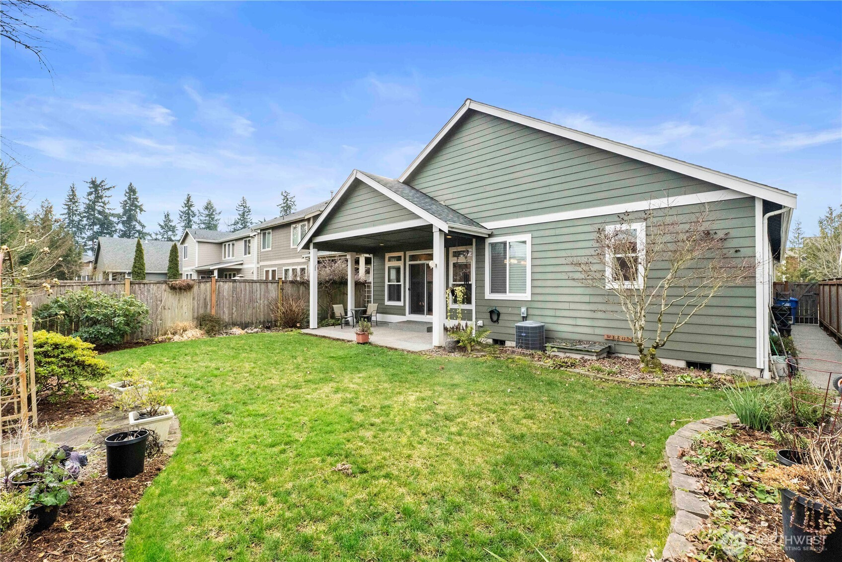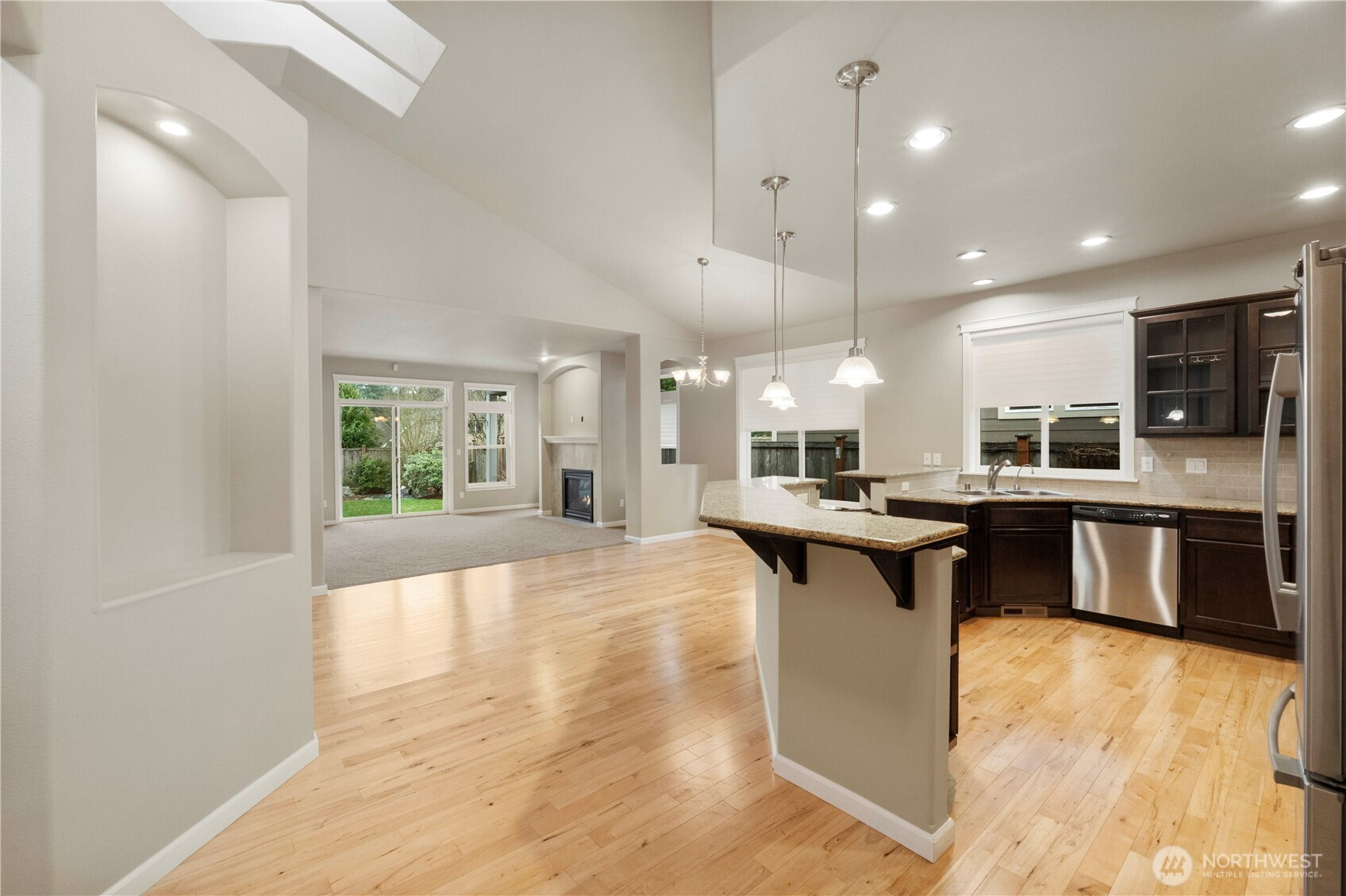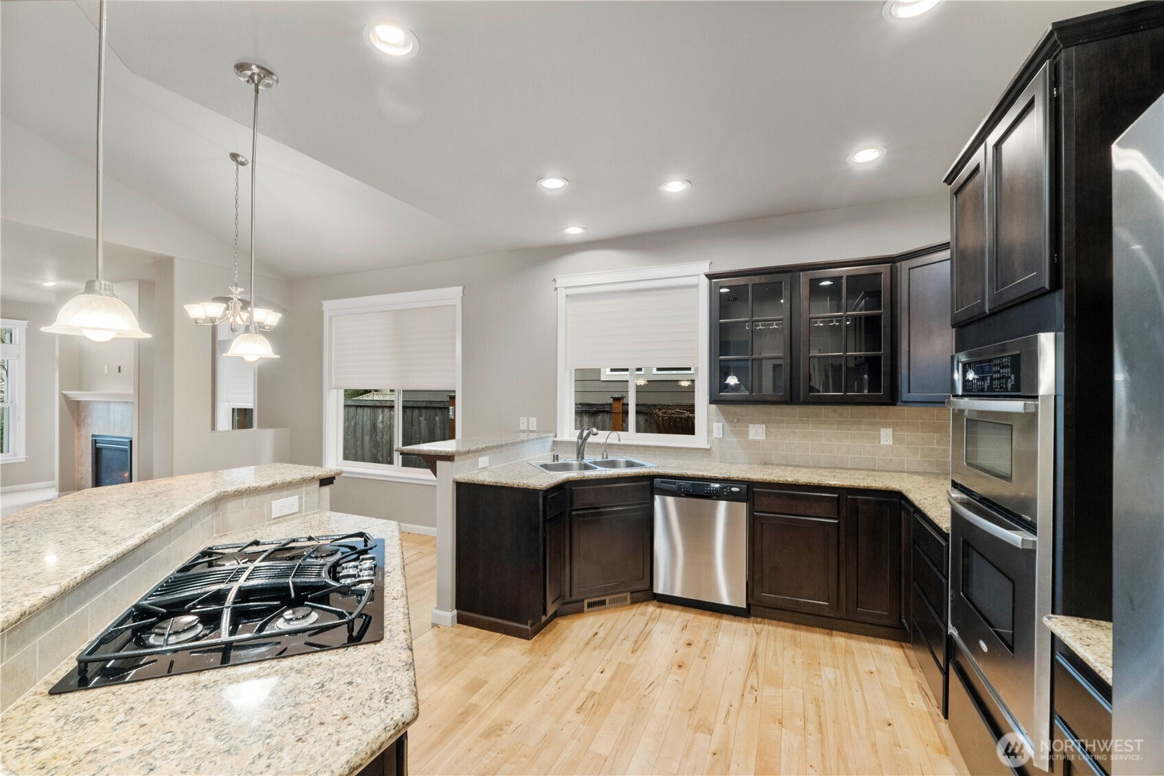 Elegant and thoughtfully designed, this spacious 3-bedroom, 2-bath rambler offers refined single-level living with exceptional architectural detail throughout. The chef’s kitchen is beautifully appointed with rich granite countertops, a large island with breakfast bar, pantry, cabinetry with glass-panel accents, and sleek stainless steel appliances—all flowing seamlessly into the dining area for effortless entertaining.The home is loaded with high-end upgrades, including hardwood floors through the entry, kitchen, and dining spaces, a cozy gas fireplace with designer tile surround, stylish pendant lighting and wall sconces, and an inviting open layout filled with natural light. Retreat to the luxurious primary suite featuring a spa-inspired five-piece bath with tile flooring and a generous walk-in closet.Covered back porch for summer evening entertaining will be sure to impress your friends. Every detail of this well-crafted rambler reflects comfort, quality, and timeless style—an ideal blend of luxury and livability.